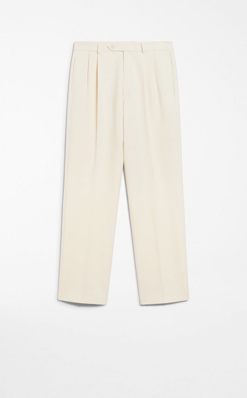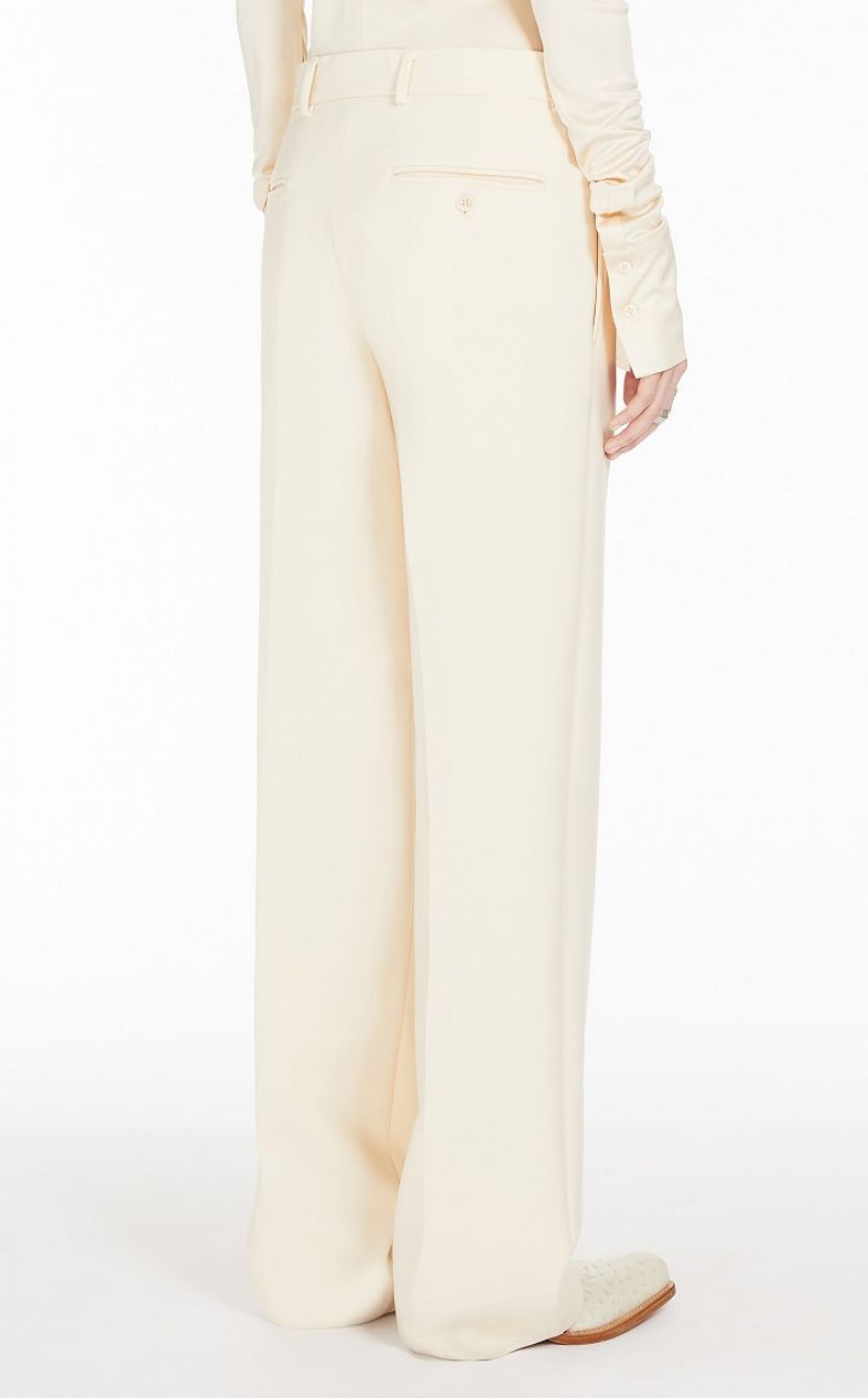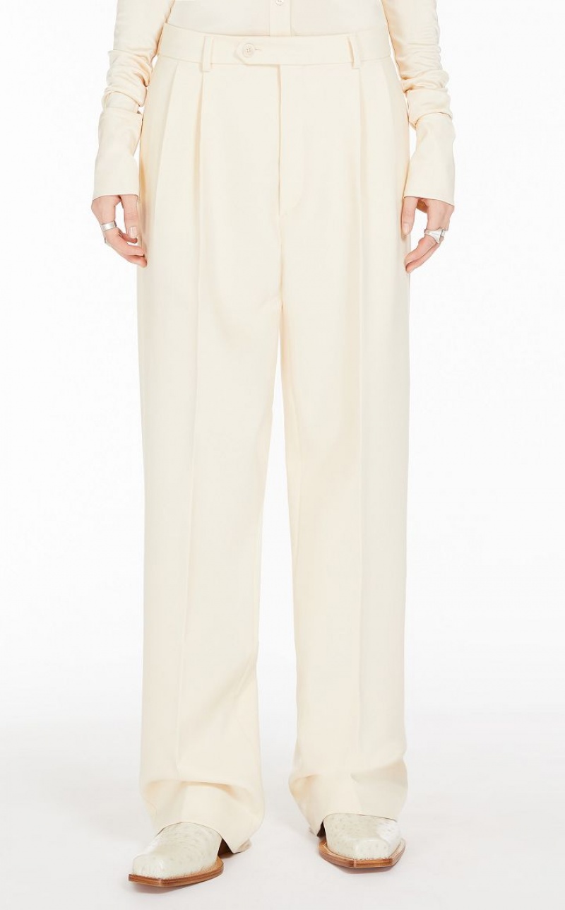 Boyfriend-cut trousers in warm and dense double-faced stretch woollen cloth. The design boasts tailored details, such as the customised internal waistband, asymmetrical tab and button fastening, and the deep pleats that create volume on the top half of the garment. The fit tapers at the hem and is set apart by the pressed pleat detail on the front and back. Furthermore, the low-rise model features in-seam side pockets and buttoned welt rear pockets