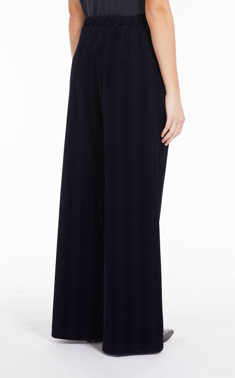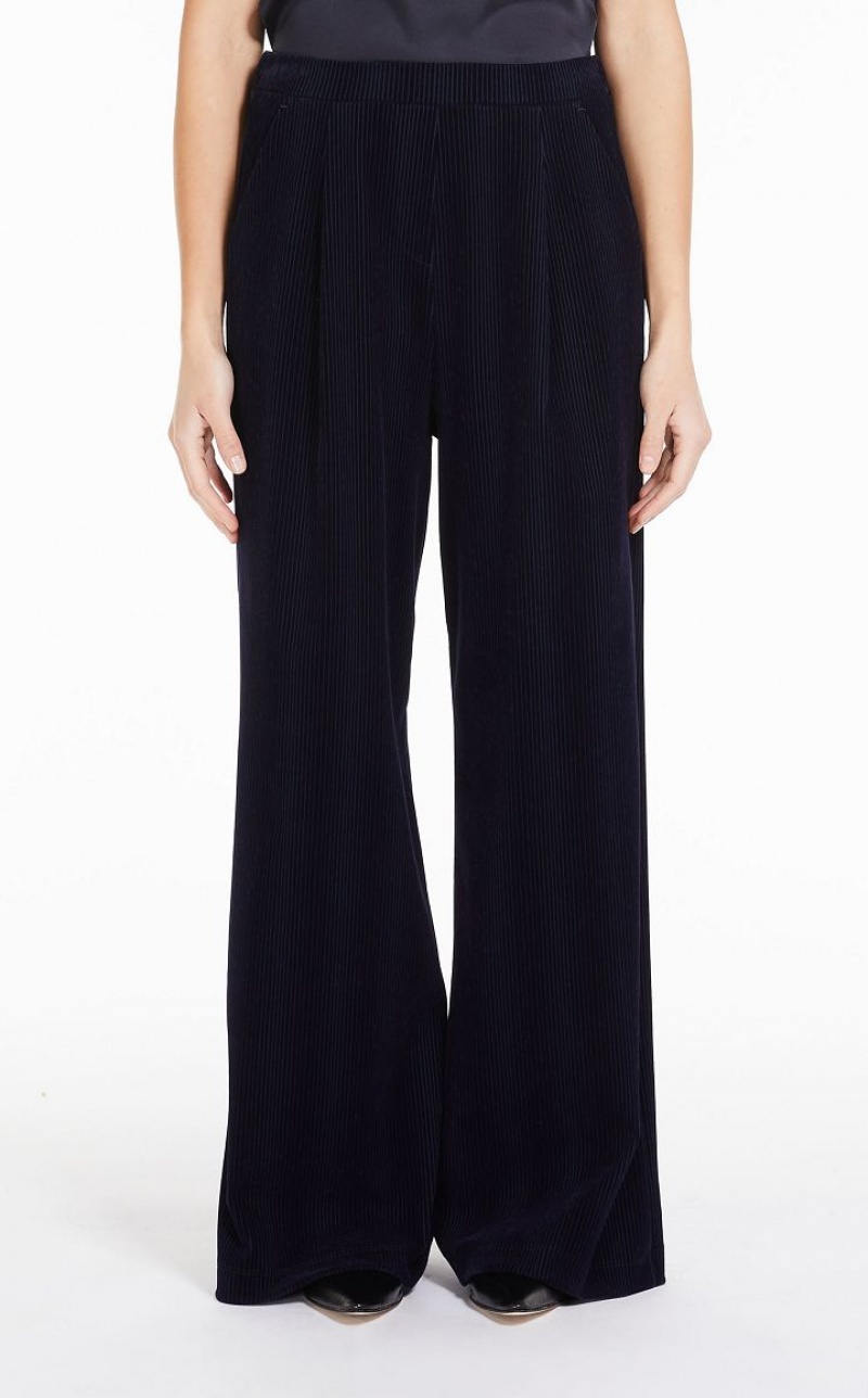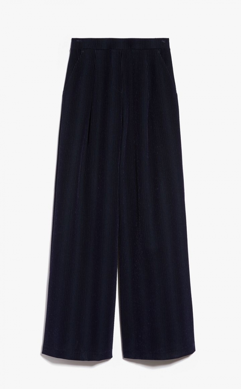Viscose-jersey trousers featuring a flocked finish on a Milan stitch base with a corduroy effect. Wide leg style with elasticated waist, darts and side pockets. Length: 110 cm.