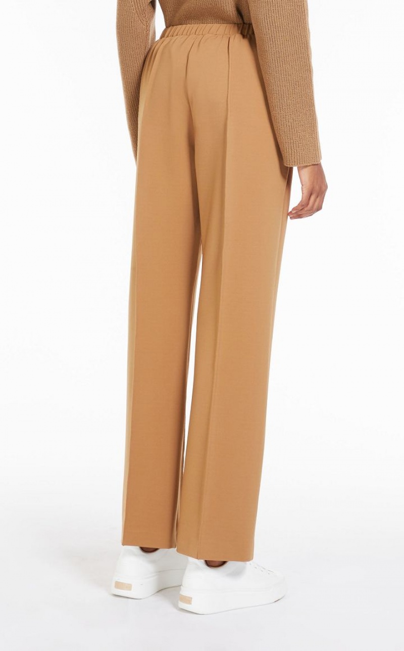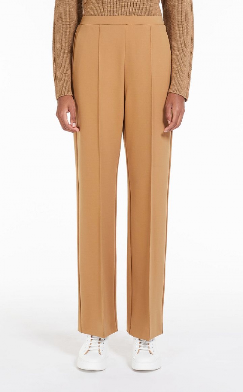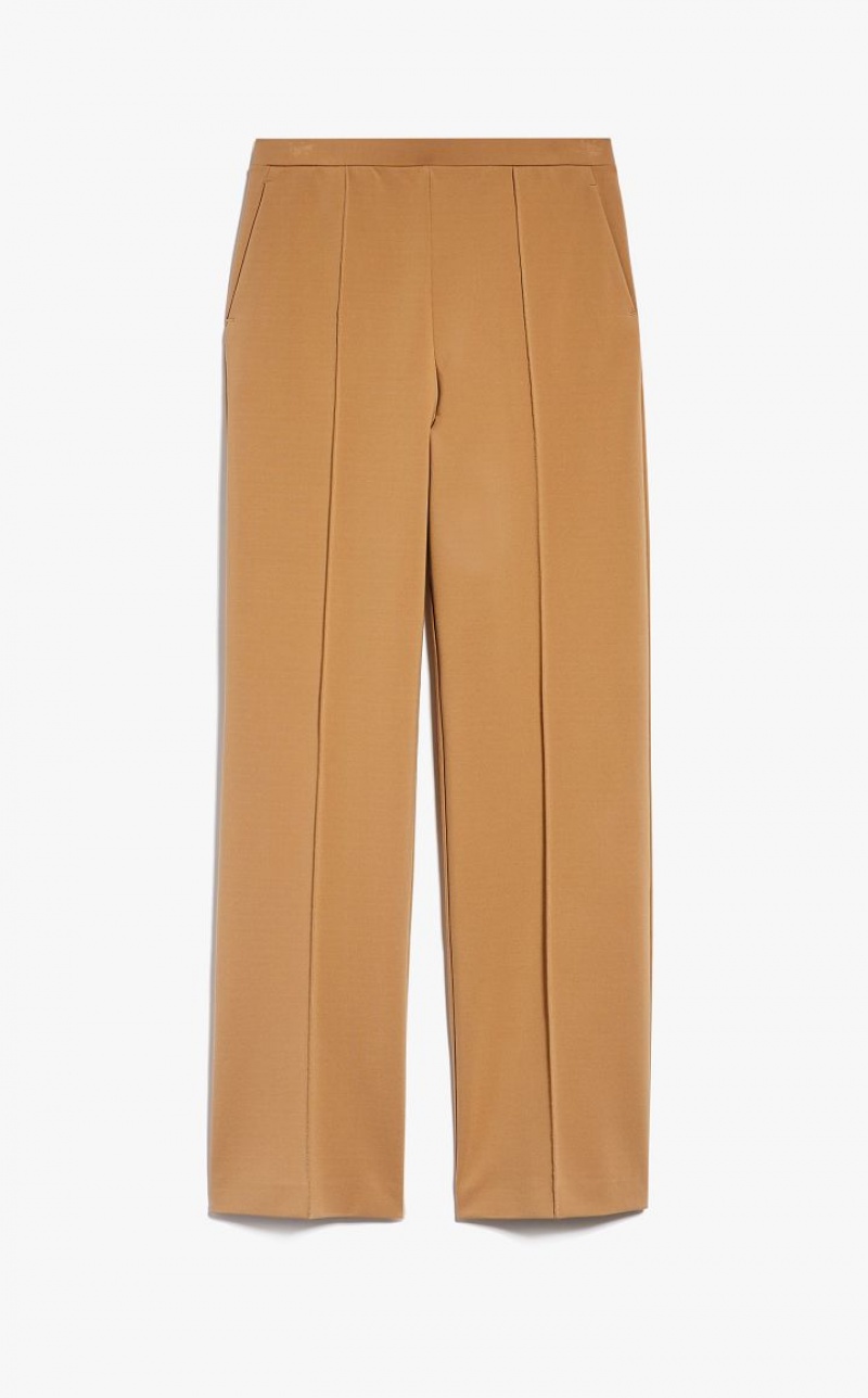Long trousers made of Milan stitch viscose crêpe, with straight line down the leg and front and back trouser crease. Elasticated waist and side pockets. Length: 112 cm.