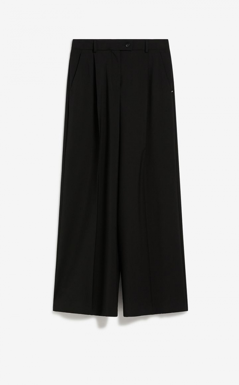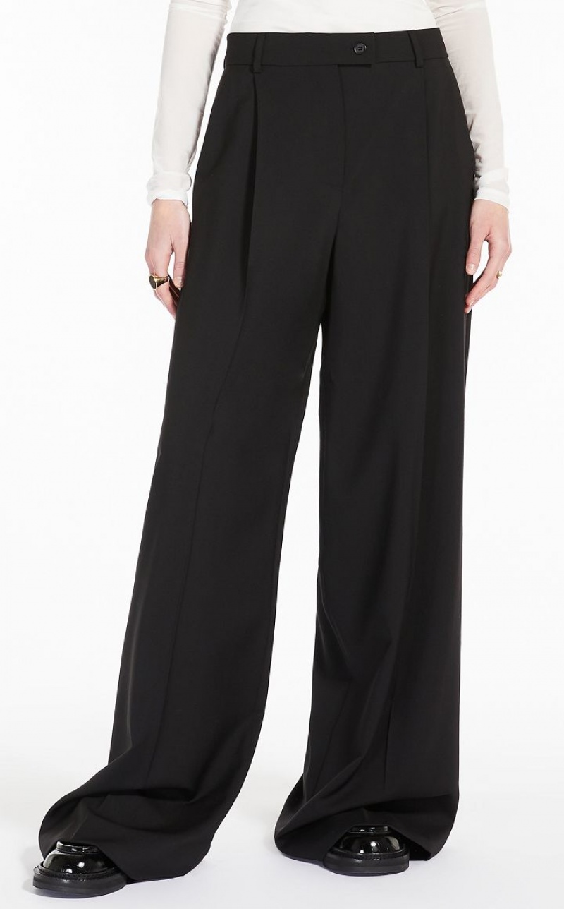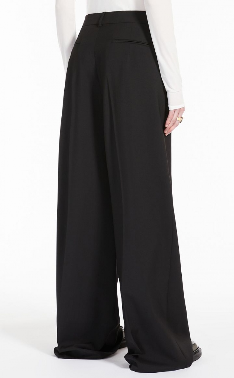 Oversize men’s-style trousers, made of natural stretch pure-wool plain-woven fabric. The garment features a low waist, slanted side pockets, back welt pockets, trouser pleats on the leg front and back and volume emphasised by pleats at the waist. The waistband has button and loops and is defined by its internal branding.