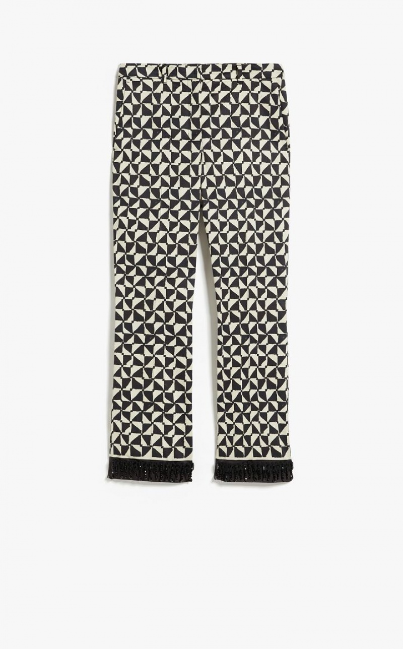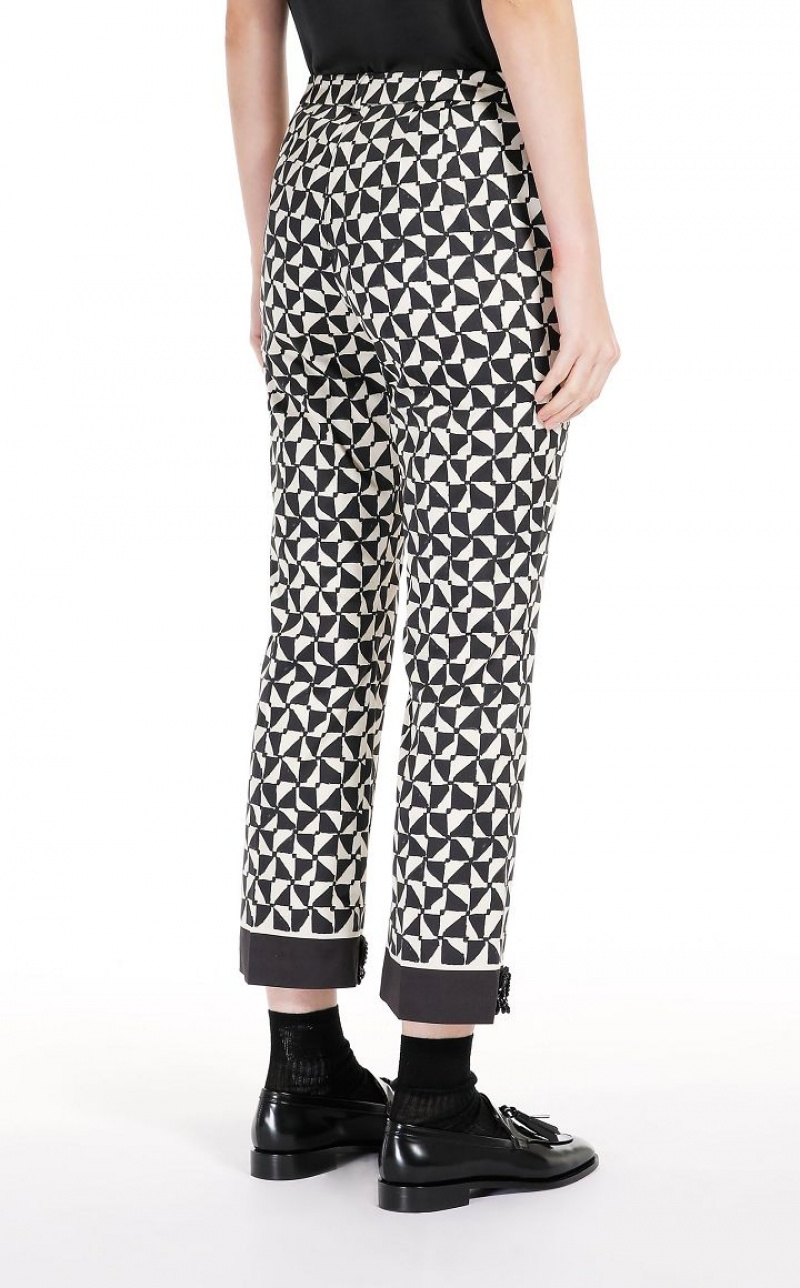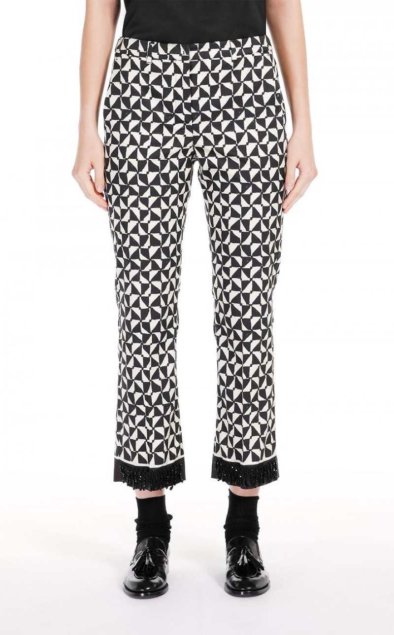 Trousers in printed stretch cotton satin fabric featuring a contrasting band at the hem, complete with removable black jet-embroidered detail. Pressed pleat on the leg, bias-cut pockets and an extended waist tab, complete with a placket-covered zip and hook-and-bar fastening. Length: 98 cm.