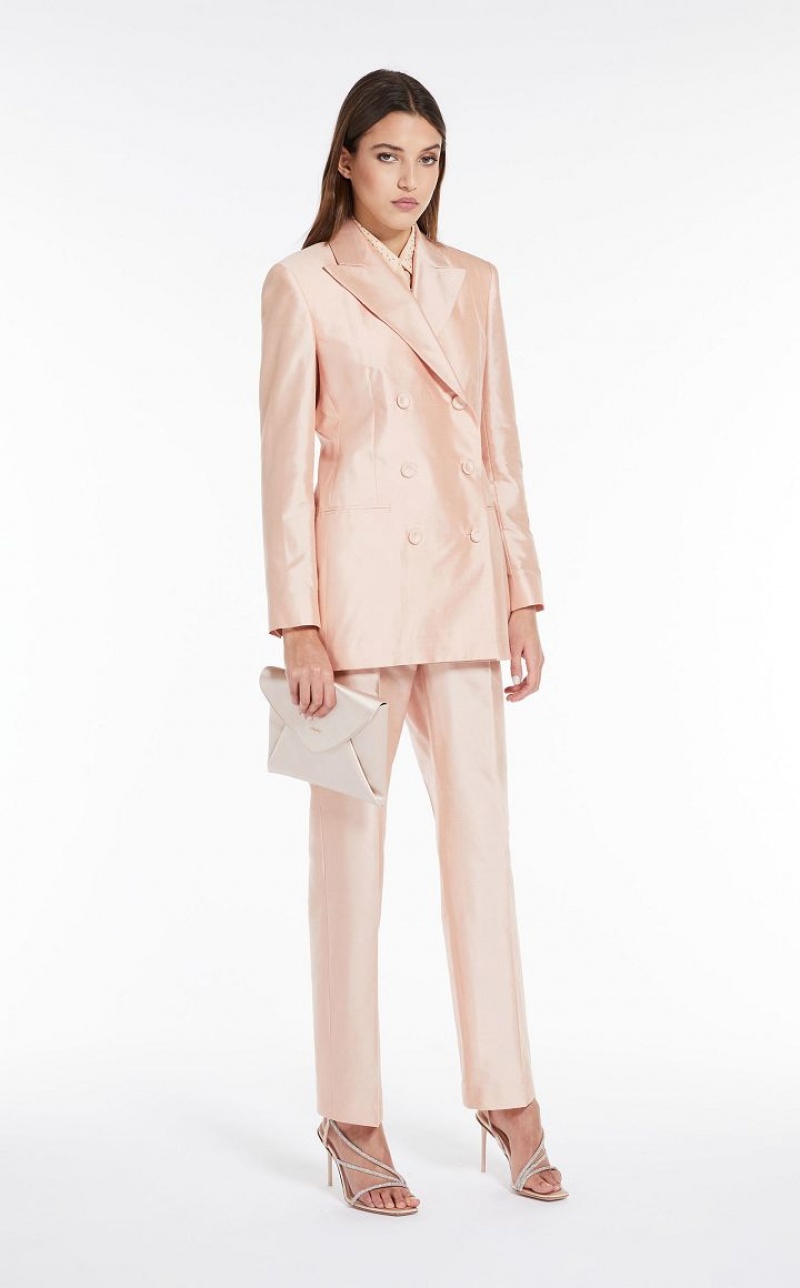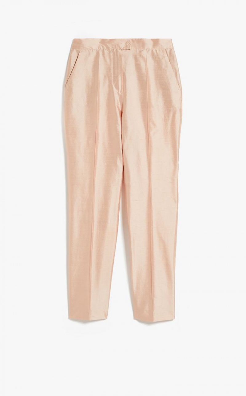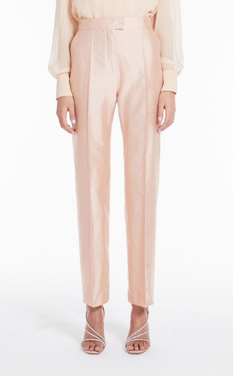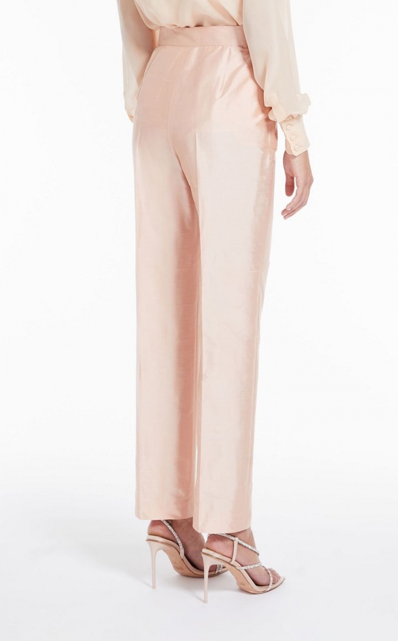 Elegant straight-fit trousers in fine pure silk shantung fabric featuring bias-cut pockets and pressed pleat detail on the leg. Extended waist tab, complete with a placket-covered zip and hook-and-bar fastening. Length: 105 cm.
