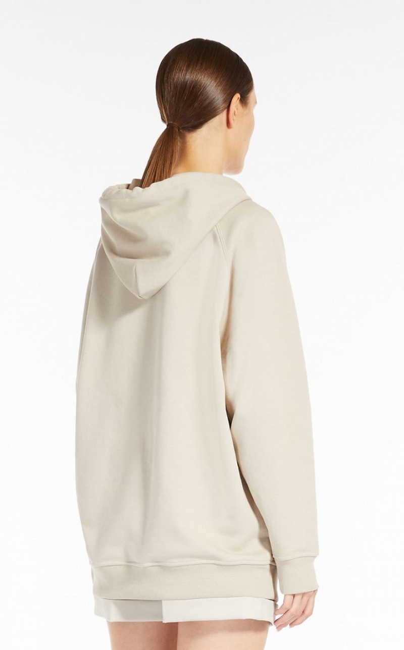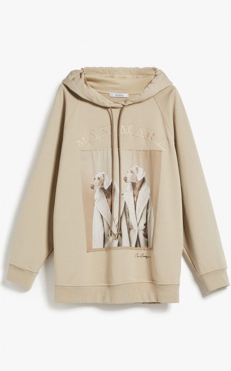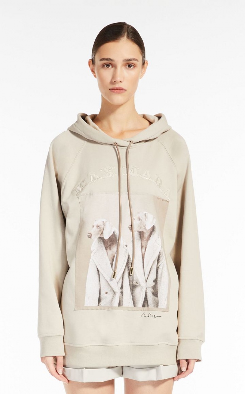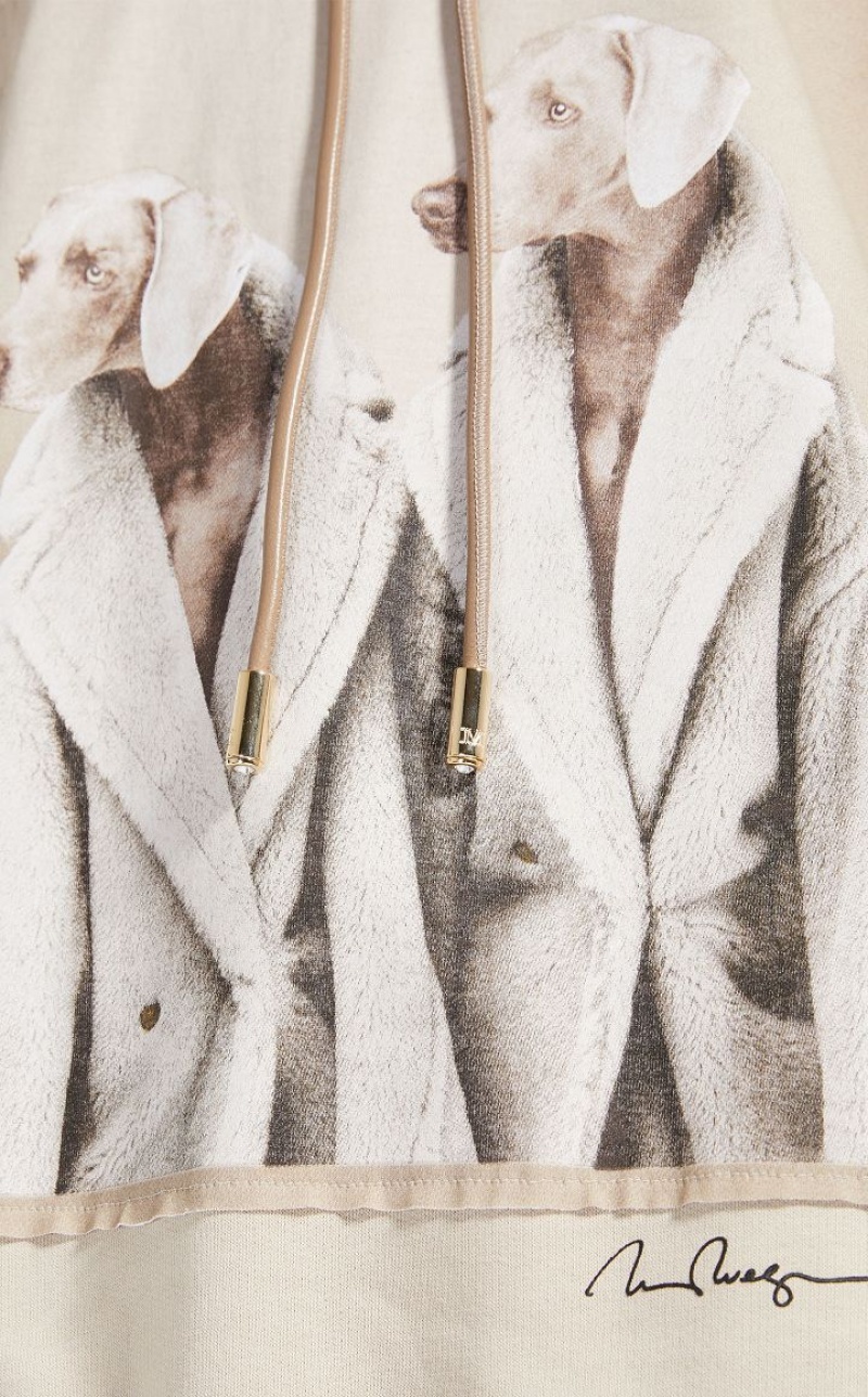 Oversized sweatshirt made of soft pure cotton jersey, with leather drawstring hood, MaxMaraGram drawstring tip and light point. To mark "Teddy Ten", the 10th anniversary of the iconic Max Mara coat, artist William Wegman has contributed a new picture for the "Dogs in Coats" series: the printed image portrays the artist’s Weimaraners wearing the Teddy coat. Finished with long set-in sleeves, and ribbed cuffs and hem. Length: 68 cm.