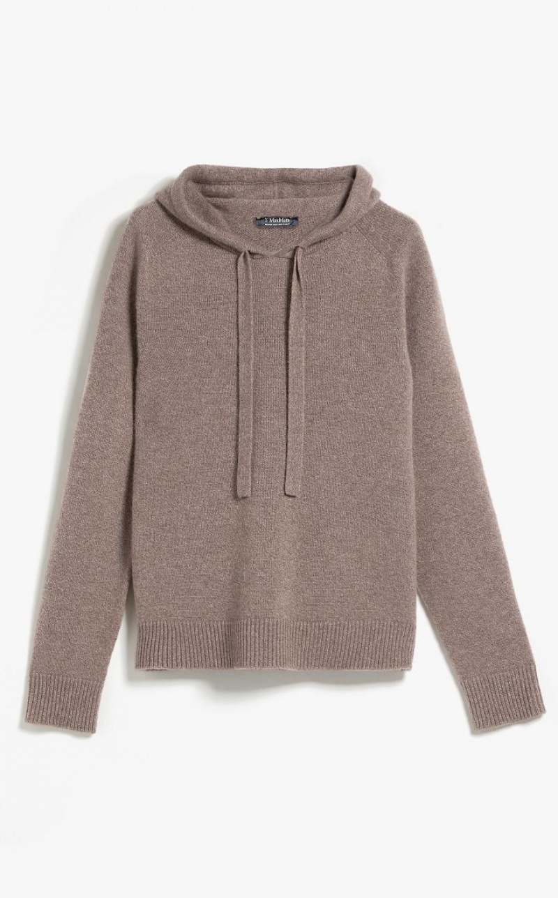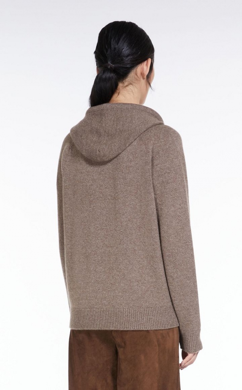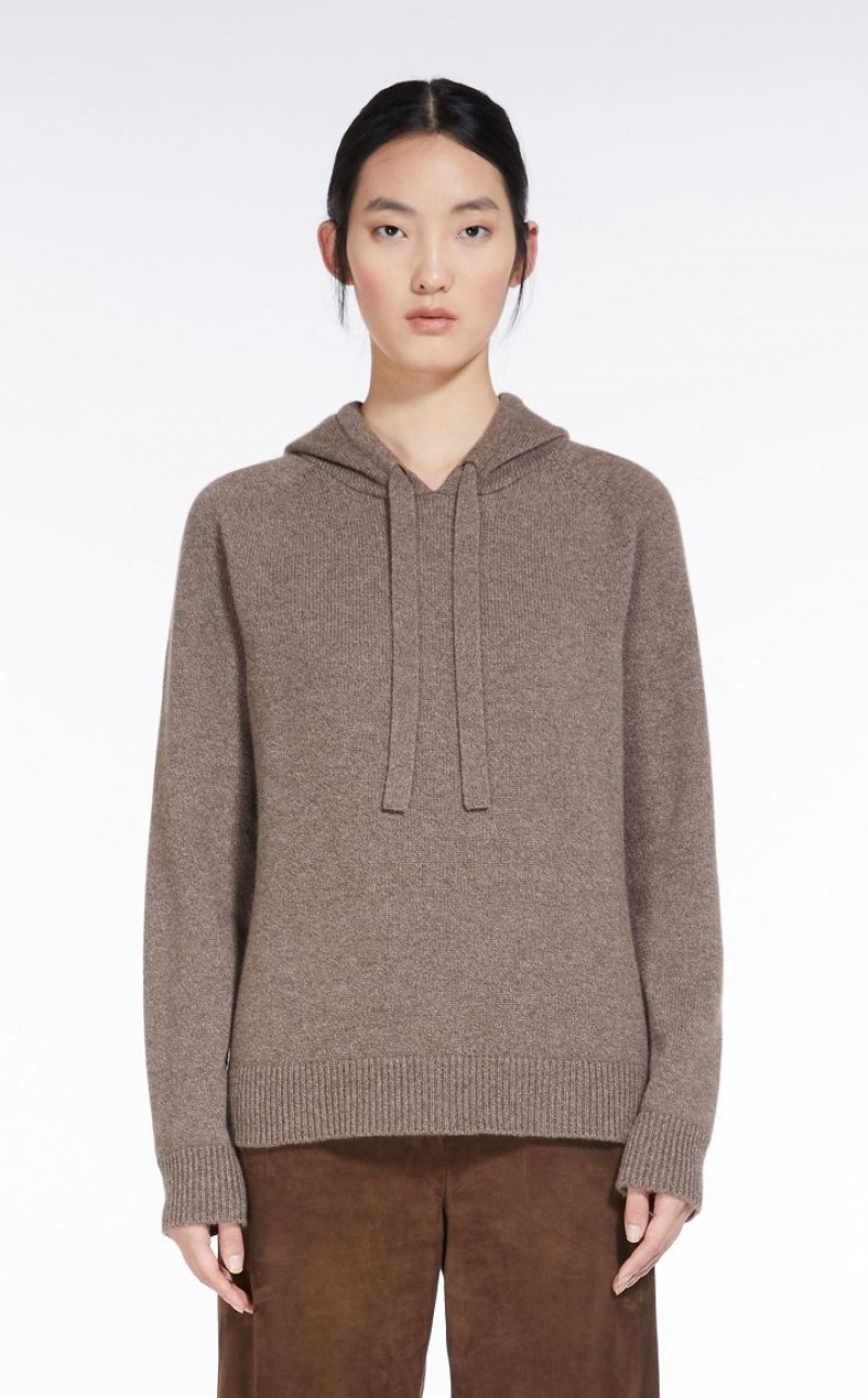 Sweater in fine pure cashmere yarn featuring a drawstring hood and long raglan sleeves. The relaxed, comfort-fit model boasts a rib-knit hem and cuffs. Length: 64 cm.