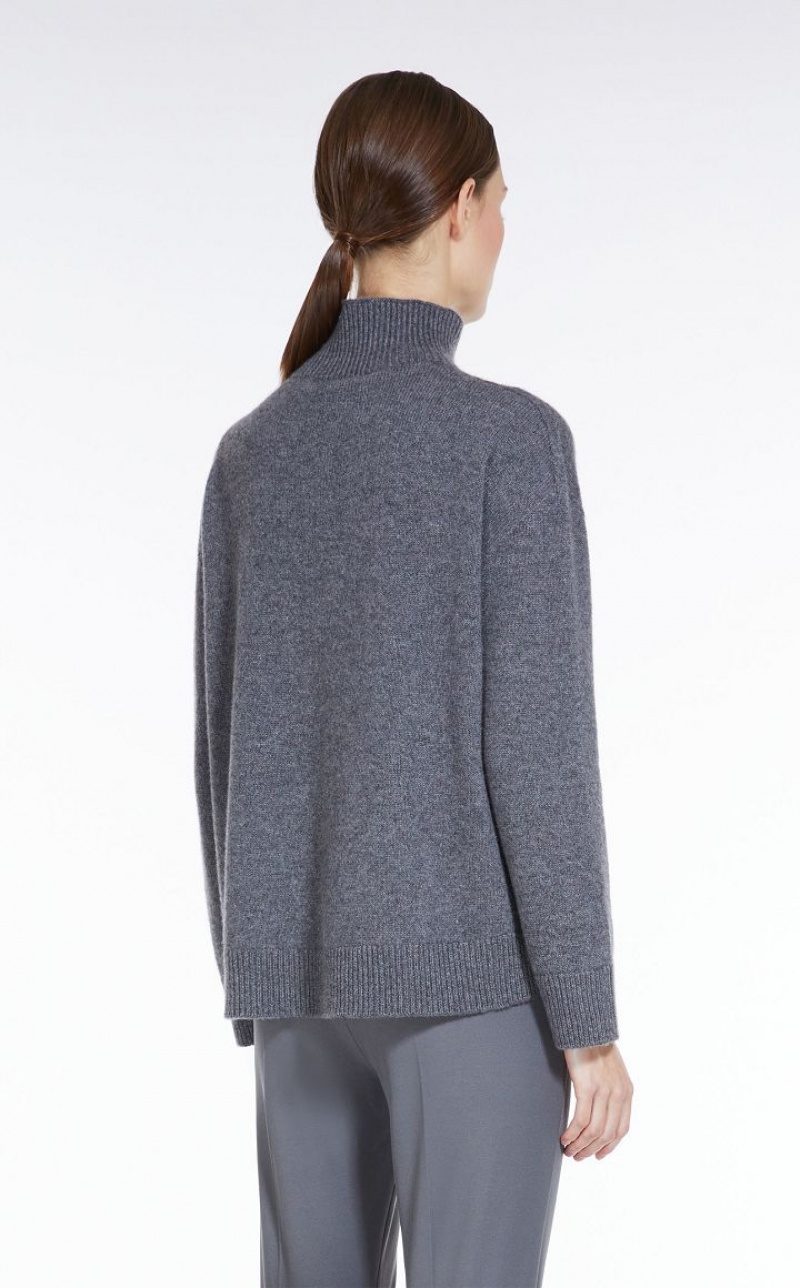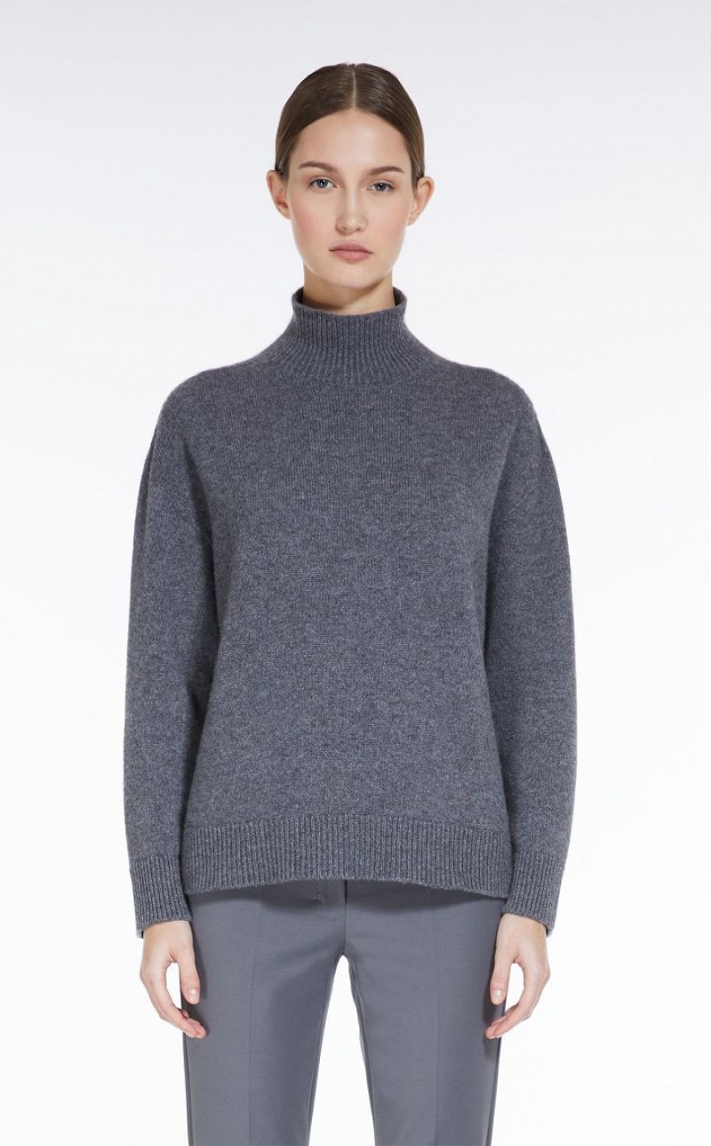 Relaxed-fit polo-neck sweater in fine pure cashmere yarn featuring a high neck, long low set-in sleeves and side slit detail at the hem. Rib-knit neck, cuffs and hem. Length: 64 cm.