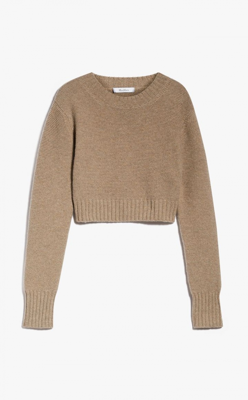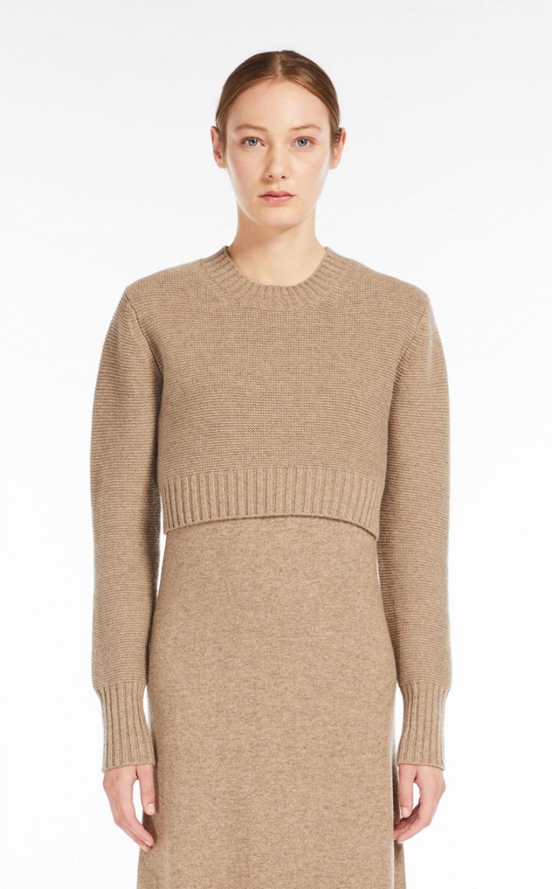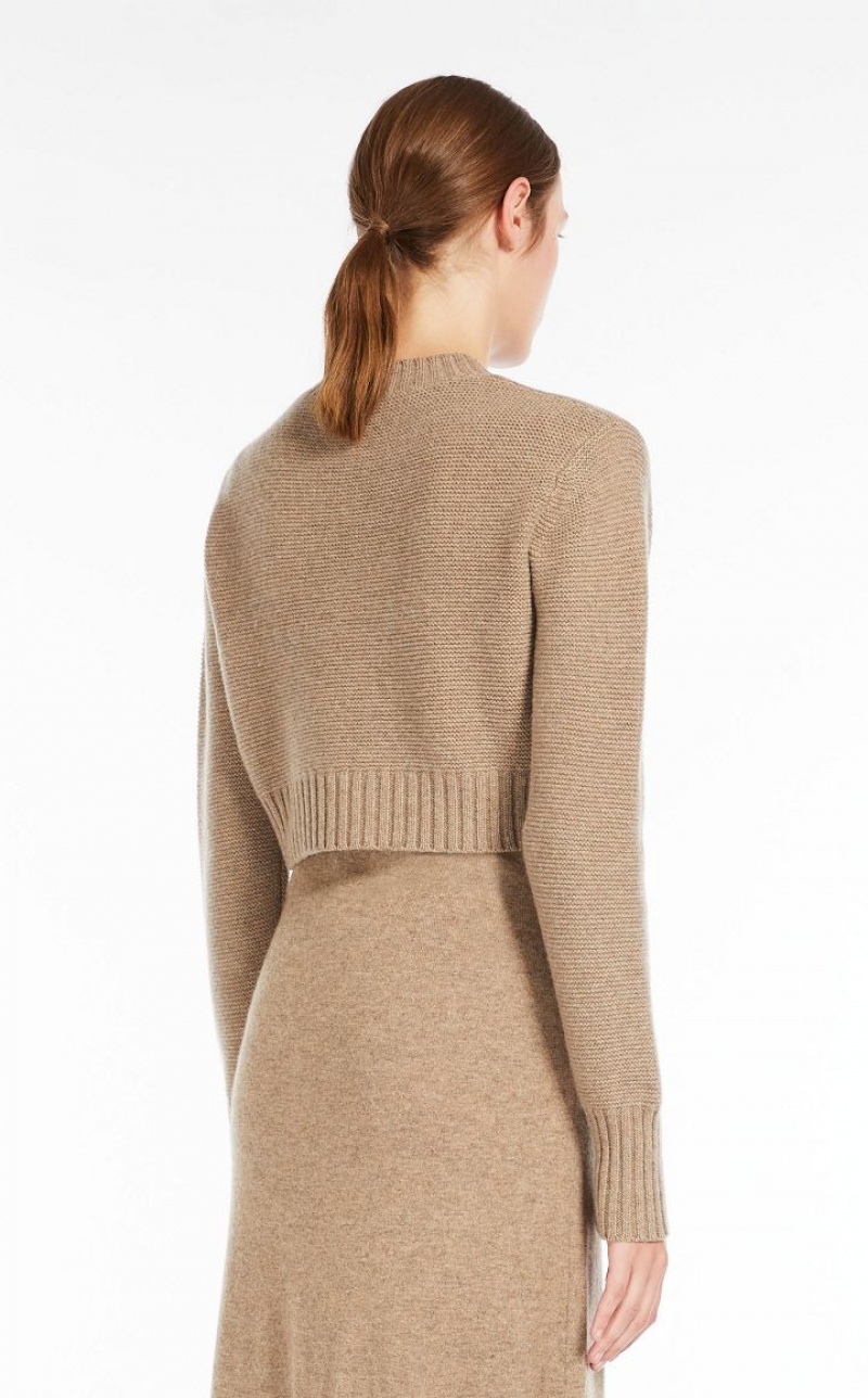 Cropped, long-sleeved jumper, made of fine pure cashmere yarn in a links-stitch knit. Crew-neck style finished with ribbed edges. Length: 40 cm.