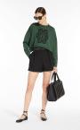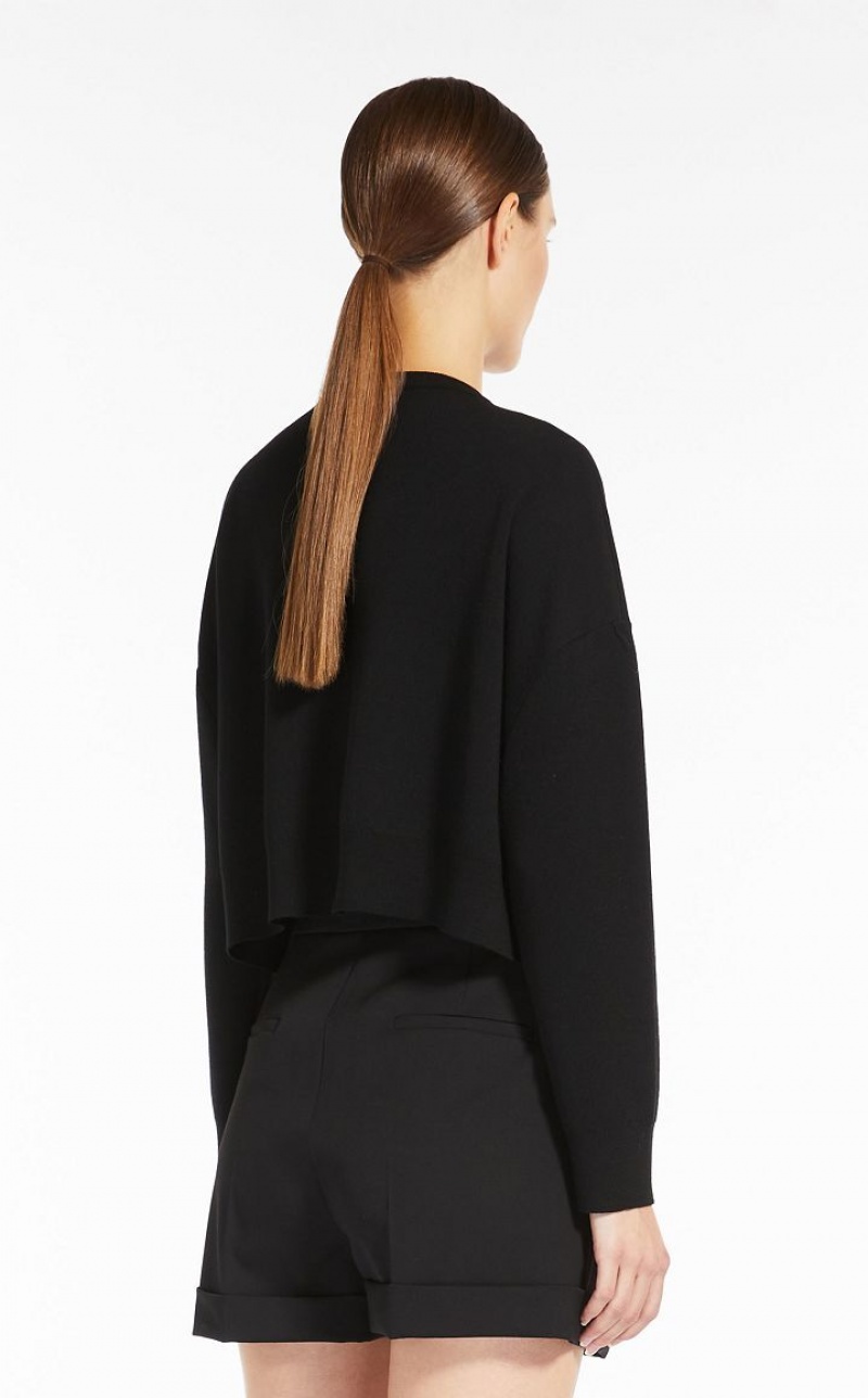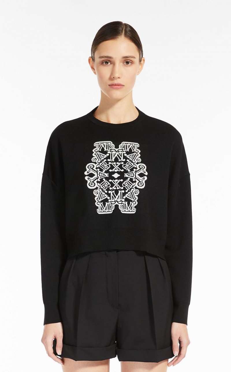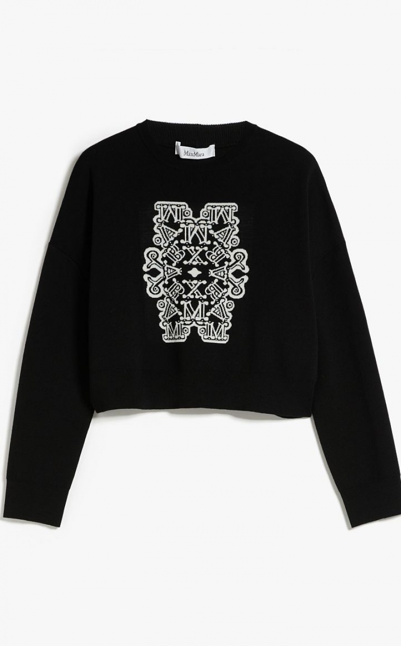 Cropped jumper made of an exquisite, lightweight pure wool yarn. Featuring a slightly oversized volume, it is decorated with a MaxMaraGram jacquard motif on the front. The model is finished with a ribbed crew-neck and long low set-in sleeves. Length: 44 cm.