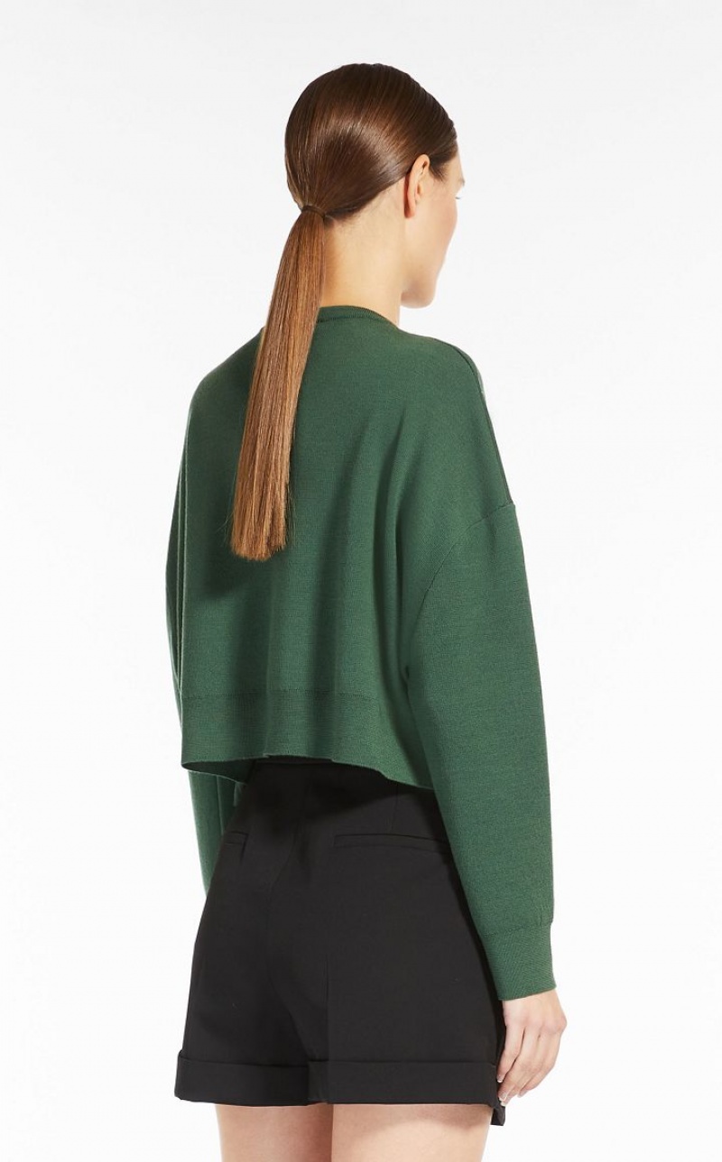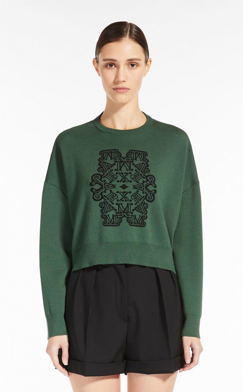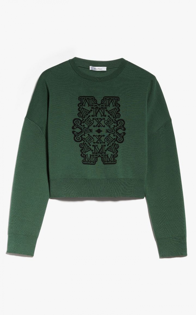 Cropped jumper made of an exquisite, lightweight pure wool yarn. Featuring a slightly oversized volume, it is decorated with a MaxMaraGram jacquard motif on the front. The model is finished with a ribbed crew-neck and long low set-in sleeves. Length: 44 cm.