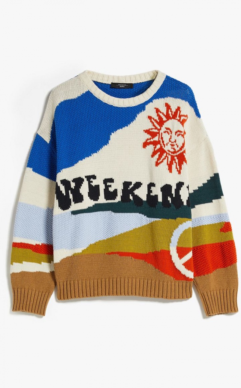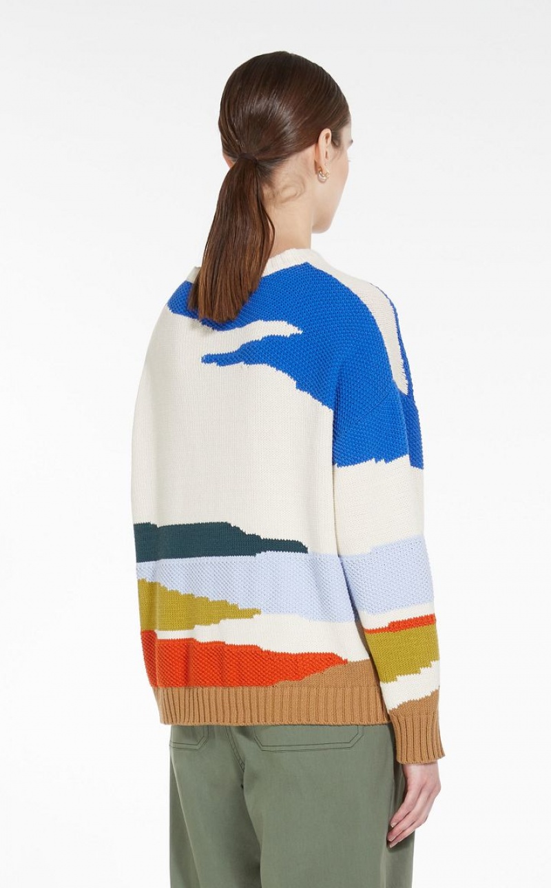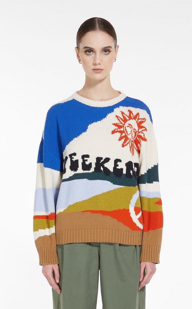 Round-neck knit in soft cotton yarn, with a loose, oversized fit, long sleeves and dropped shoulders. This style is embellished with an all-over colour-block effect intarsia design. Trimmed with ribbed edges.