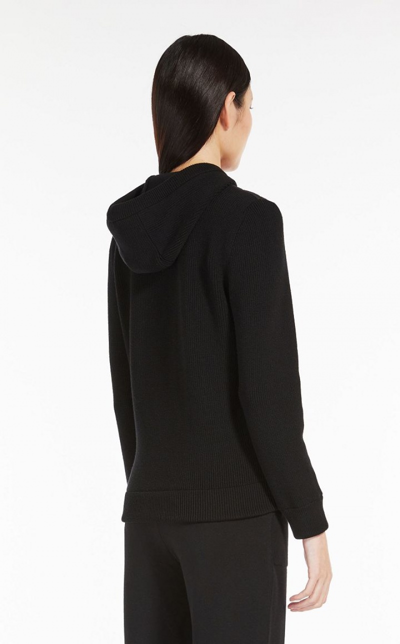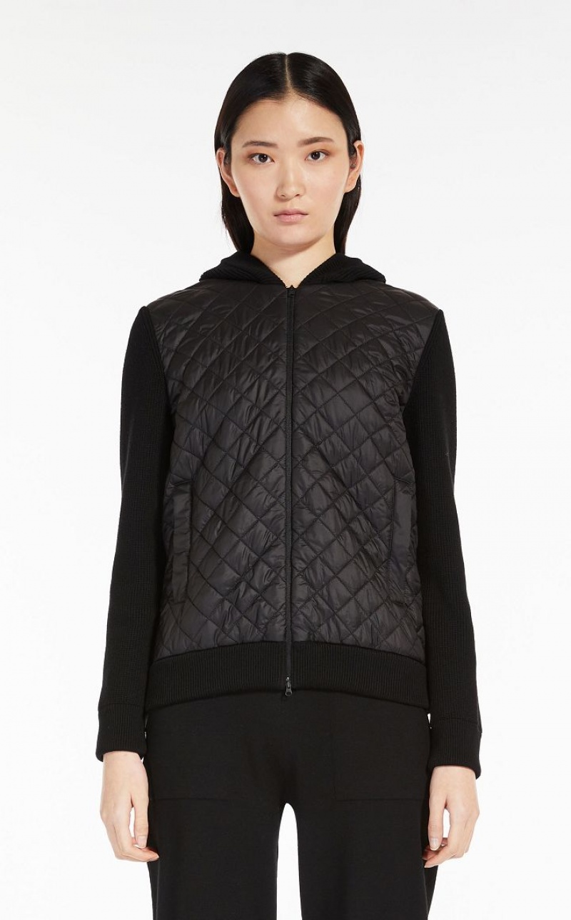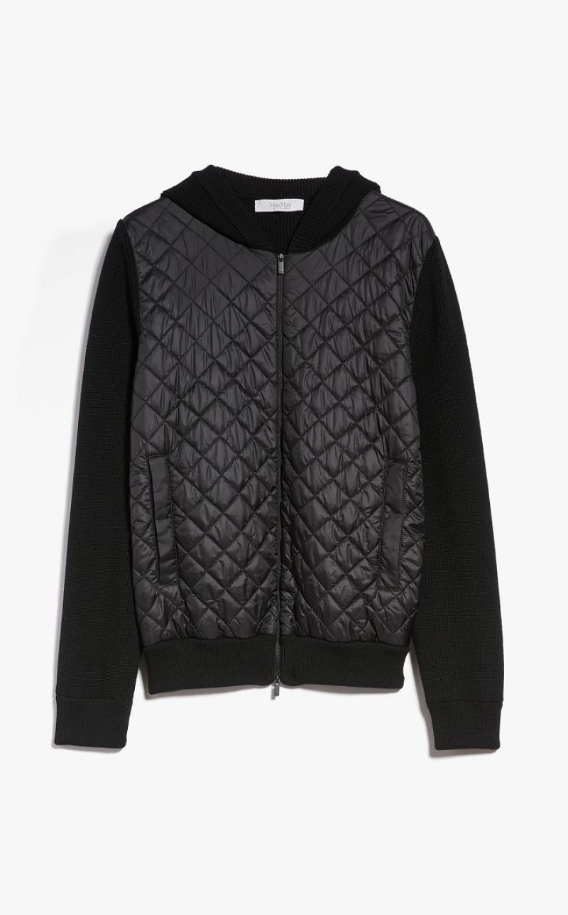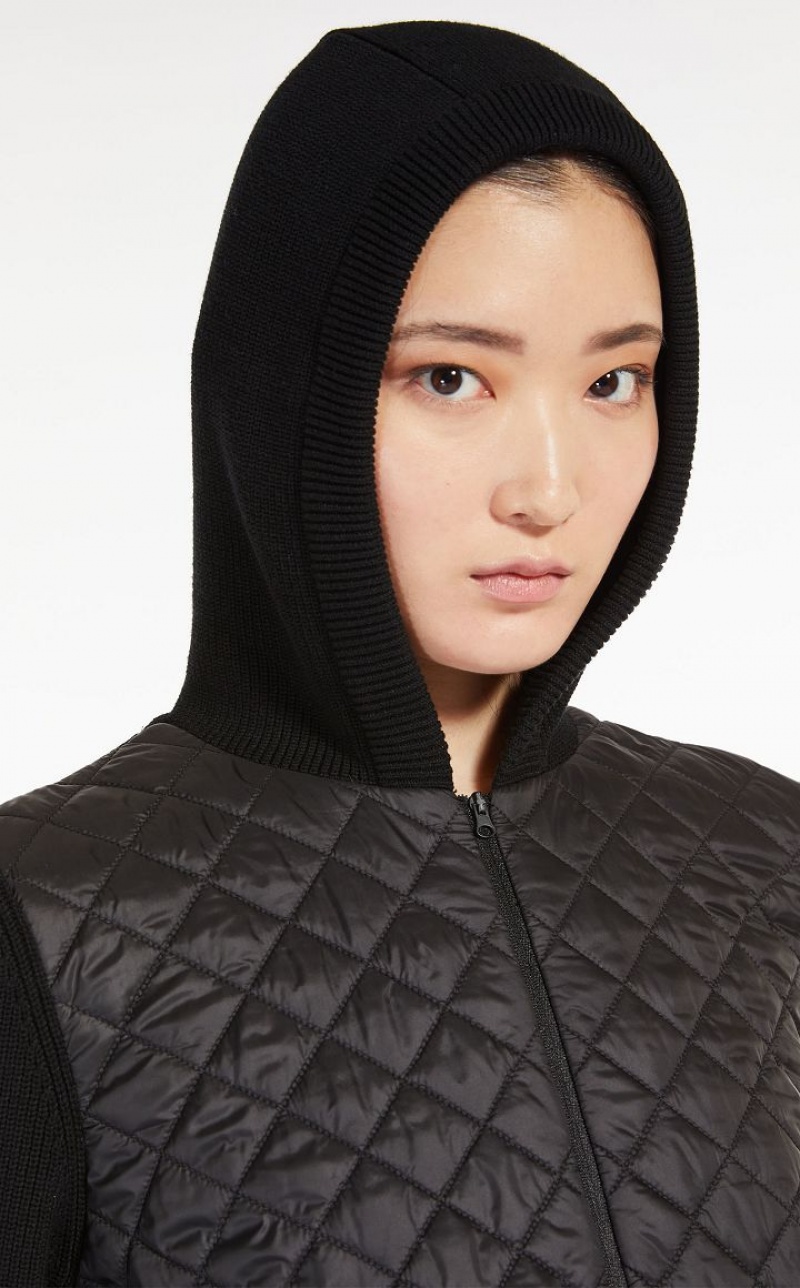 Short hooded jacket in a stretch viscose knit featuring cob stitch on the sleeves, hood and back. The garment is embellished with a front insert in nylon padded with Luxepad Ultra-fine Insulating Technology, designed to retain and optimise body heat, even in cold temperatures. Long sleeves and concealed zip pockets on the sides. Zip fastening with double slider. Length: 62 cm. The fabric is made from viscose fibres obtained from wood pulp from controlled, managed forests following the criteria of good forest management.