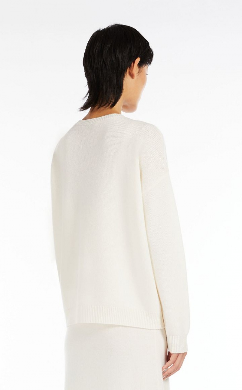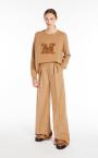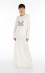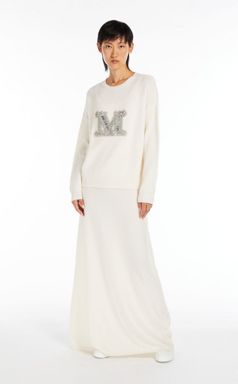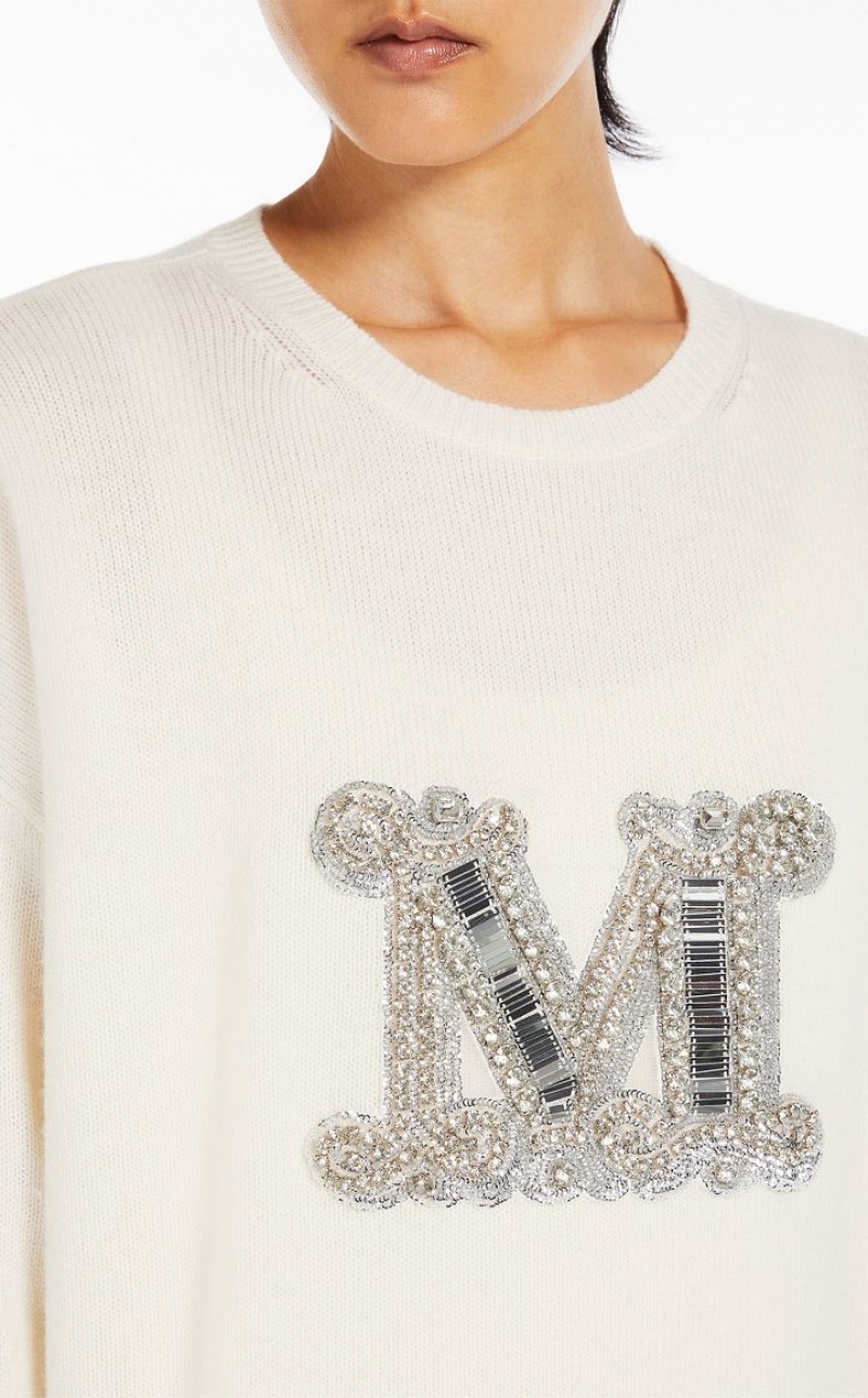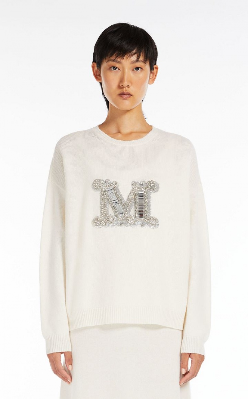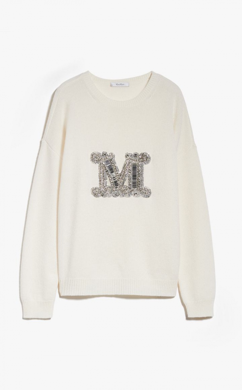 Jumper in exquisite pure cashmere yarn, featuring a round neck and long sleeves with dropped shoulders. Slightly oversized relaxed fit style, embellished with a jewel appliqué that reproduces the M Monogram logo on the front. Finished with ribbed edges. Length: 65 cm.