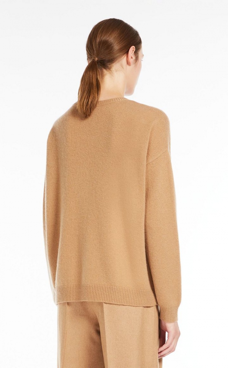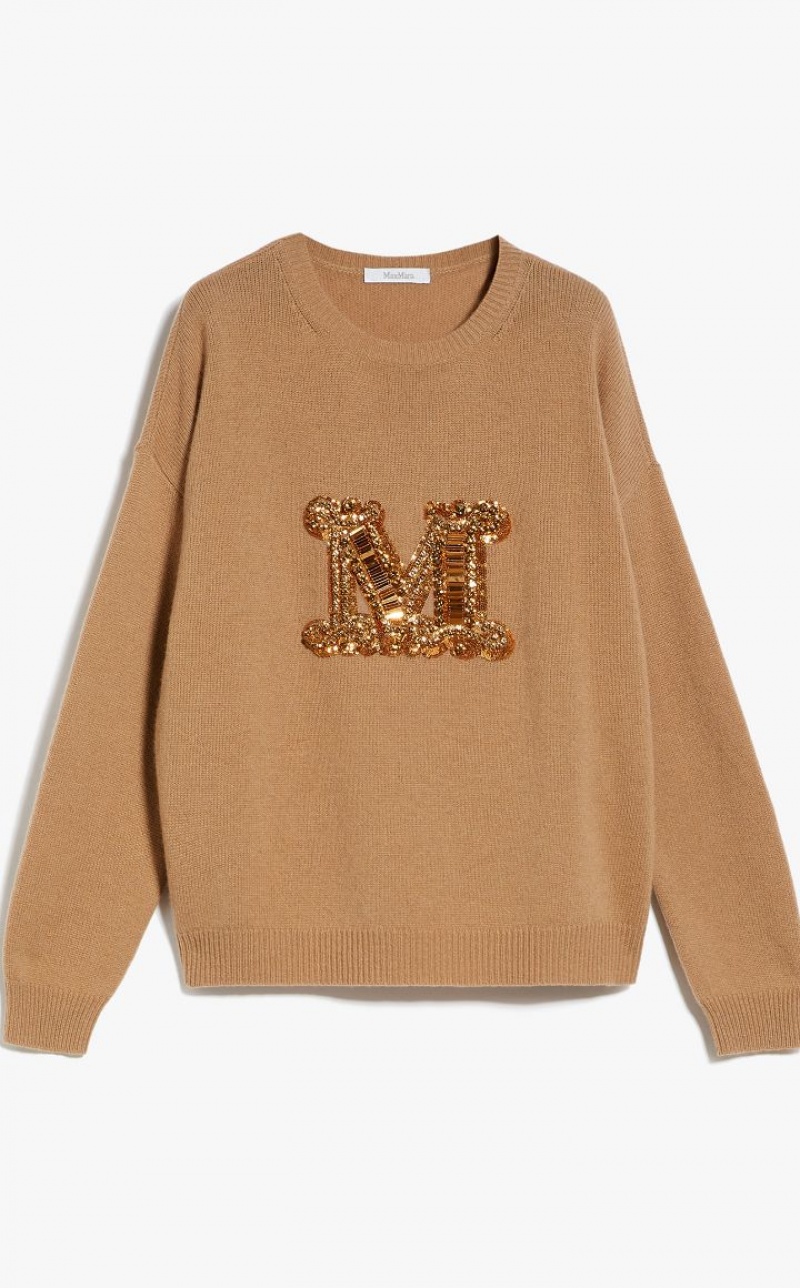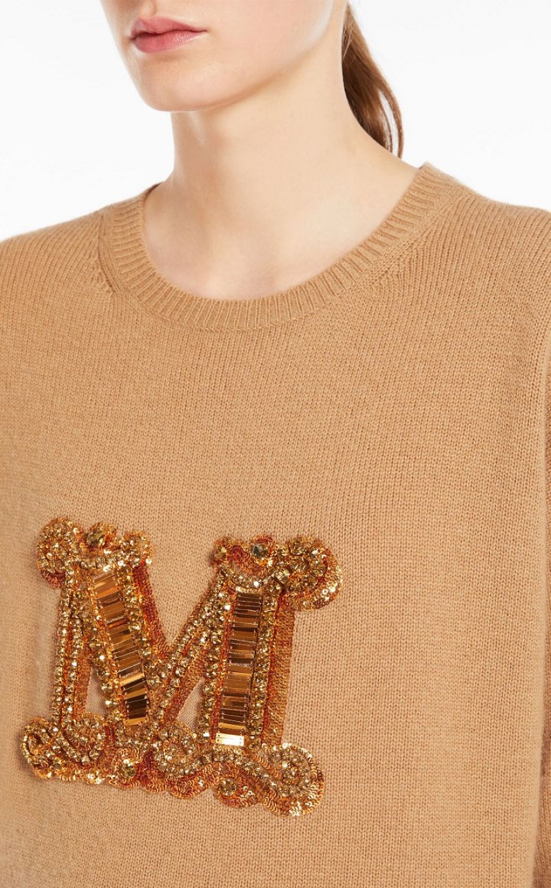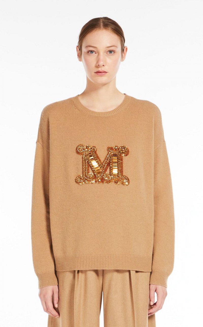 Jumper in exquisite pure cashmere yarn, featuring a round neck and long sleeves with dropped shoulders. Slightly oversized relaxed fit style, embellished with a jewel appliqué that reproduces the M Monogram logo on the front. Finished with ribbed edges. Length: 65 cm.