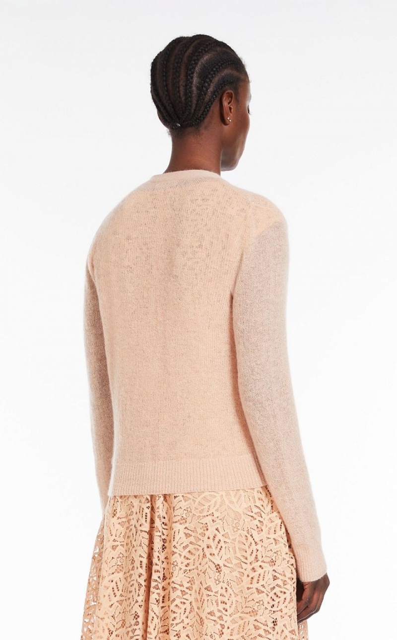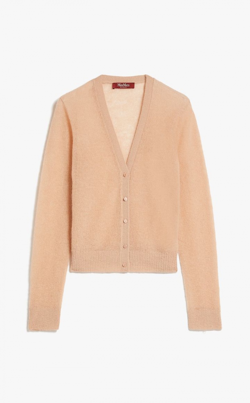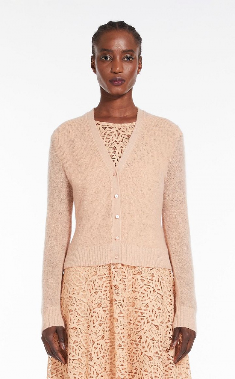 Half fisherman’s-knit long-sleeved V-neck cardigan in fine mohair gauze fabric. Rib-knit cuffs and deep hem. Button fastening. Length: 52 cm.