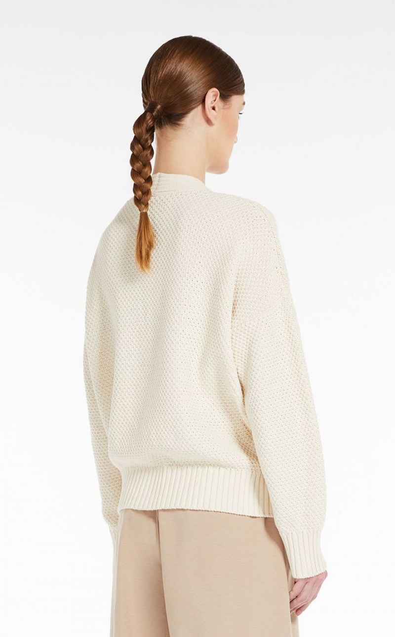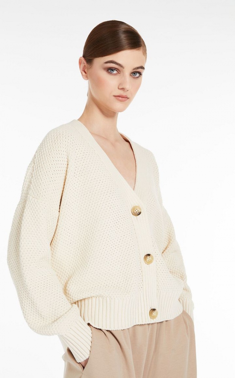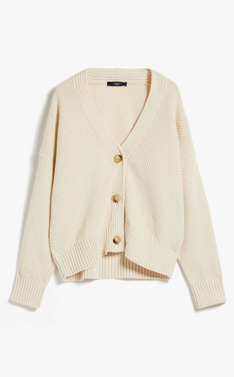 Cropped cardigan in soft cotton yarn, featuring a moss stitch knit. Oversized style with V neck, long sleeves and ribbed edges. Horn-effect button fastening.