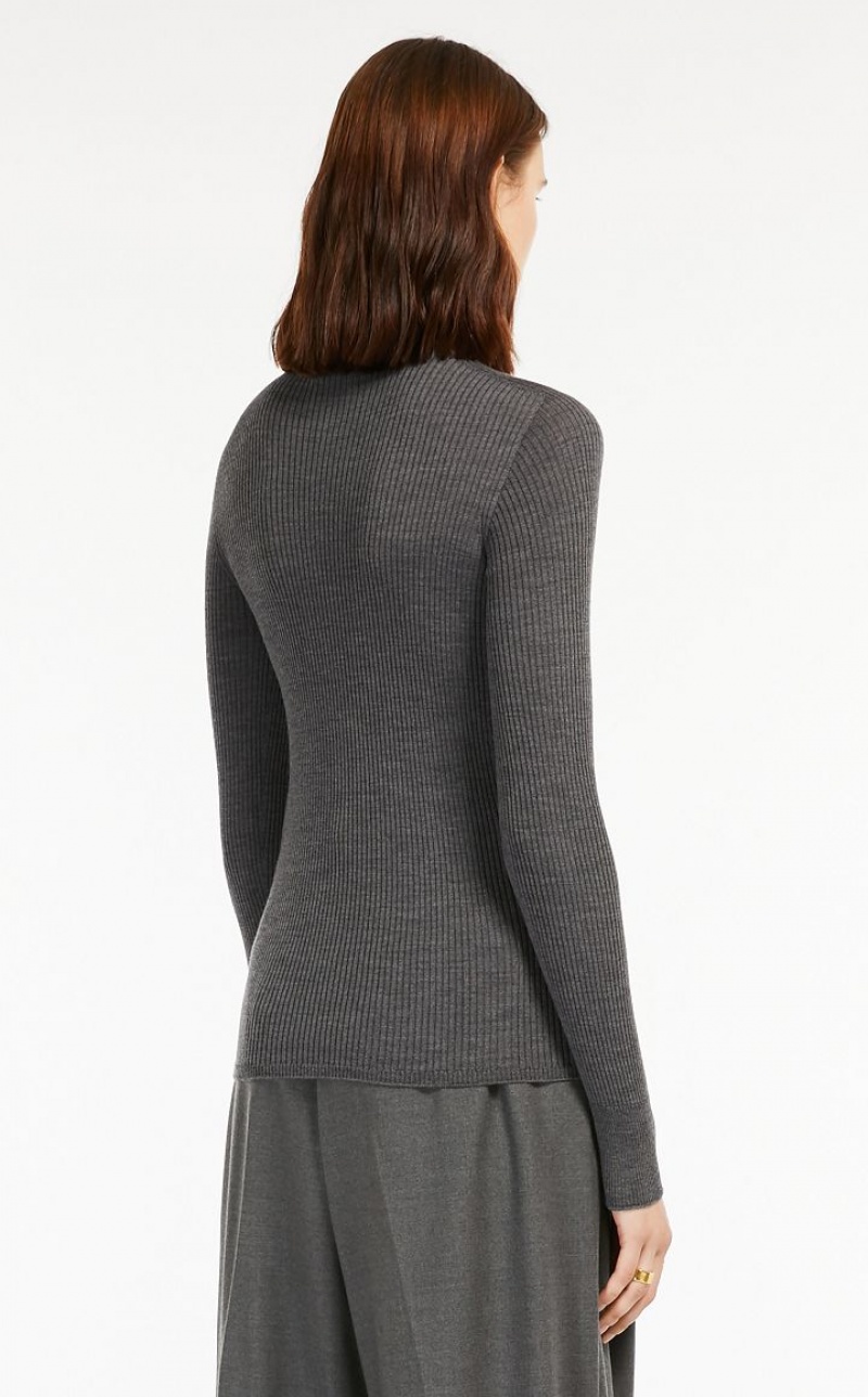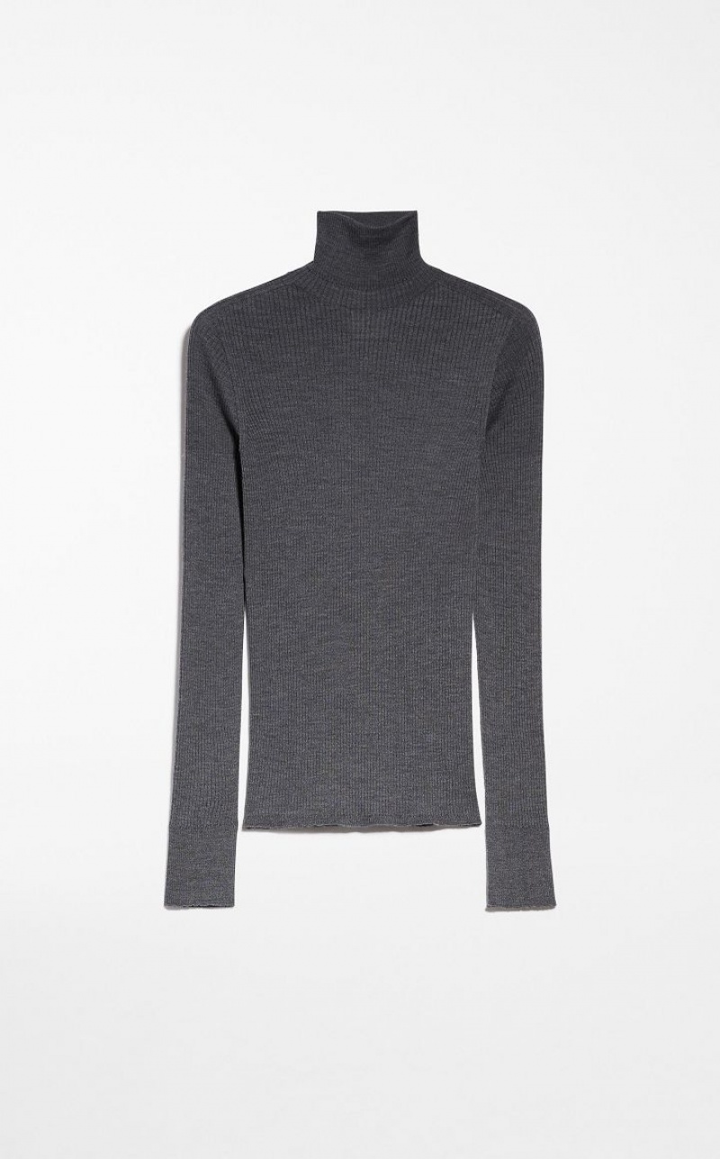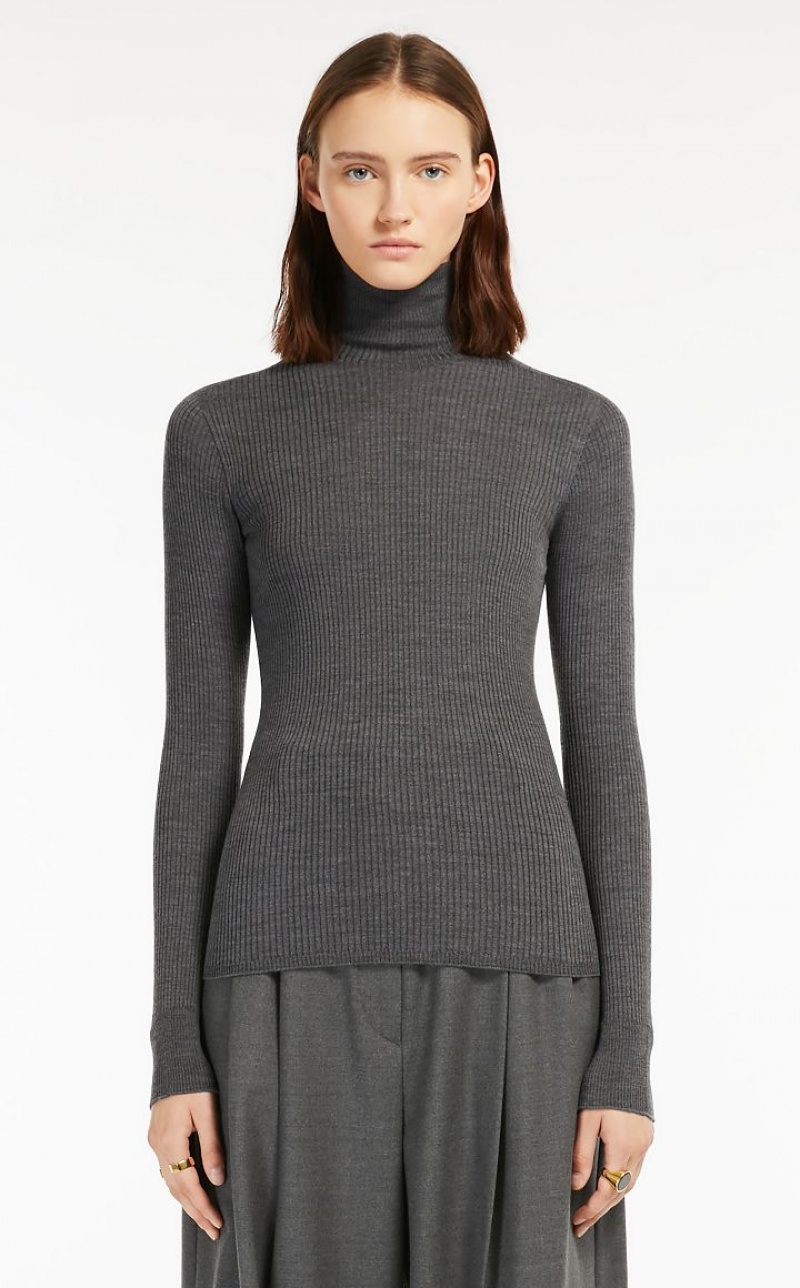 Polo neck jumper made of fine pure virgin wool yarn in a rib knit. The fit is snug, with the cuffs and collar defined by a narrower rib.