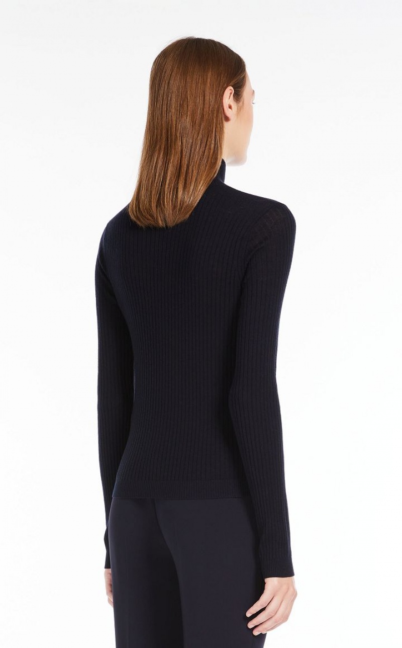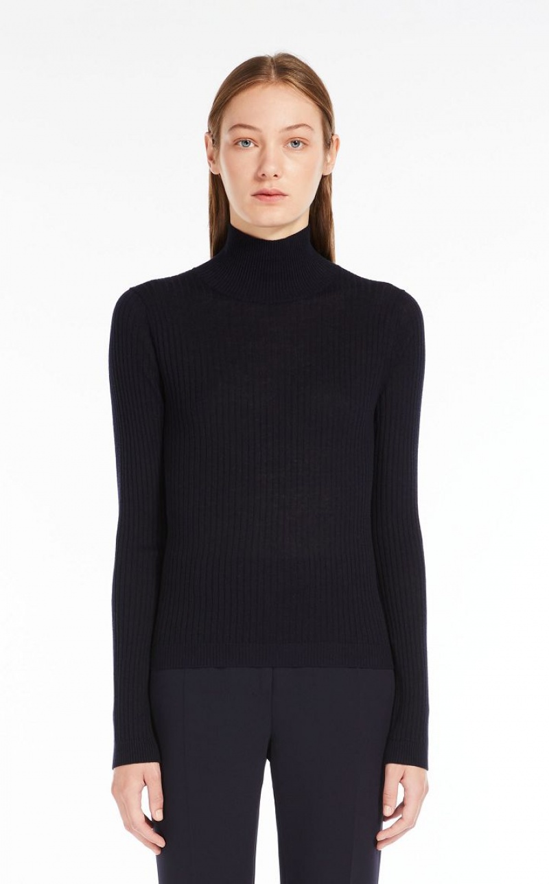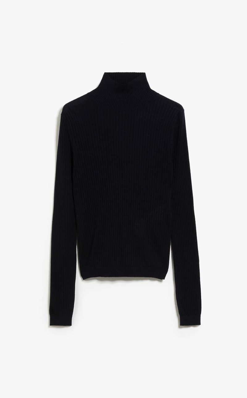 Long-sleeved polo-neck sweater in fine wool and silk-blend fabric. The flat rib-knit pattern and slim fit envelope and define the garment’s feminine silhouette. Rib-knit collar, cuffs and hem. Length: 62 cm.