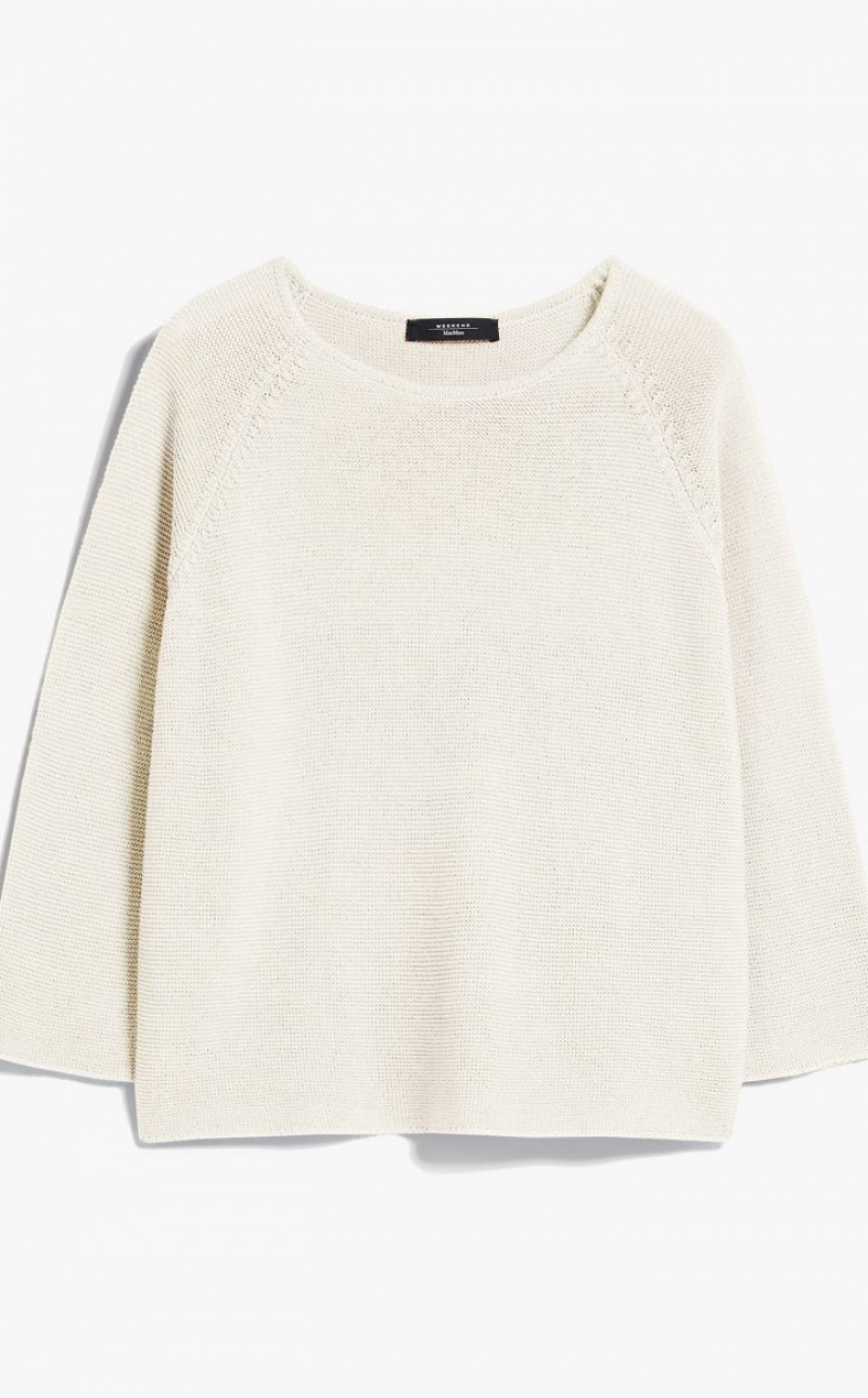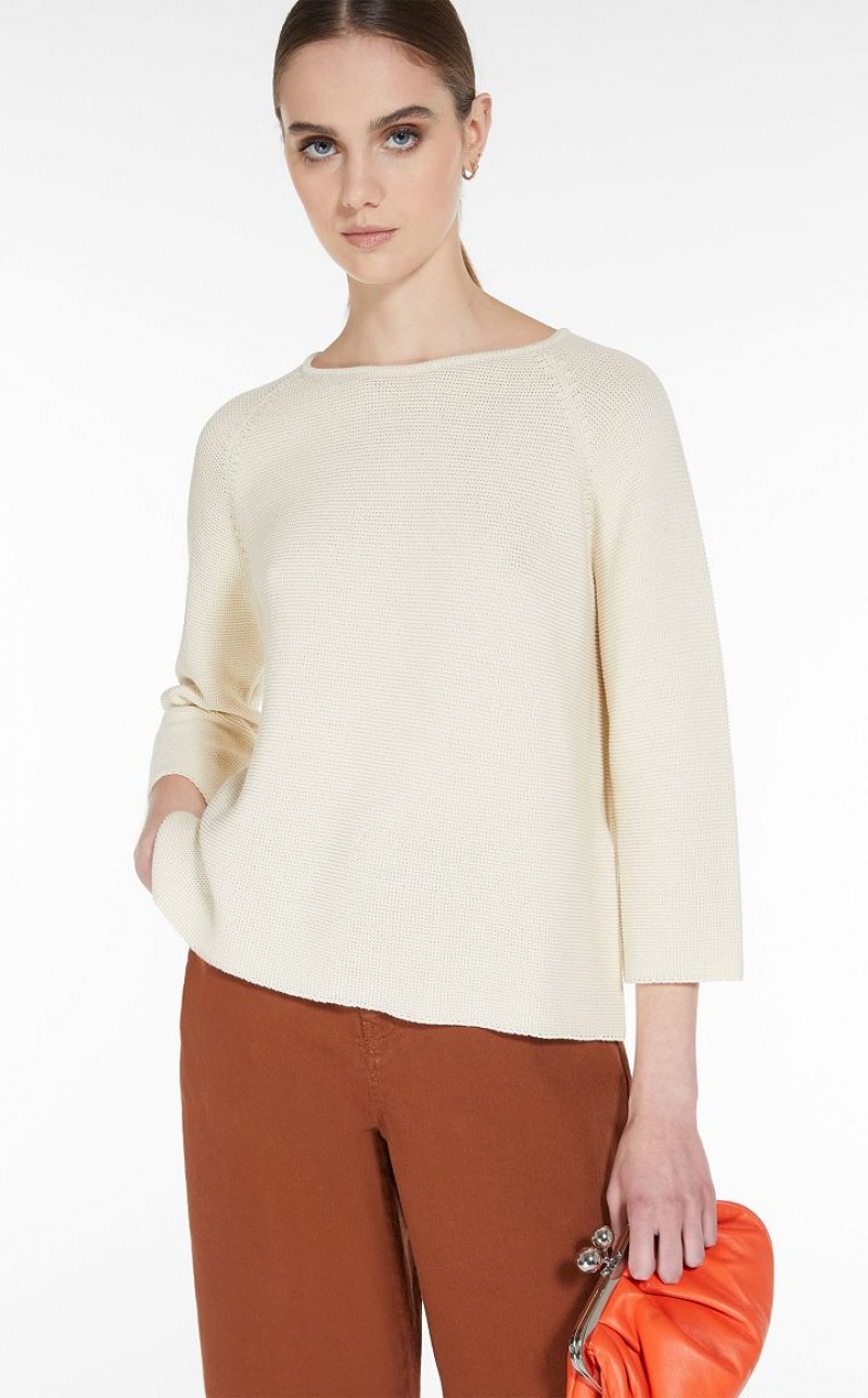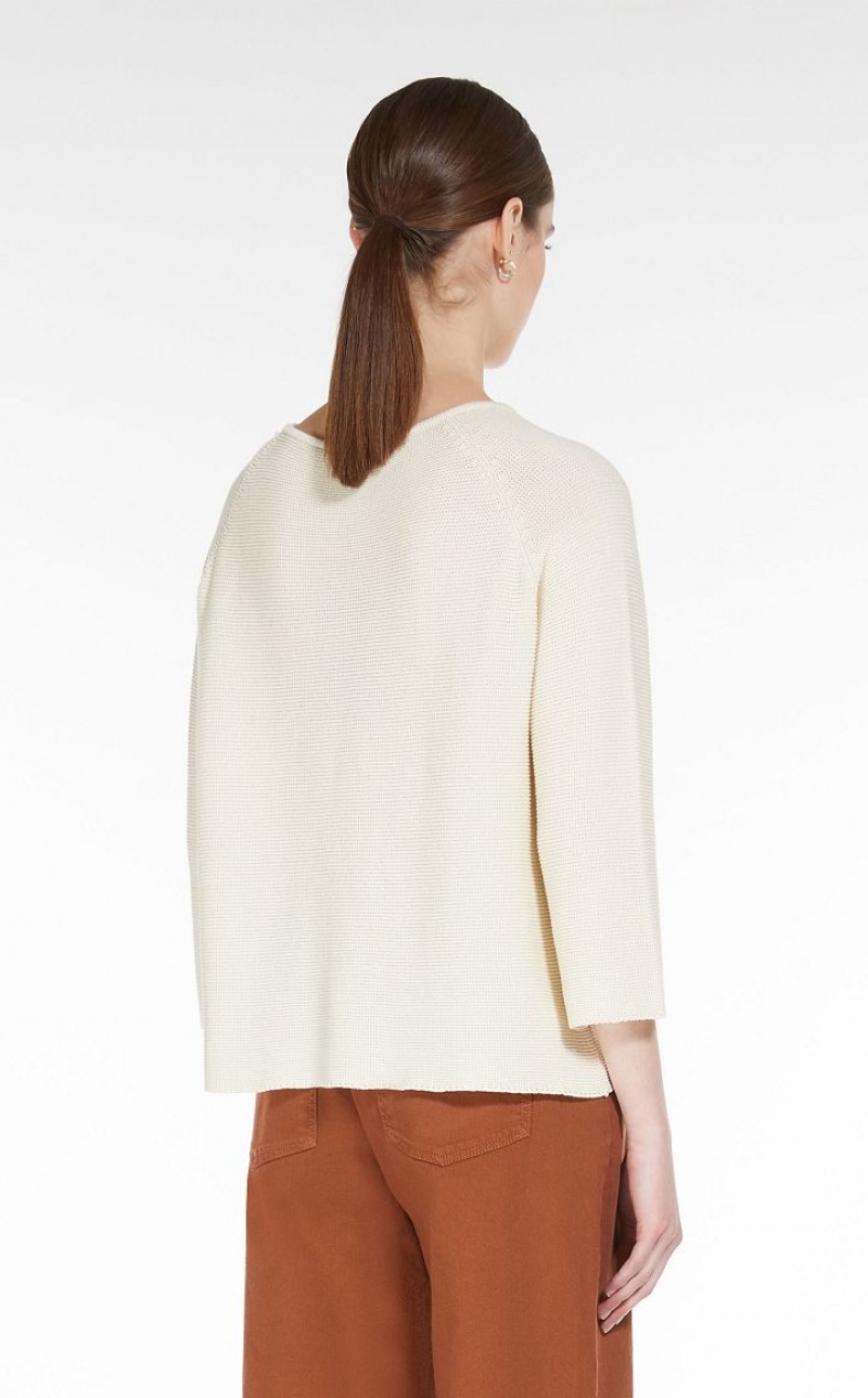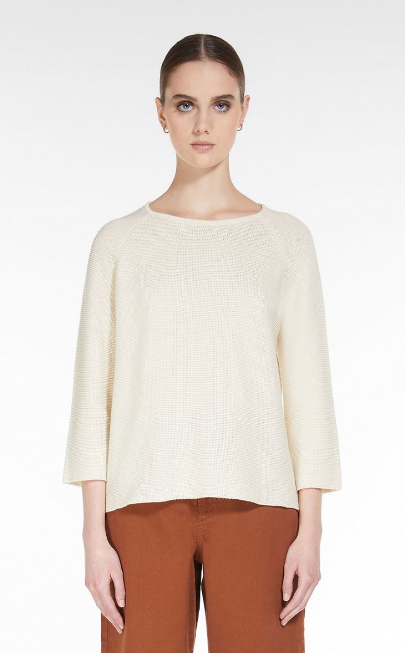 Loose-fit round-neck top in pure cotton yarn. This style has a pleasing texture with fancy knit, 3/4 raglan sleeves and is mid length.