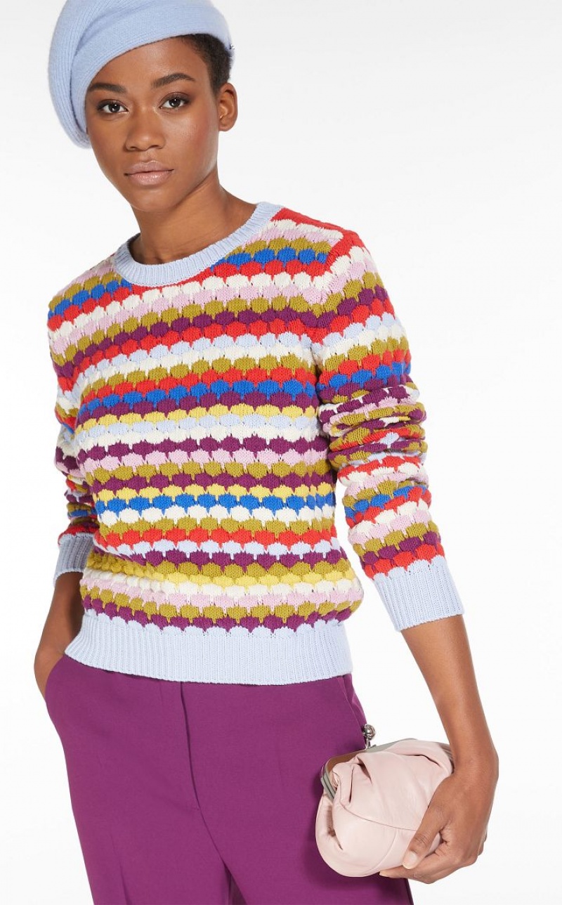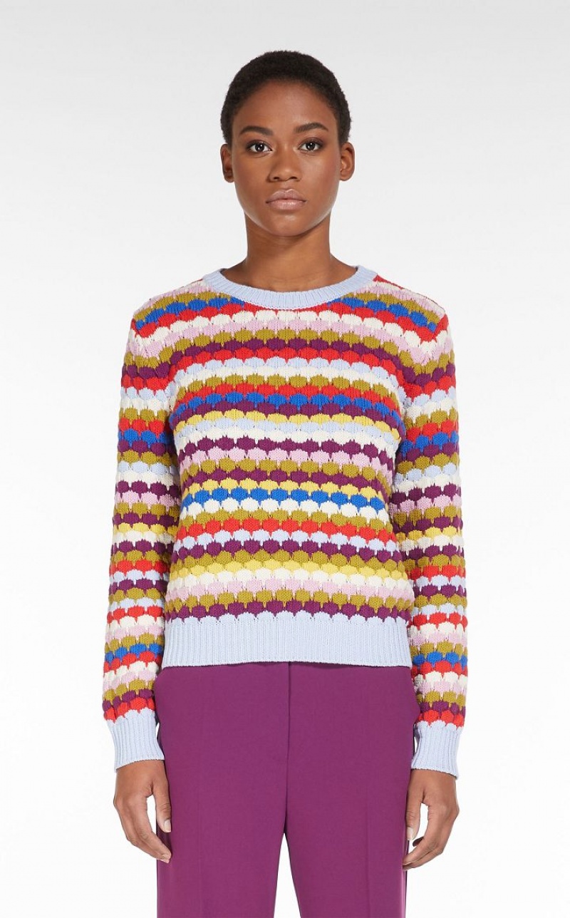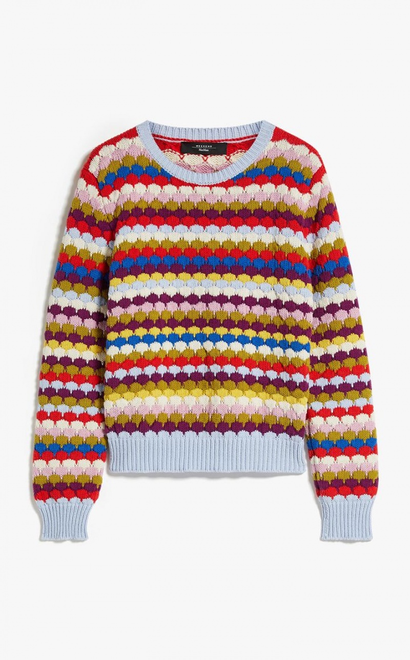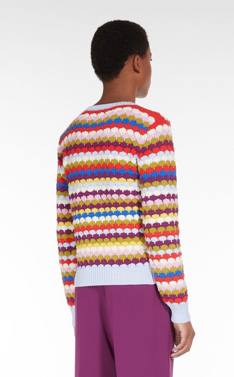 Knit top in soft cotton yarn, featuring a fan stitch which creates a unique multicoloured stripe design. Loose fit style with round neck, long sleeves and ribbed edges.