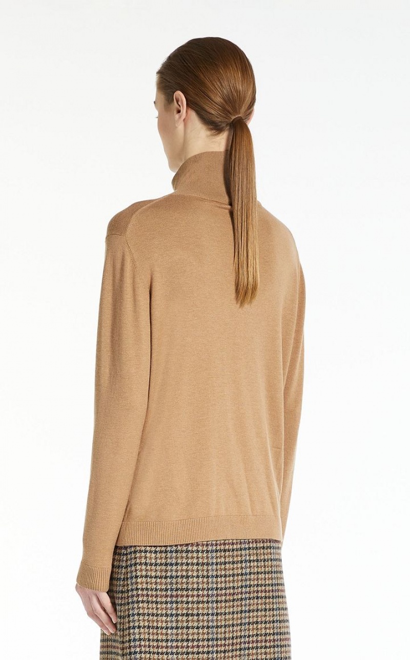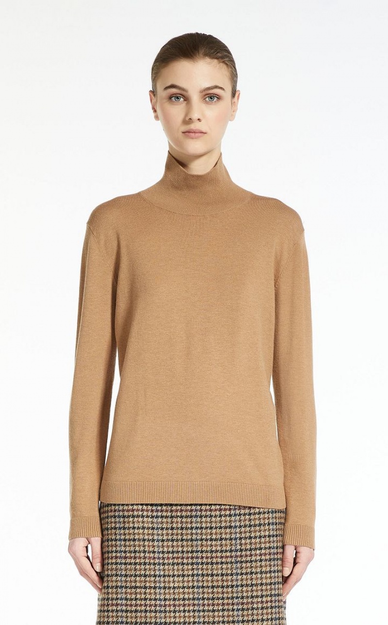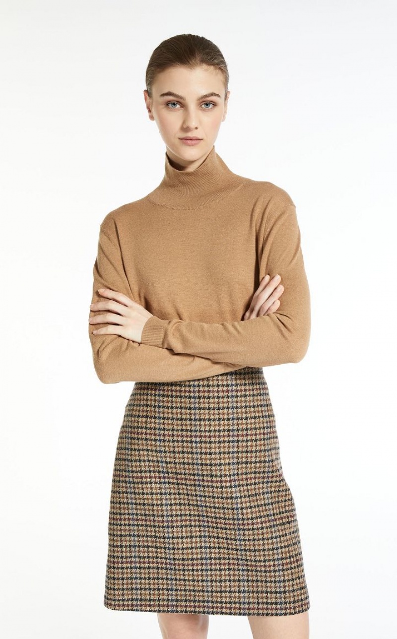 Relaxed fit stockinette stitched sweater in silk and wool yarn. High neck, long sleeves and rib knit trims. Length: 57 cm. The creative mind behind the new Signature Collection by Weekend Max Mara is English fashion editor and stylist, Kate Phelan. Named 24, after the 24 hours in the day, the capsule offers versatile and timeless genderfluid pieces, designed to be worn from morning to night, and mixed and matched as the occasion demands. Timeless pieces which withstand trends and conventions to express their personality to the max.
