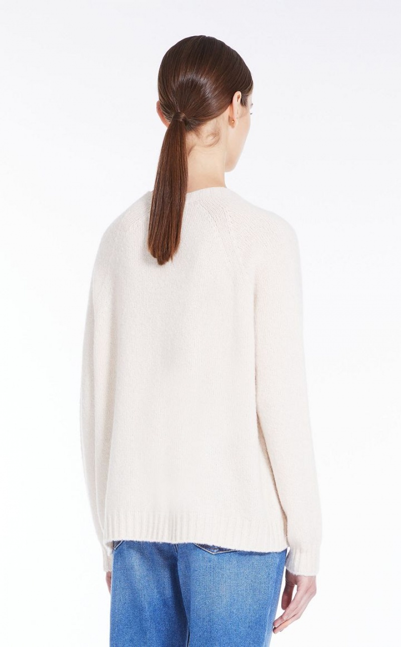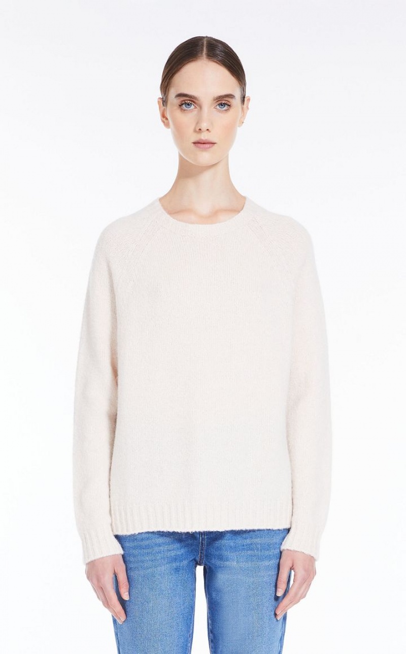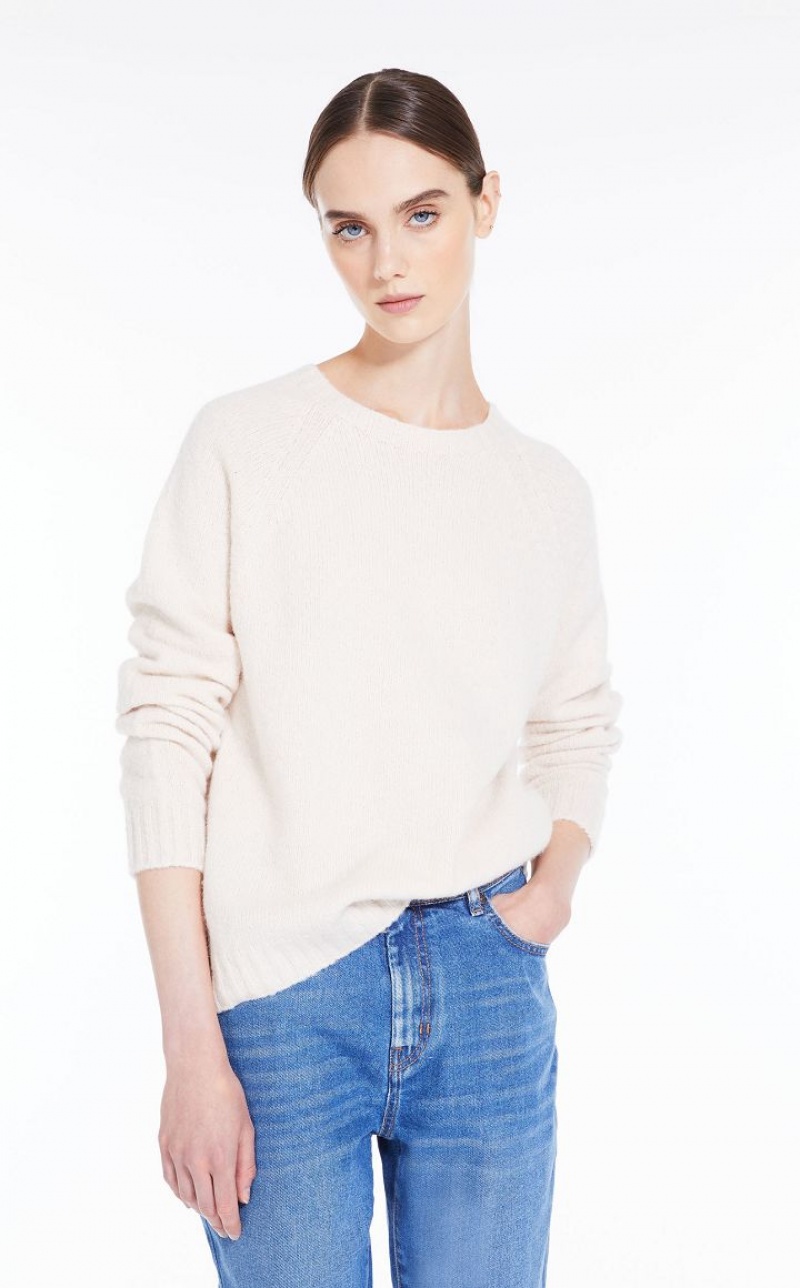 Knit top with a loose fit in a luxe alpaca and cotton yarn. This style has ribbed edges, long raglan sleeves and a round neck.