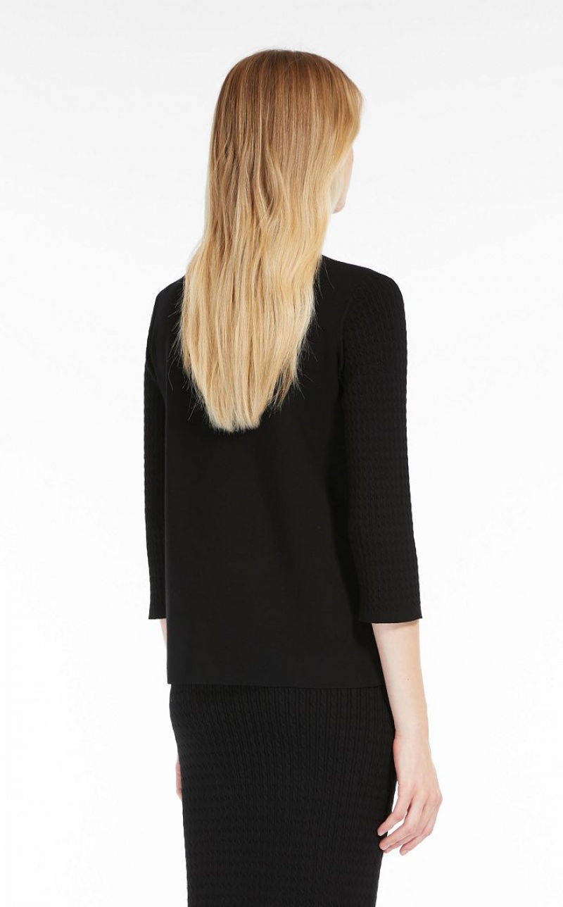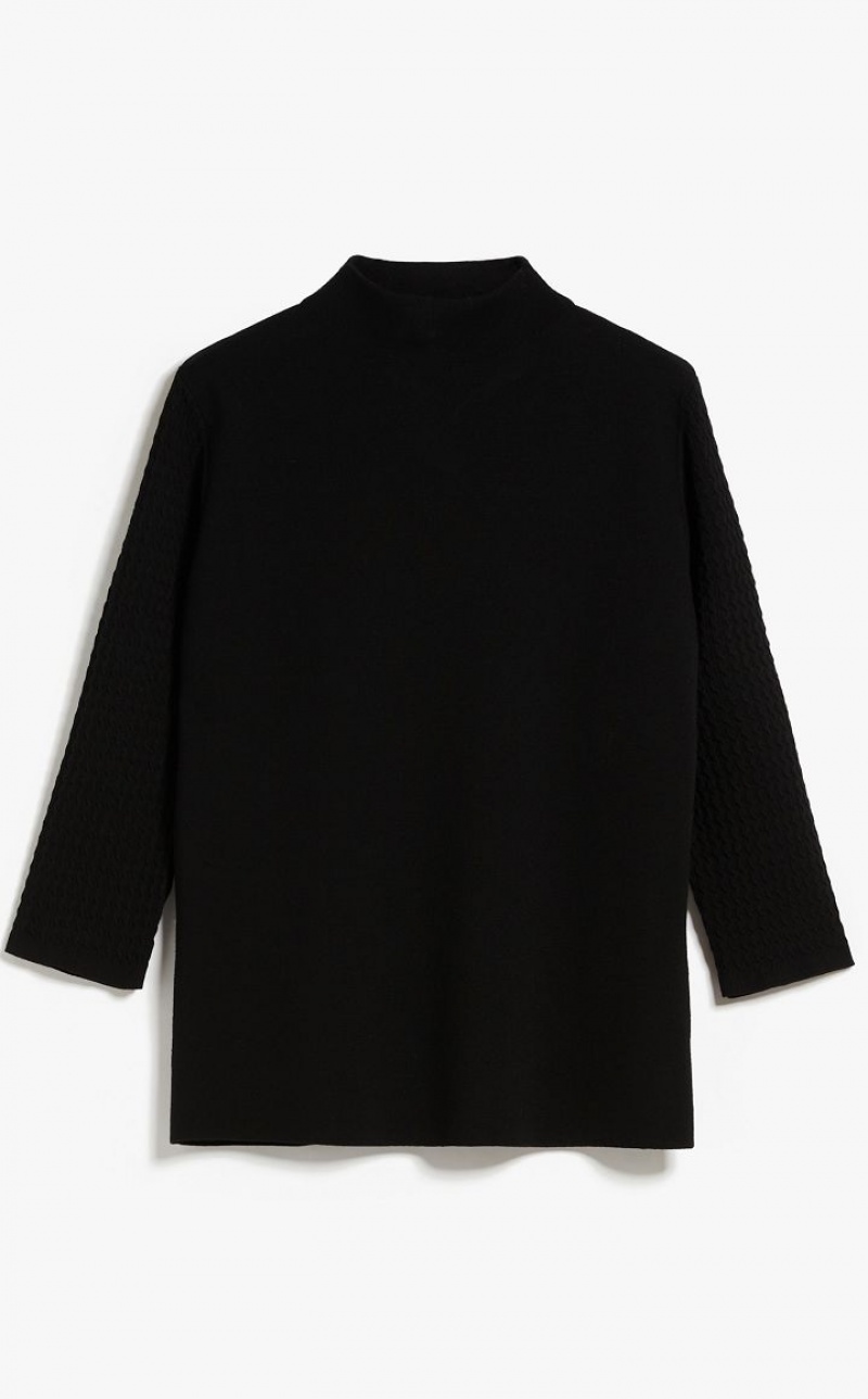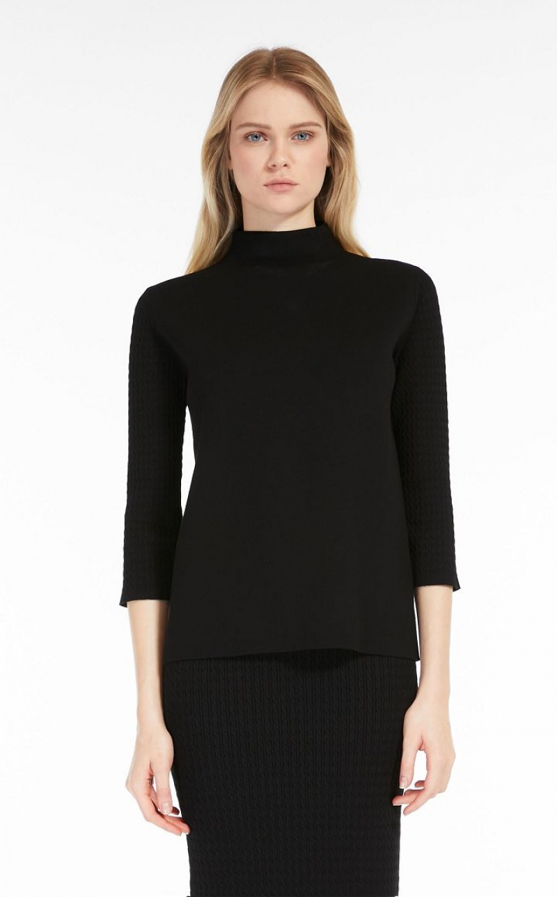 Linen-knit mock polo-neck sweater in soft stretch viscose yarn featuring cable-knit long sleeves. Length: 64 cm.