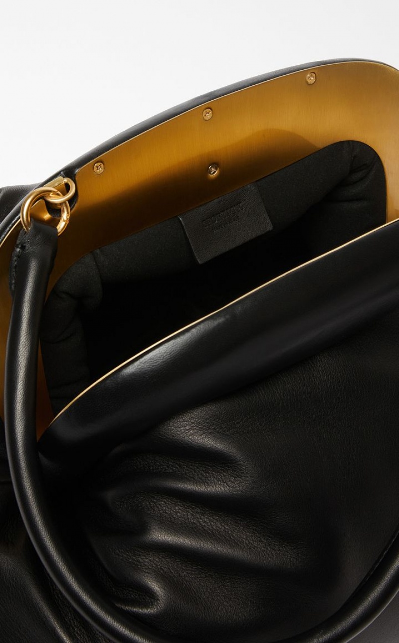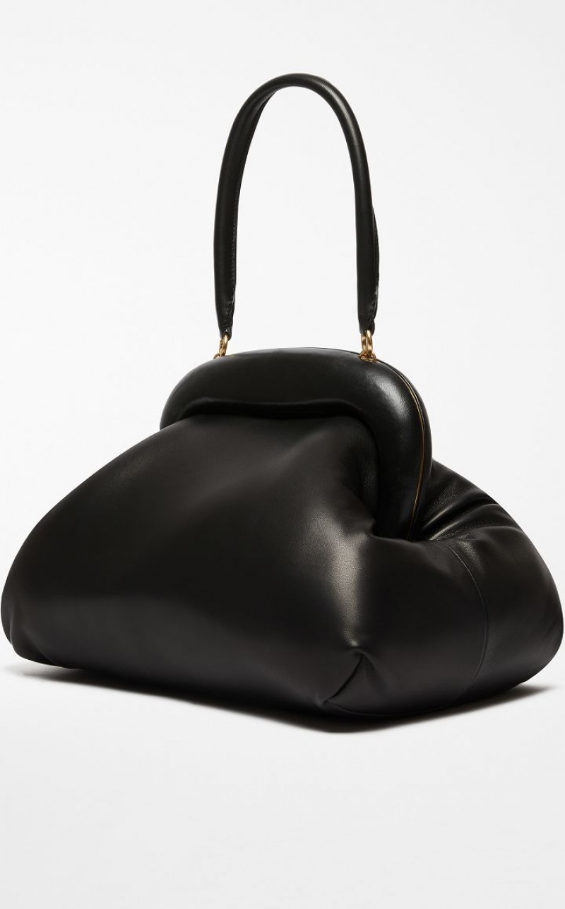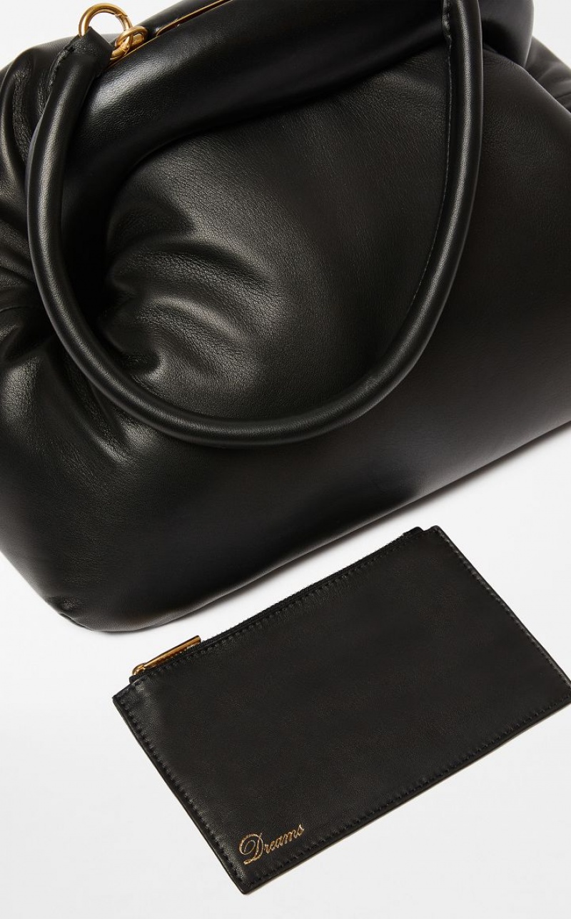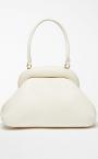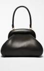 Matt nappa leather Bouba bag with internal padding that makes it feel soft. The opening is defined by an oversized, nappa leather covered wooden frame with a brass effect satin finish metal interior. The handle can be removed thanks to the metal snap hook clasps, so that it can be carried two ways, as a clutch or handbag. Interior with removable pouch, embellished with a logo and golden ‘Dream’ engraving. Measurements: 42 x 26 x 29 cm.