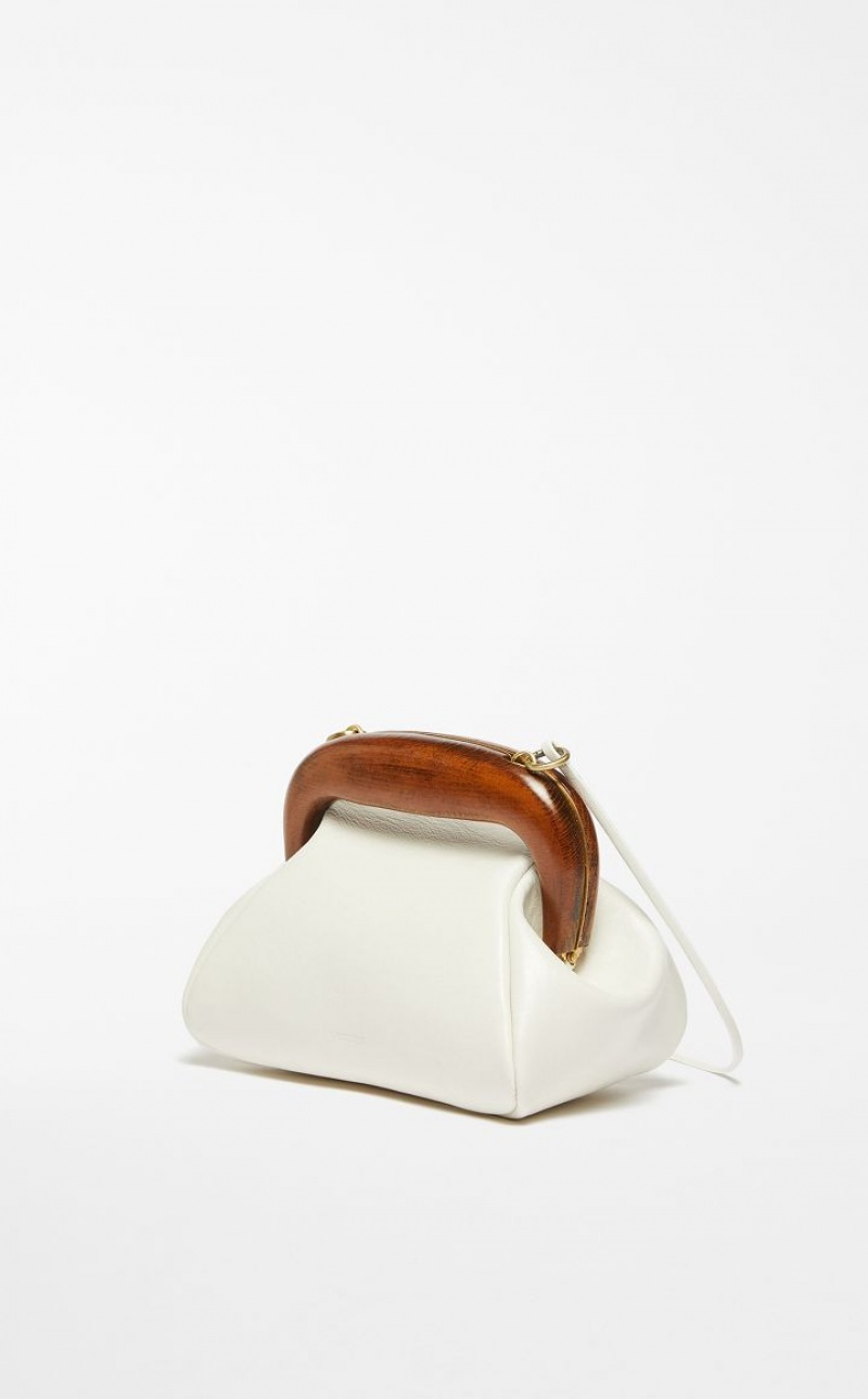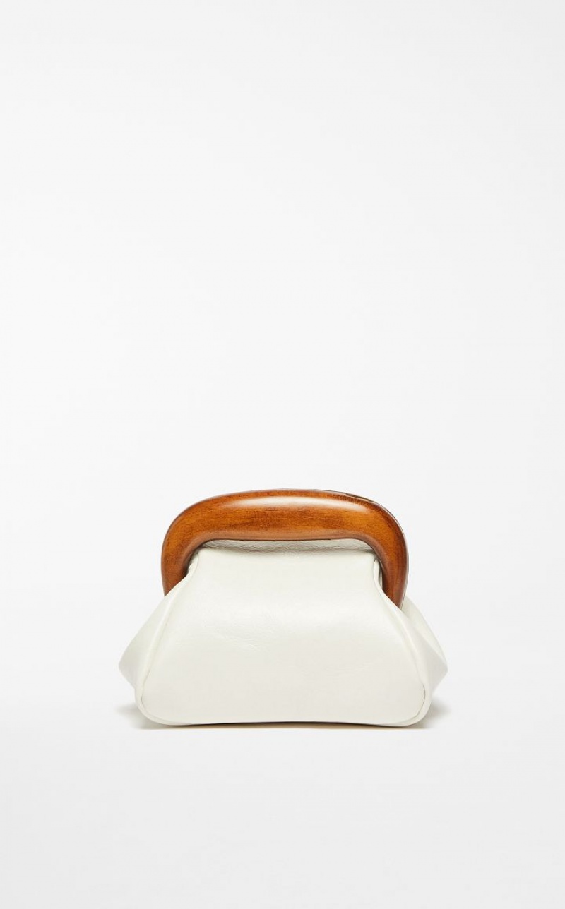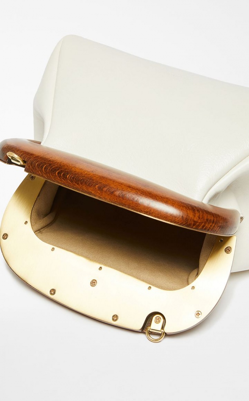 Small Bouba bag in vegetable-tanned leather with a vintage look. The oversized wooden frame is completed by an insert with a satin-effect brass finish. Soft construction with lined interior. Can be carried by hand as a clutch or over the shoulder, thanks to the adjustable and detachable shoulder strap with retractable hooks. Gold-finish front logo. Measurements: 24 x 16 x 21 cm.