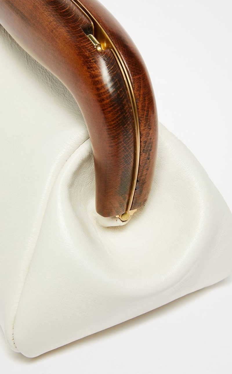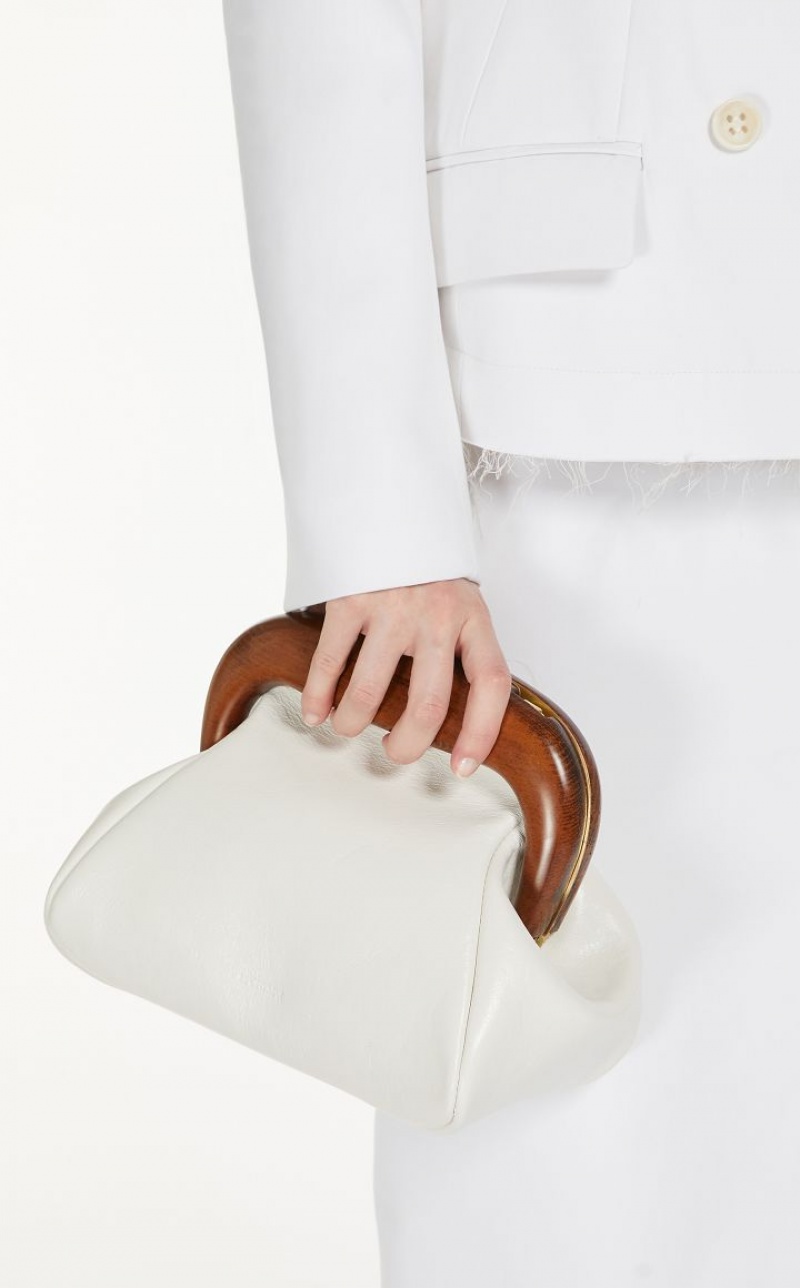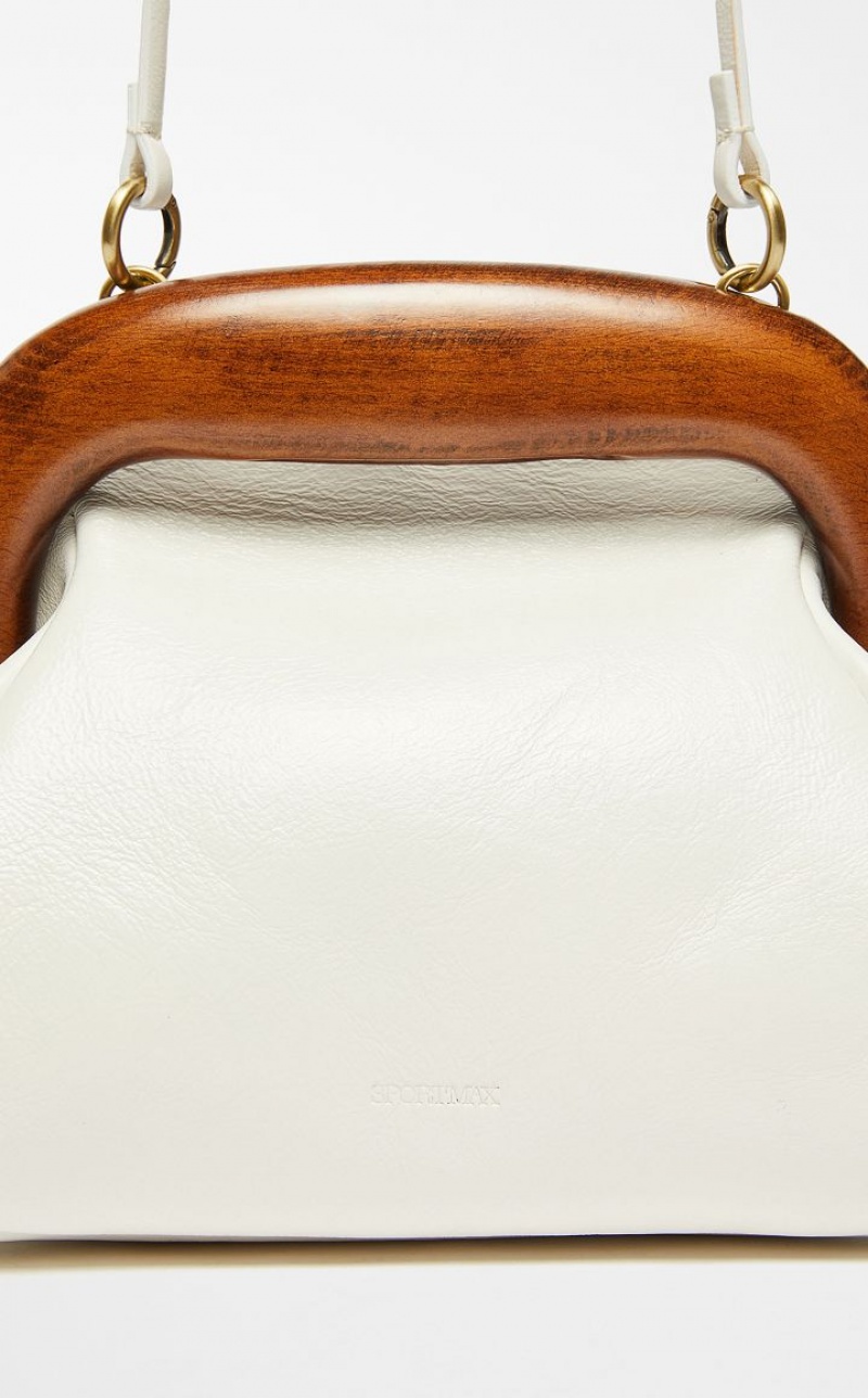 Handbag in cattle; with details in maple wood; lining in 60 nylon, 40 polyurethane.