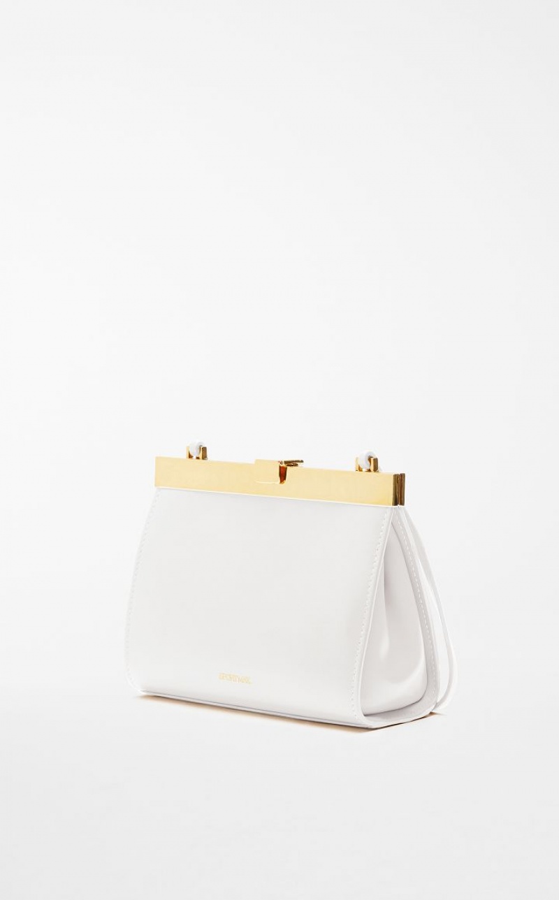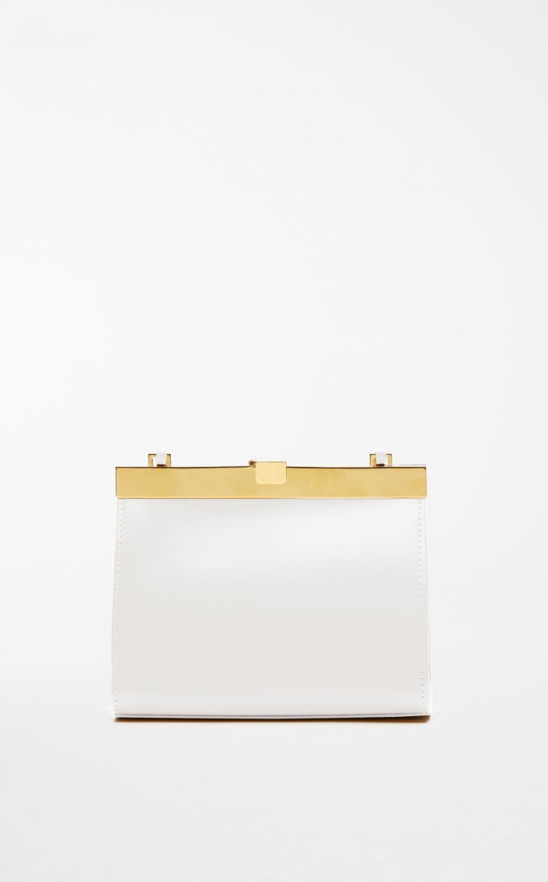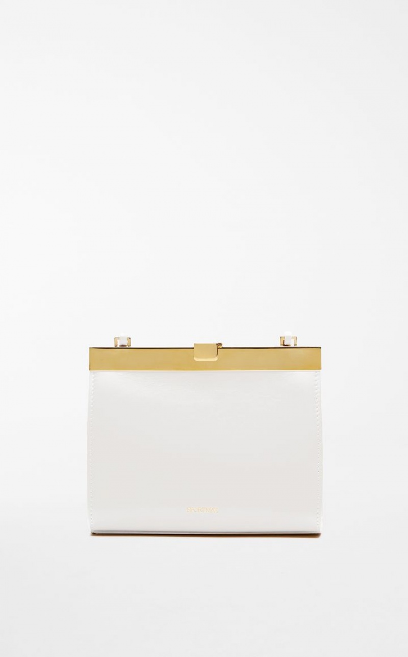 Calfskin mini clutch Lizzie bag. Geometric construction with colour matched, hand lacquered ribbing and gold coloured metal frame like the front printed logo. The lined interior is divided into two compartments with a centre zipped pocket. Adjustable strap so it can be worn two ways. Measurements: 19 x 15,5 x 8,5 cm.