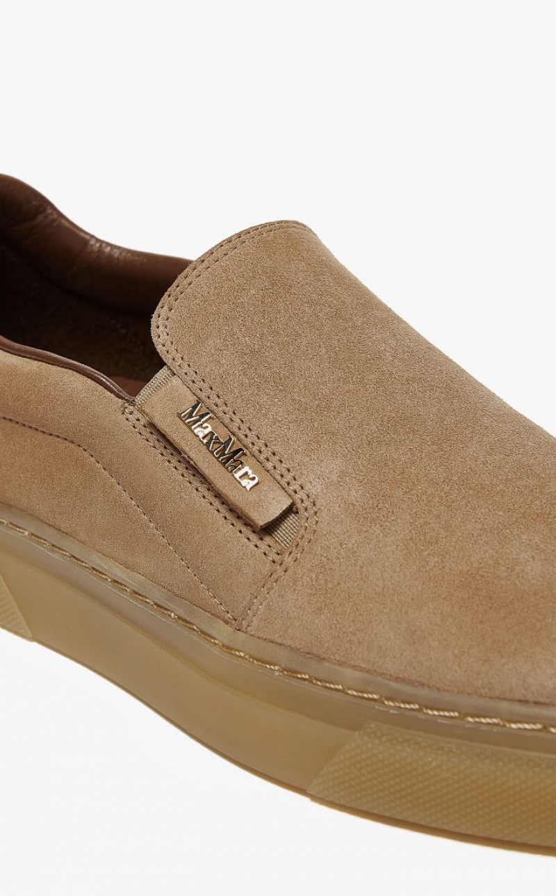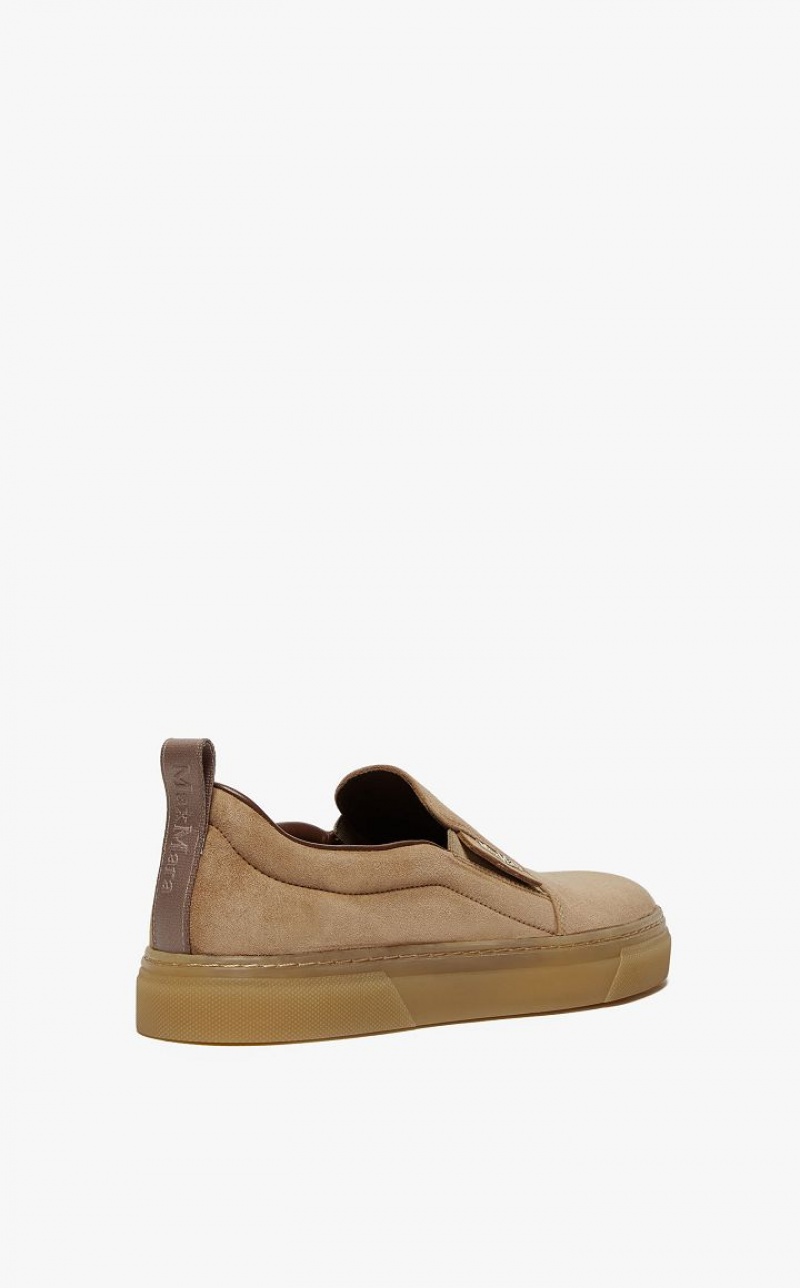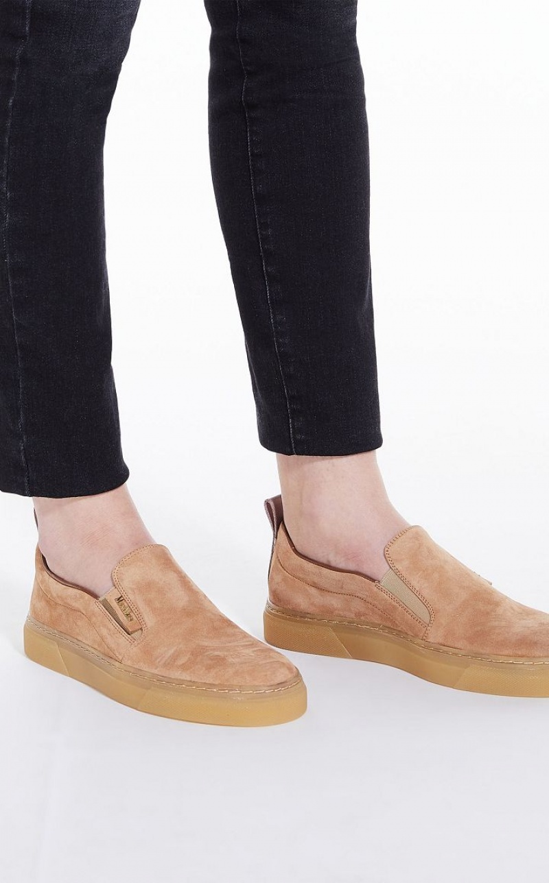 Slip-on trainers in suede, with a loop on the back to make them easier to put on and take off. Finished with small side elasticated inserts with leather labels with the Max Mara logo. The style is finished with a logo insole, nappa leather lining and rubber sole.