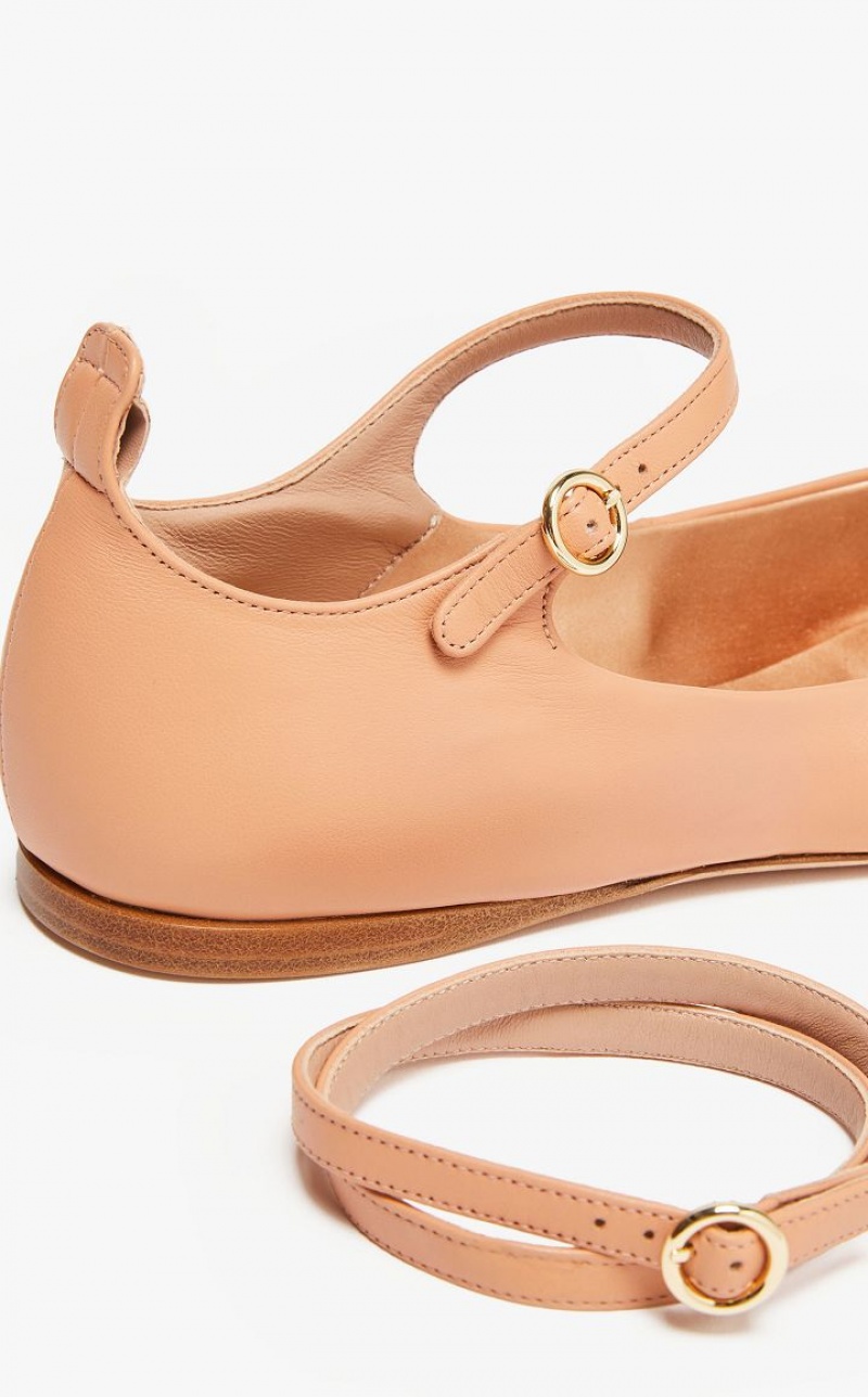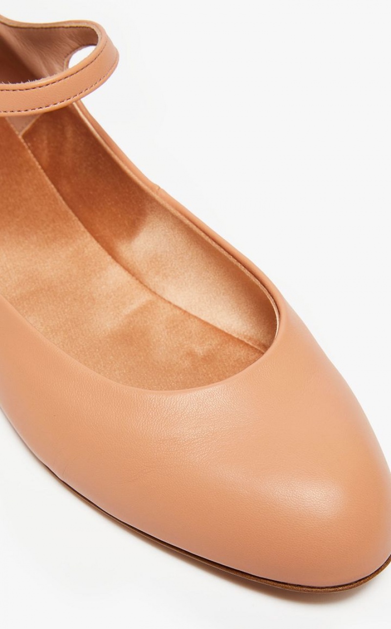Flat ballerinas made of soft semi-glossy nappa leather with a round toe and collar. The style features a strap on the instep and an adjustable double-wrap strap at the ankle. Extremely flexible and comfortable, featuring a lightly padded pure silk-satin lining and a pumice-leather sole with a heel and non-slip rubber insert.