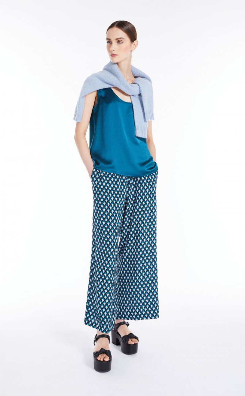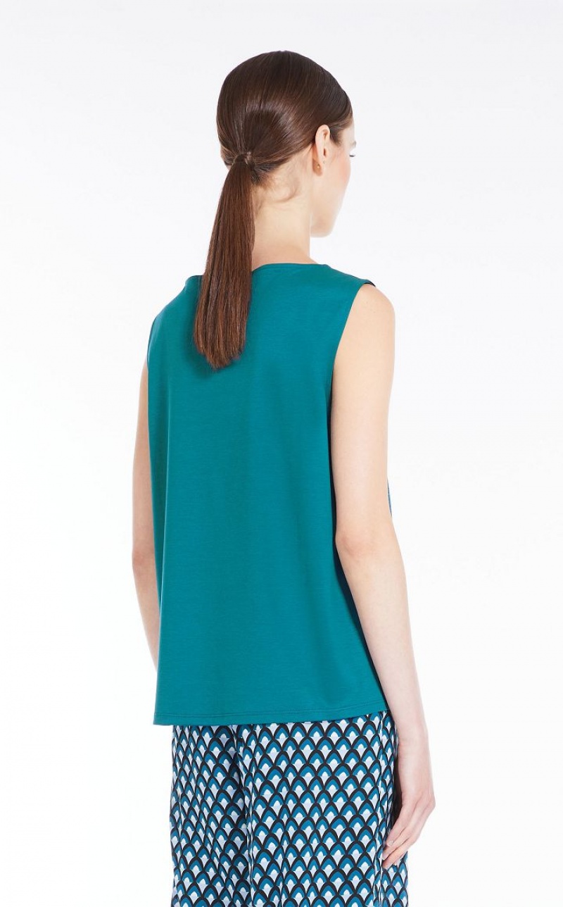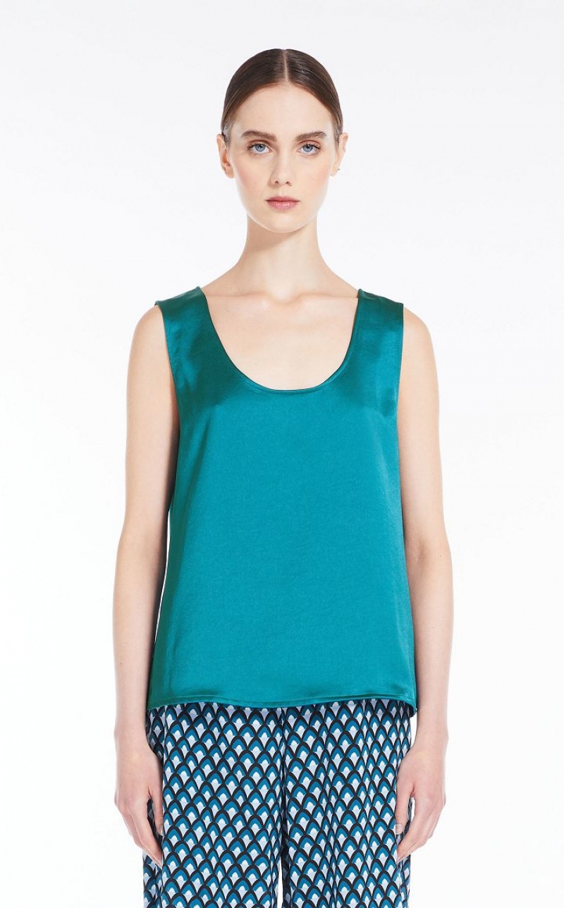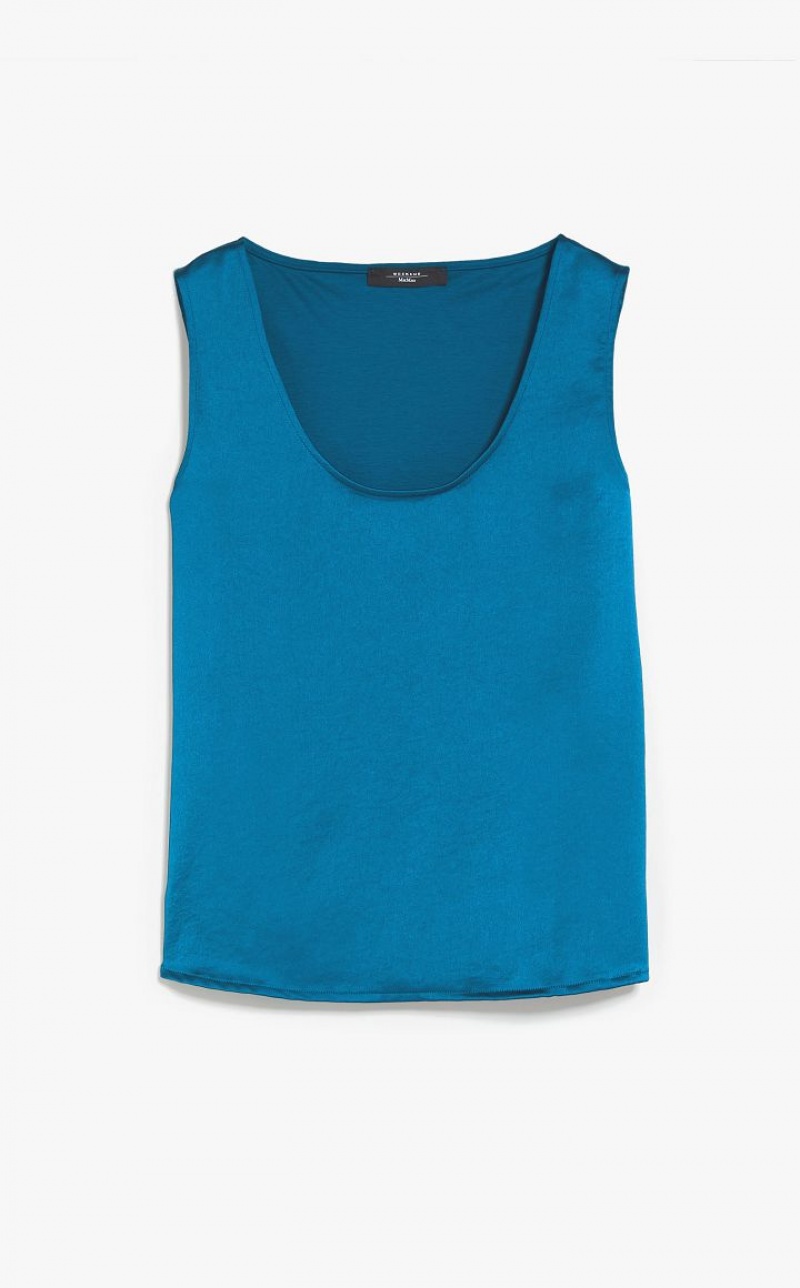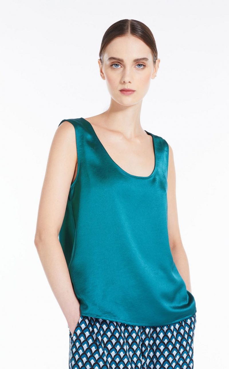 Sleeveless top with a straight, flowing line, in delicate washed technical satin on the front and soft modal cotton jersey on the back. Versatile and feminine style with wide shoulders and deep front neckline.