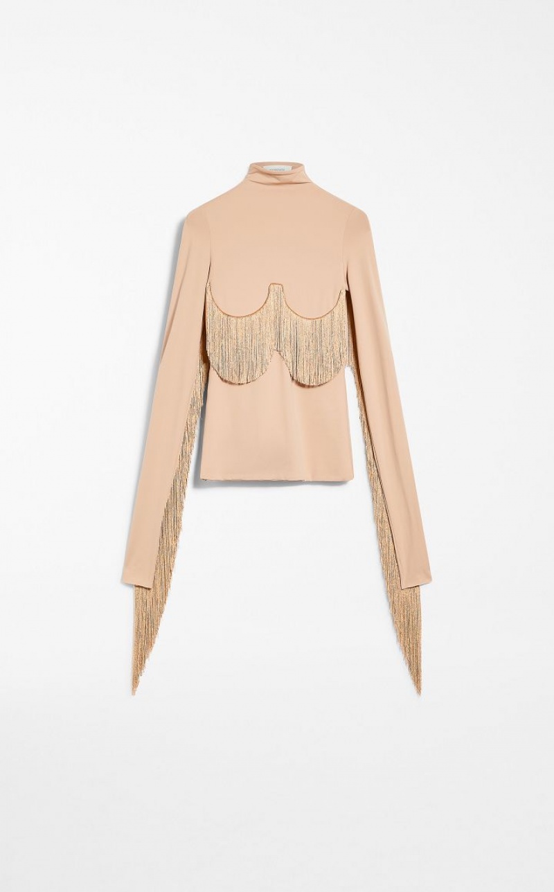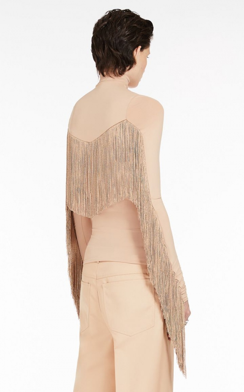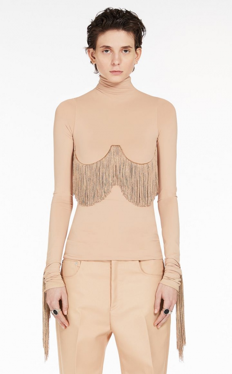 Feminine, slim-fit mock-polo neck sweater in technical Lycra fabric. The garment boasts tonal long fringes which find pride of place under the bust, along the sleeves and across the rear yoke