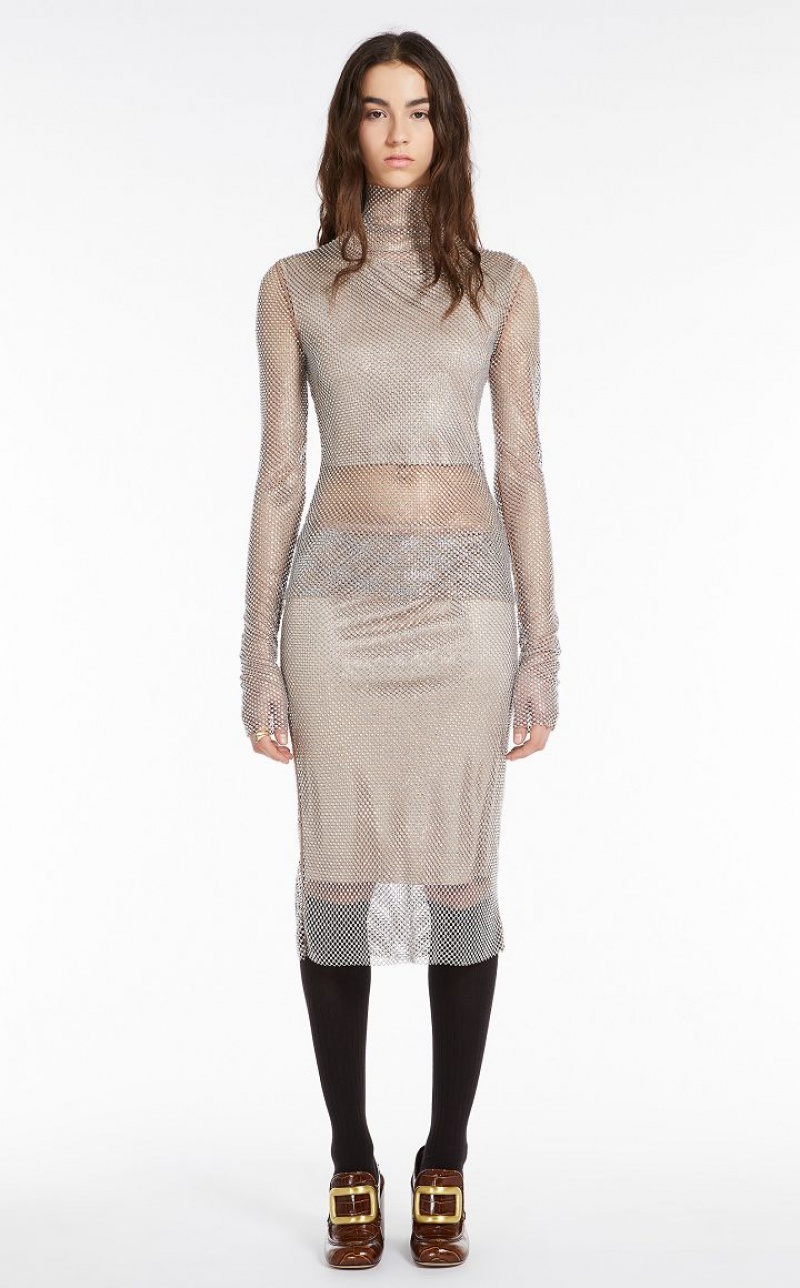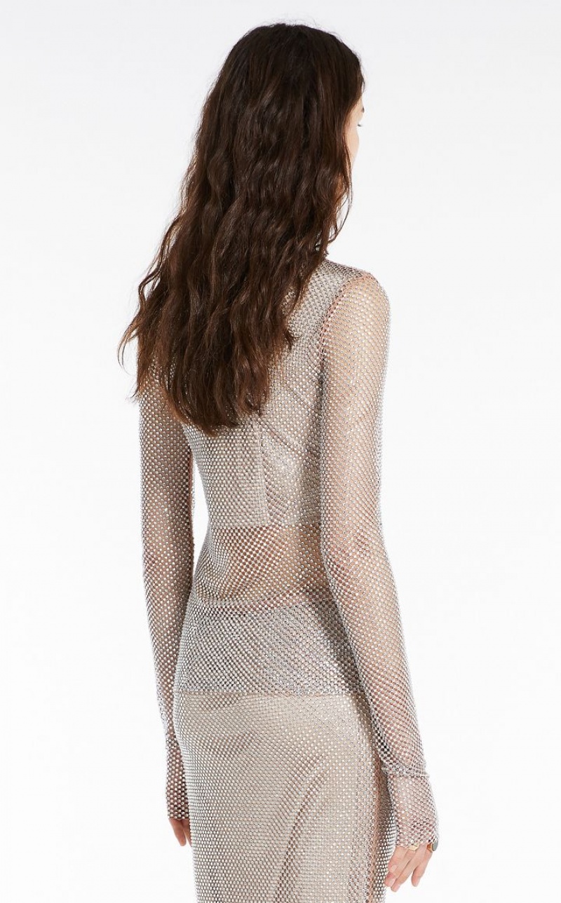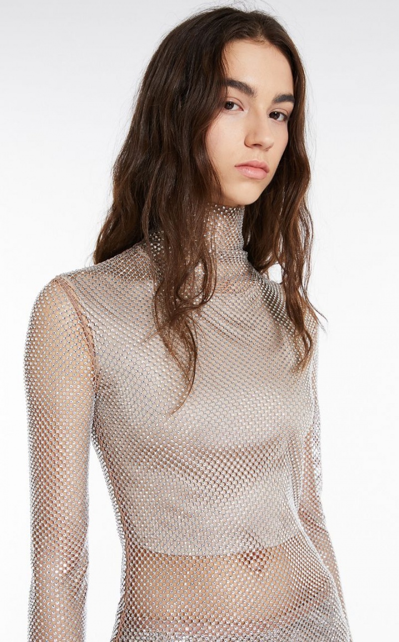 Technical mesh polo neck with rhinestones applied all over. Feminine figure-hugging fit, with a high neck and back zip with buttons making it easy to wear. Extra-long sleeves to be pulled up at the wrist. Garment completed by an opaque sleeveless top in fluid jersey.
