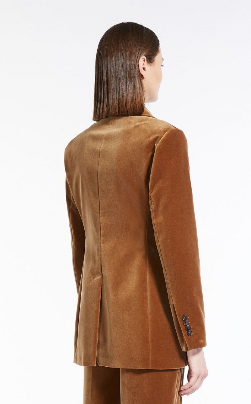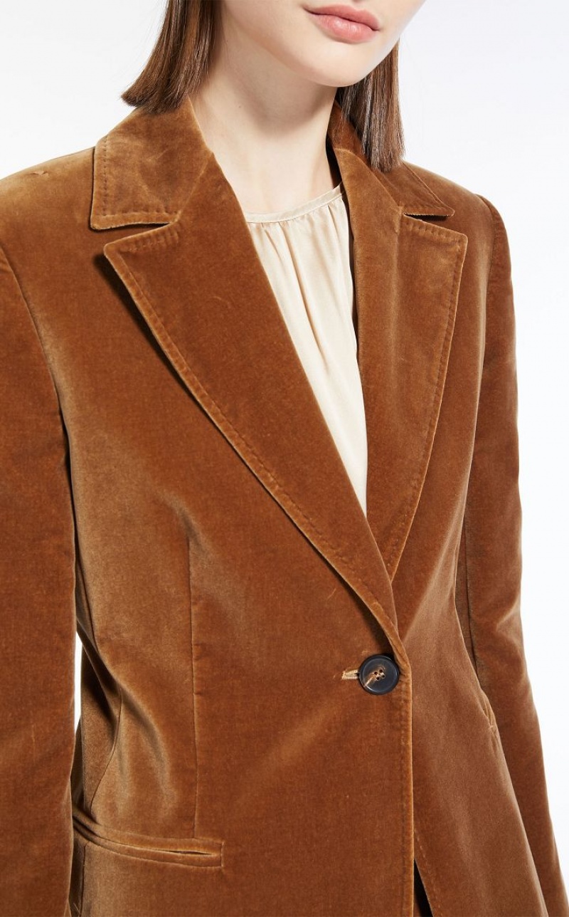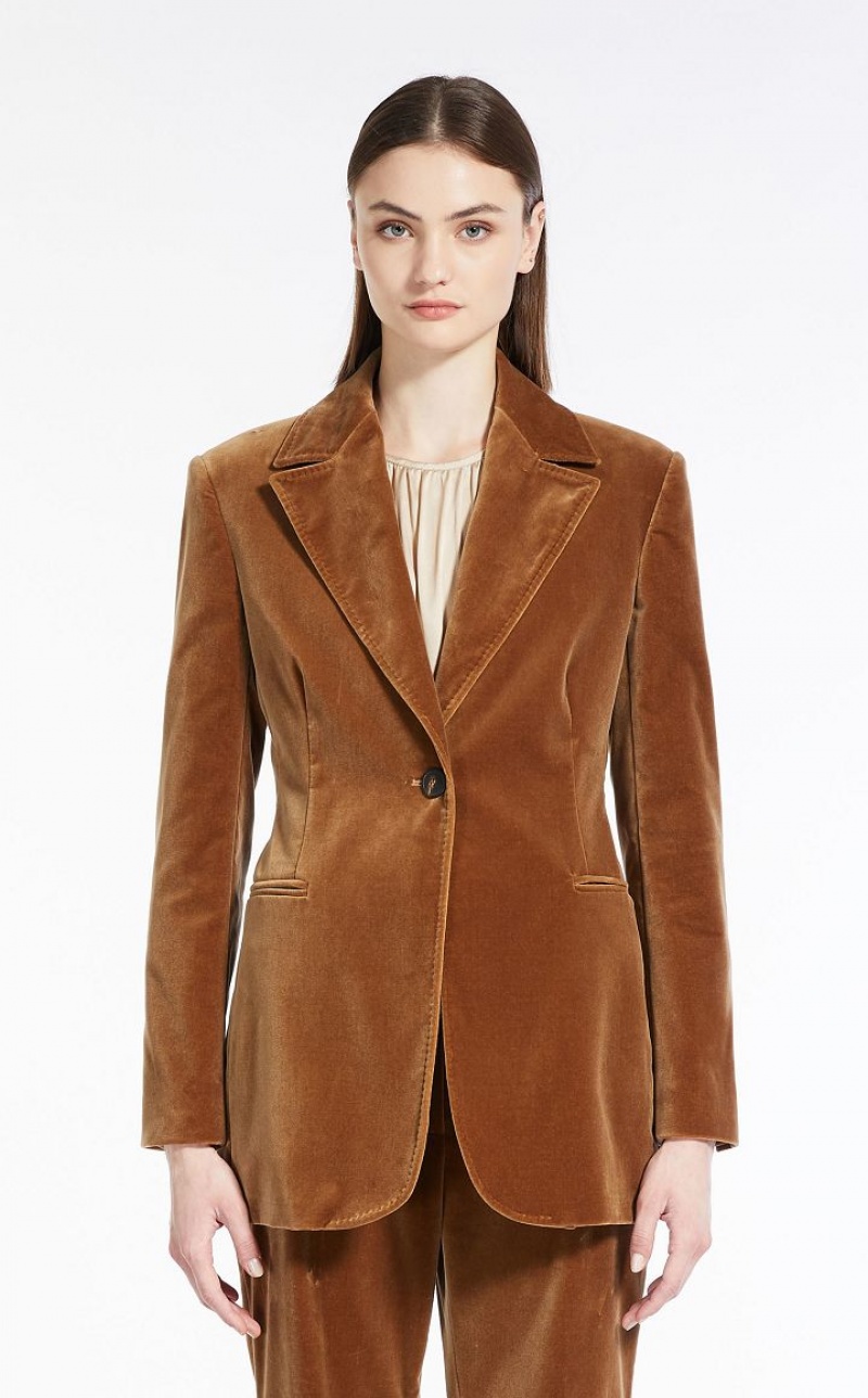 Single-breasted fitted blazer in cotton velvet with lapel collar, set-in sleeves, welt pockets on the front and central vent on the back. One-button closure. Length: 74 cm.