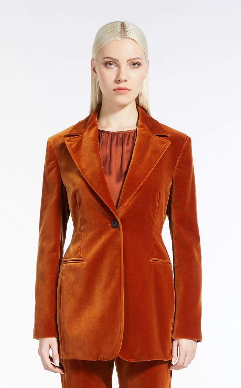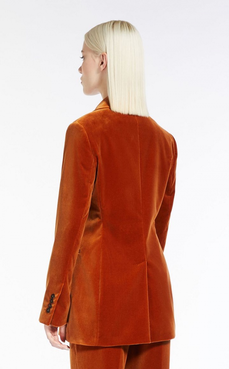 Single-breasted fitted blazer in cotton velvet with lapel collar, set-in sleeves, welt pockets on the front and central vent on the back. One-button closure. Length: 74 cm.