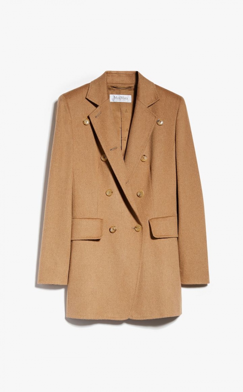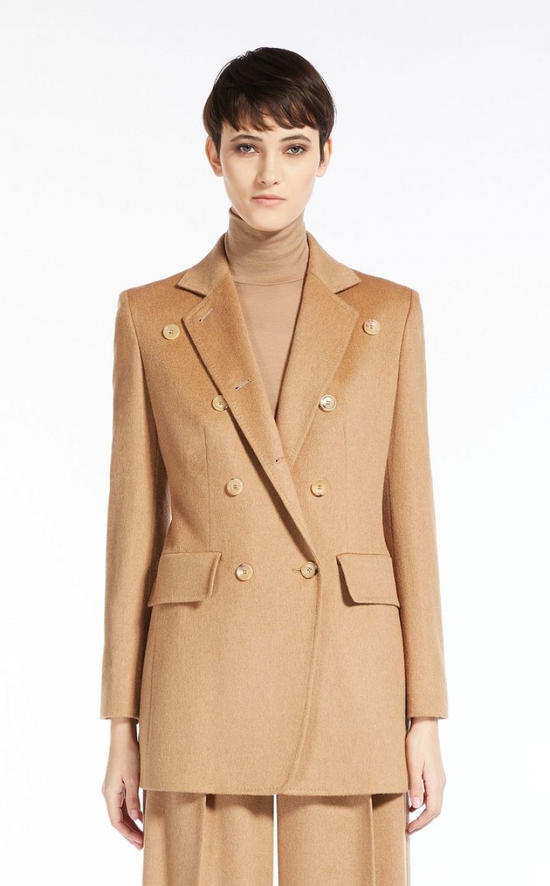 Double-breasted blazer in fine pure camel fabric, characterised by a close-fitting and feminine silhouette. The construction features a lapel collar, long fitted sleeves with small shoulder, front patch pockets with flap and double side vent on the back. Finished with jewel button on the cuffs and internal lining in monogram jacquard fabric. Horn button fastening. Length: 78 cm.