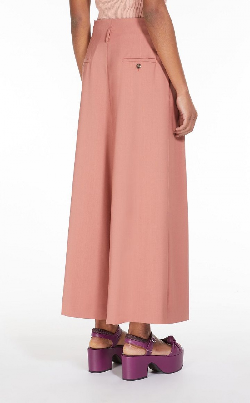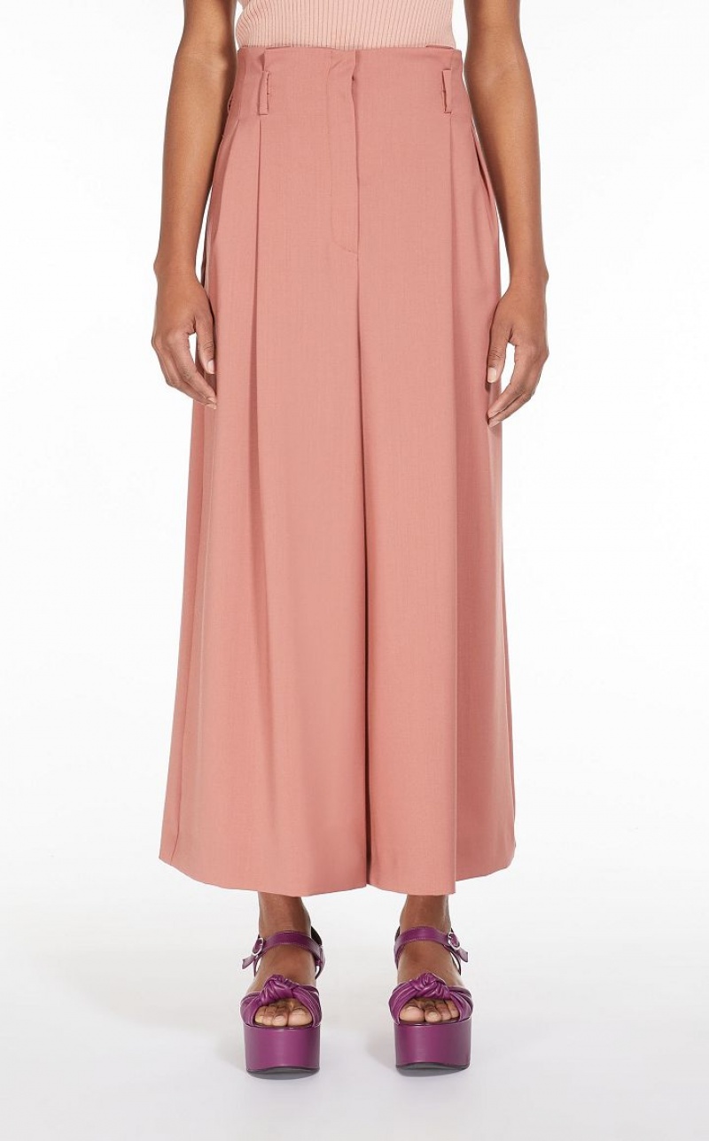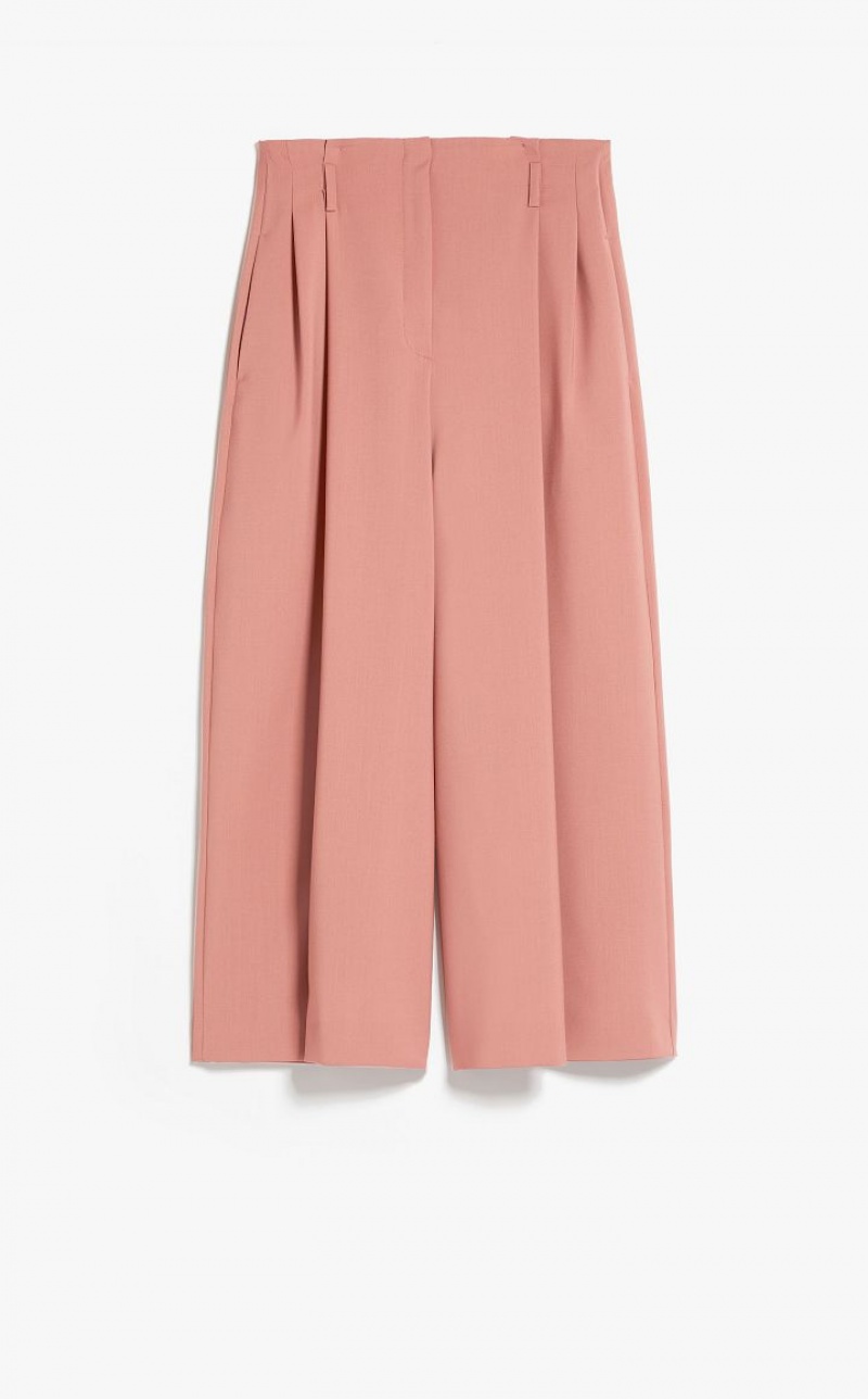 Cropped trousers with a flowing line in soft stretch pure wool fabric. This style has pleats on the front, slanted pockets on the sides and welt pockets with button on the back. Concealed fastening with small hook and zip. Length: 95 cm.
