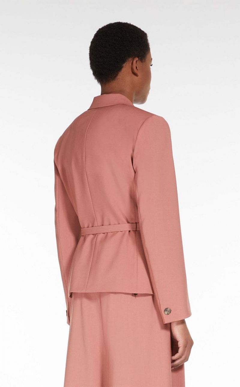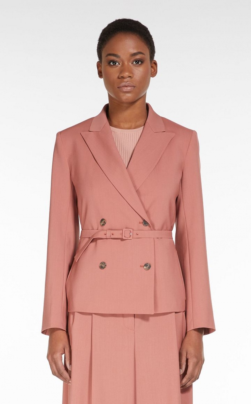 Double-breasted blazer in lightweight pure wool fabric, with natural stretch and a fitted line. Lined style, slim fit, with peak lapels, long sleeves and matching belt to accentuate the waist. Button fastening.
