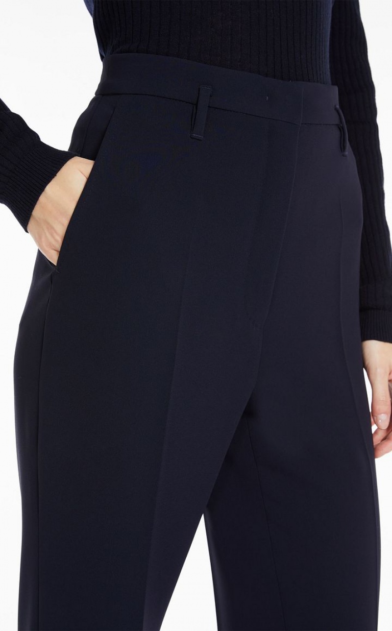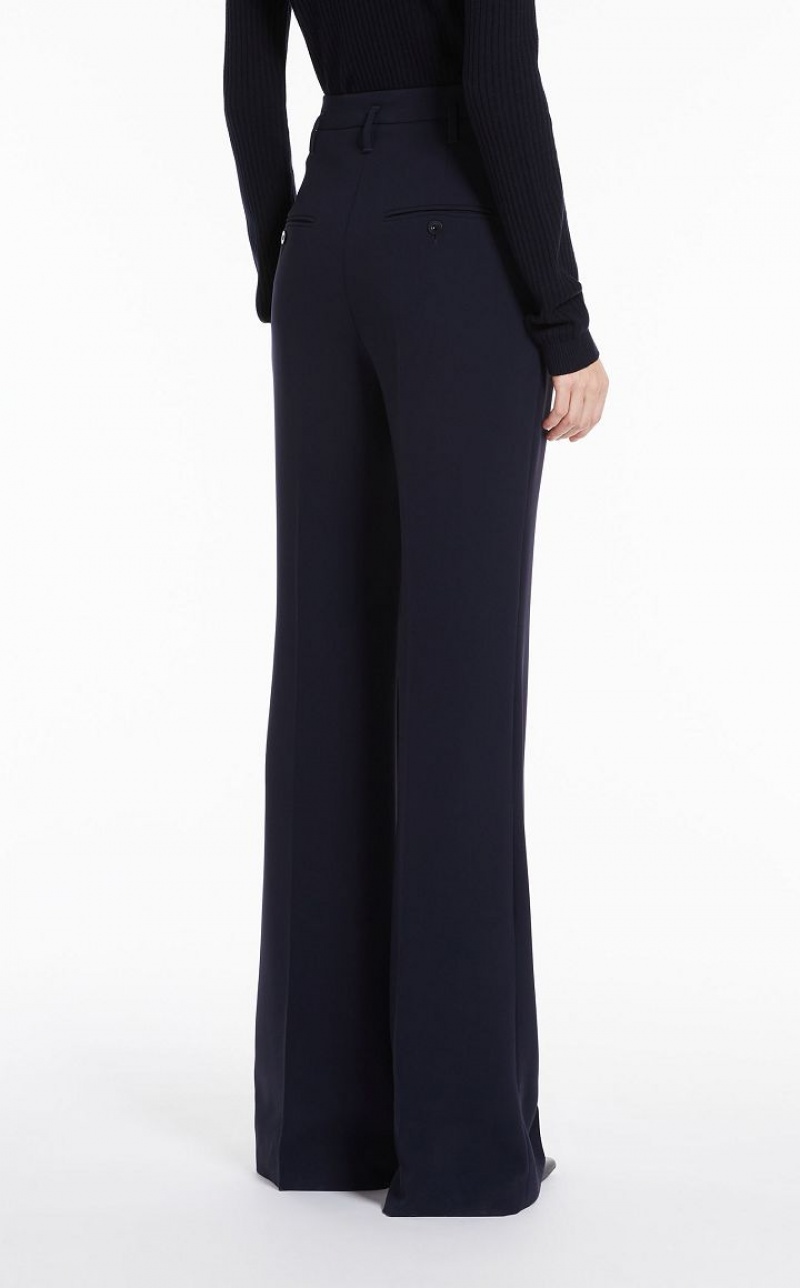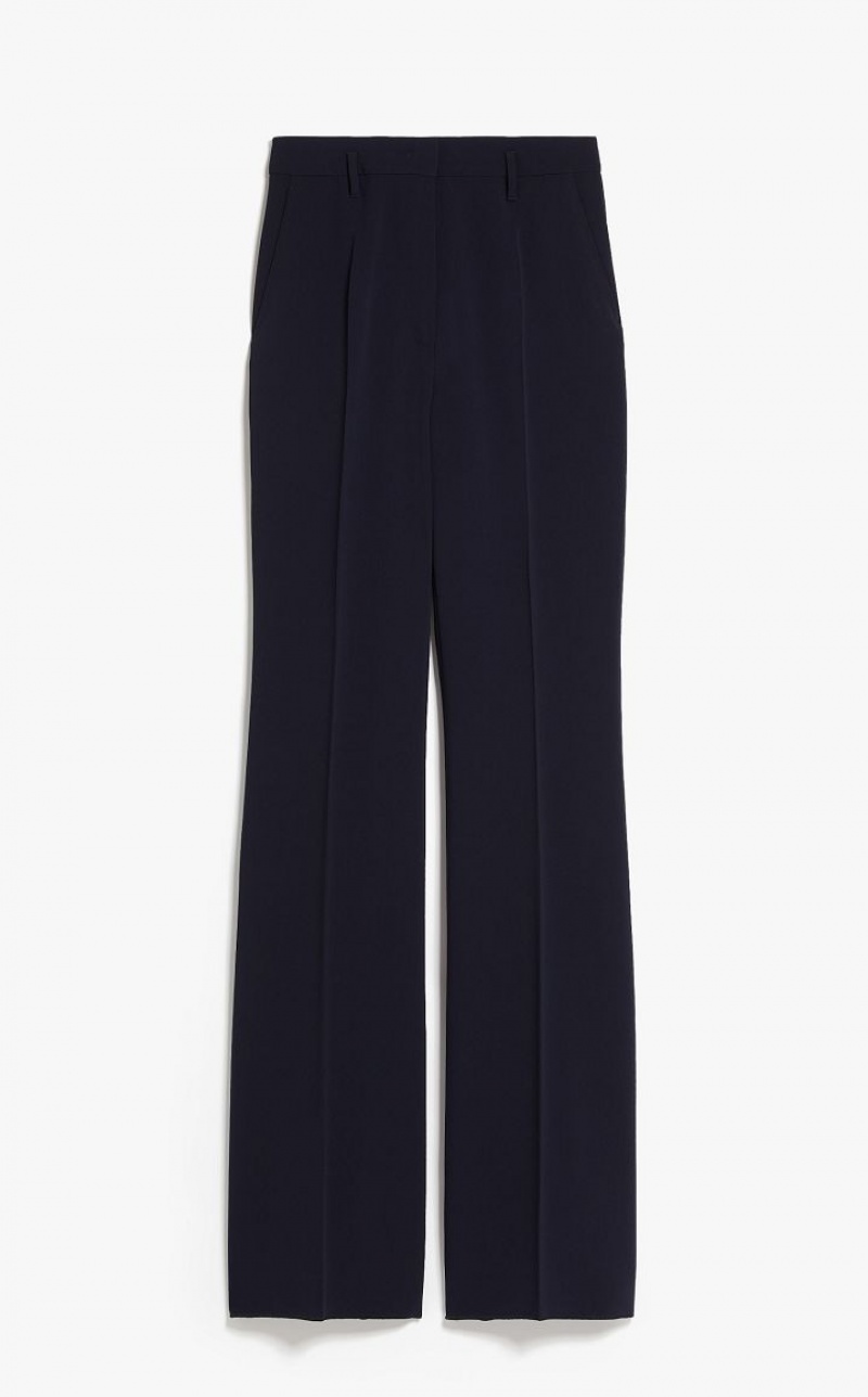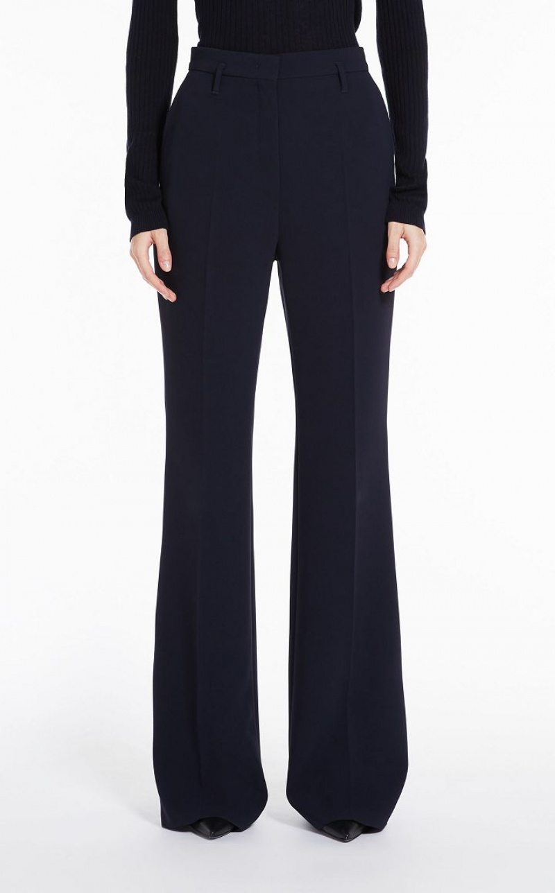 Flared trousers in technical cady fabric. The ‘70s-style model boasts bias-cut front pockets and double-welt rear pockets. Extended waist tab, complete with a placket-covered zip and hook-and-bar fastening. Length: 118 cm.