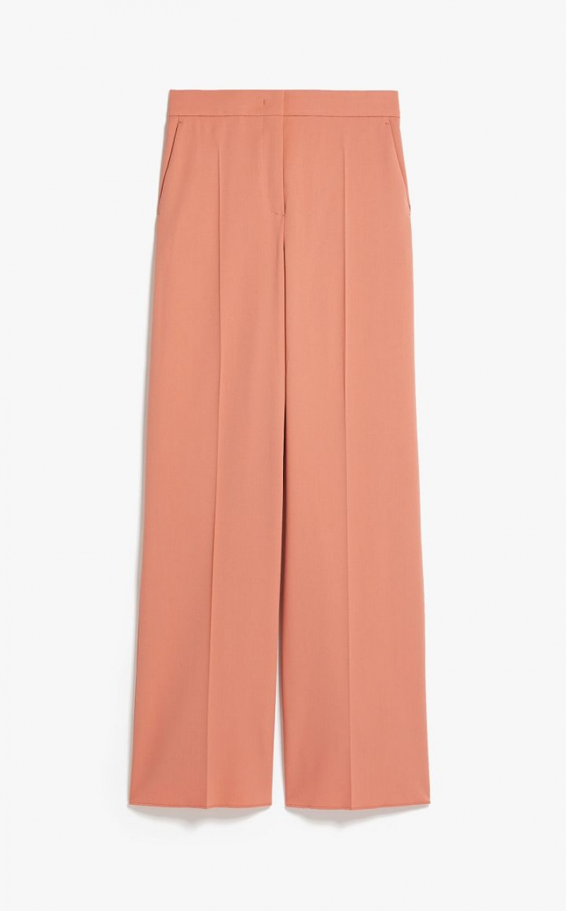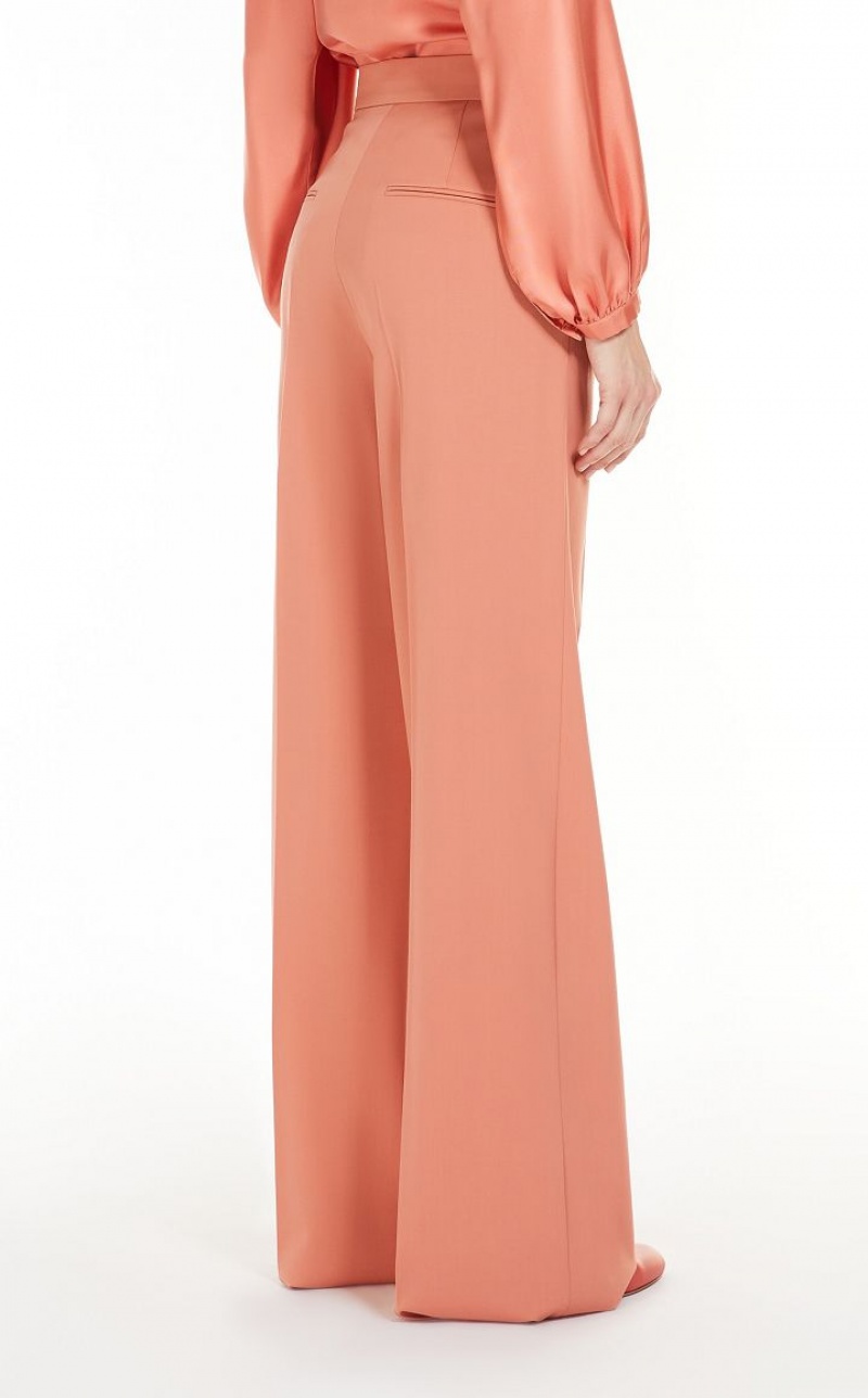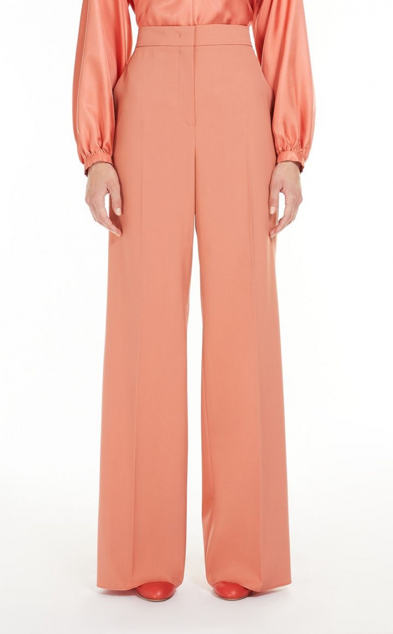 High-waisted trousers in exquisite stretch wool fabric. The tailored construction features a wide leg silhouette, slant pockets at the sides, welt pockets at the back, and a trouser crease. Fastening with wide waistband, flap with zip and small hook.