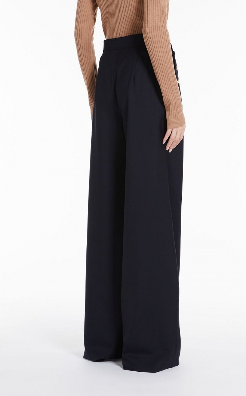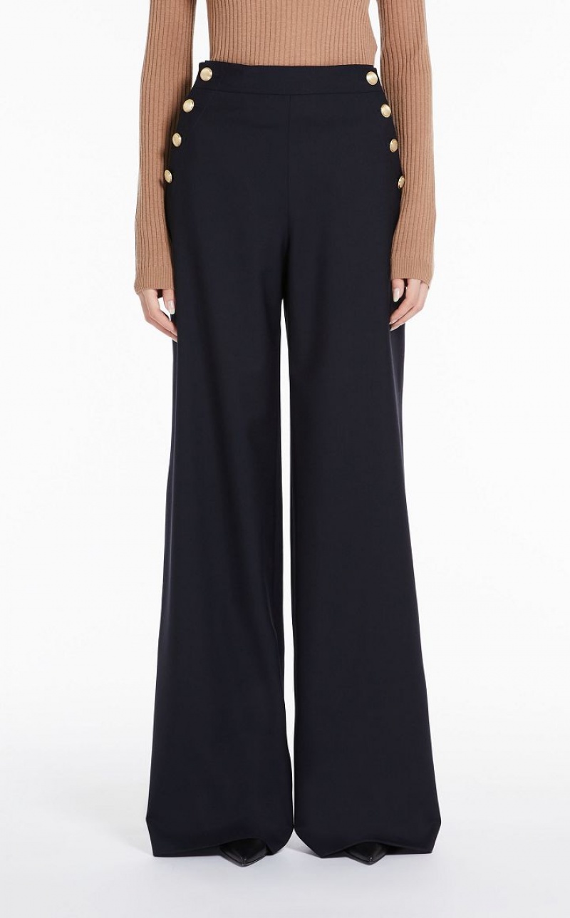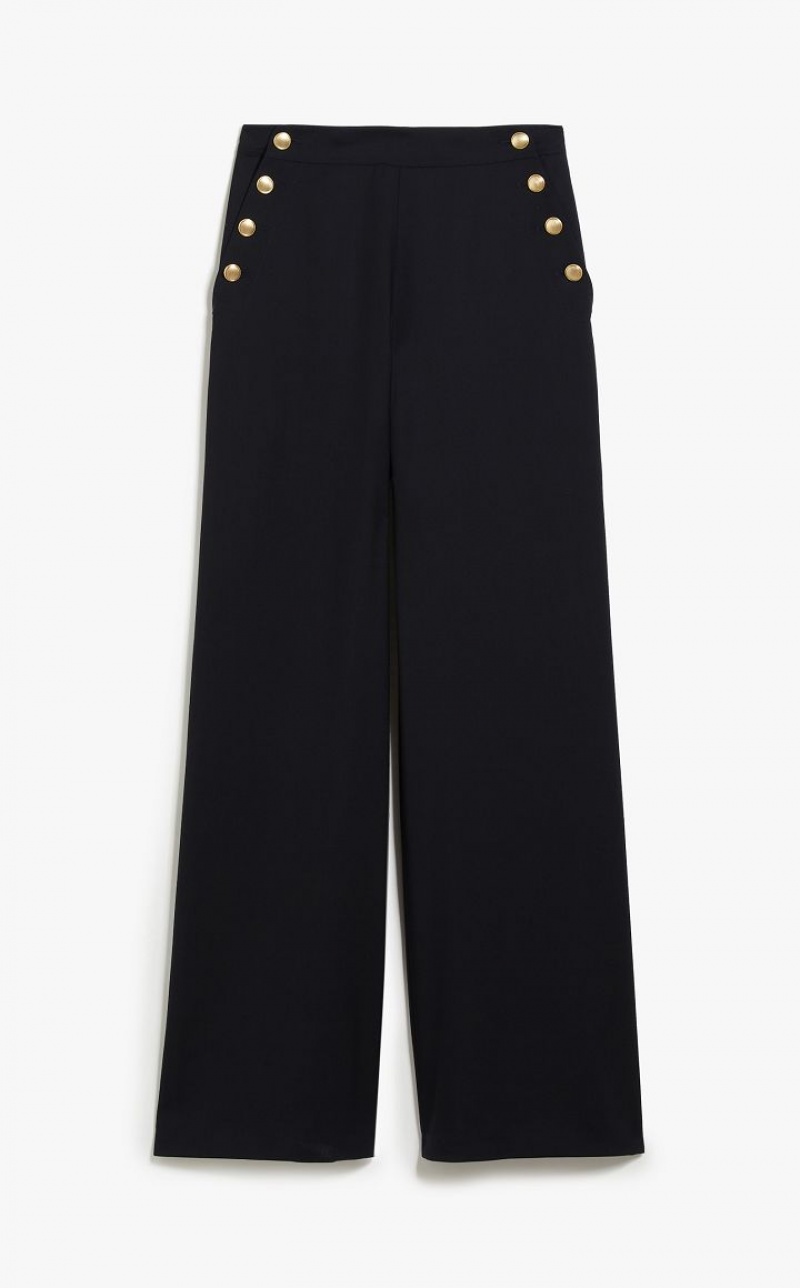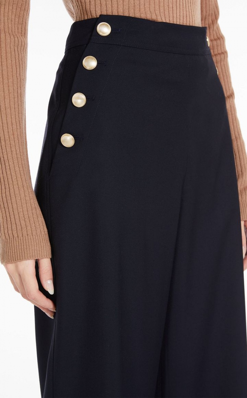 High-waisted palazzo trousers made of soft wool-blend gabardine. The straight, wide leg silhouette is embellished with marinière-inspired golden buttons on the sides, side pockets and a bandeau waist. Length: 118 cm.