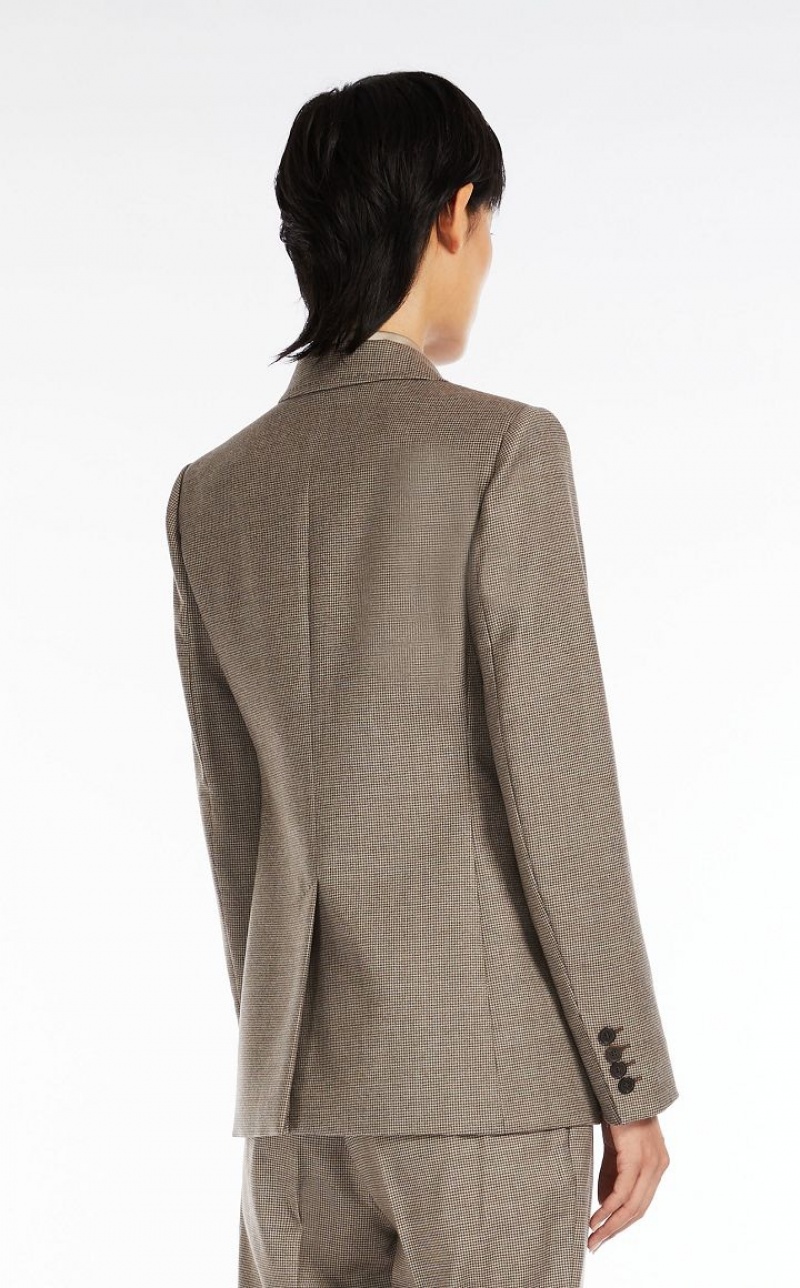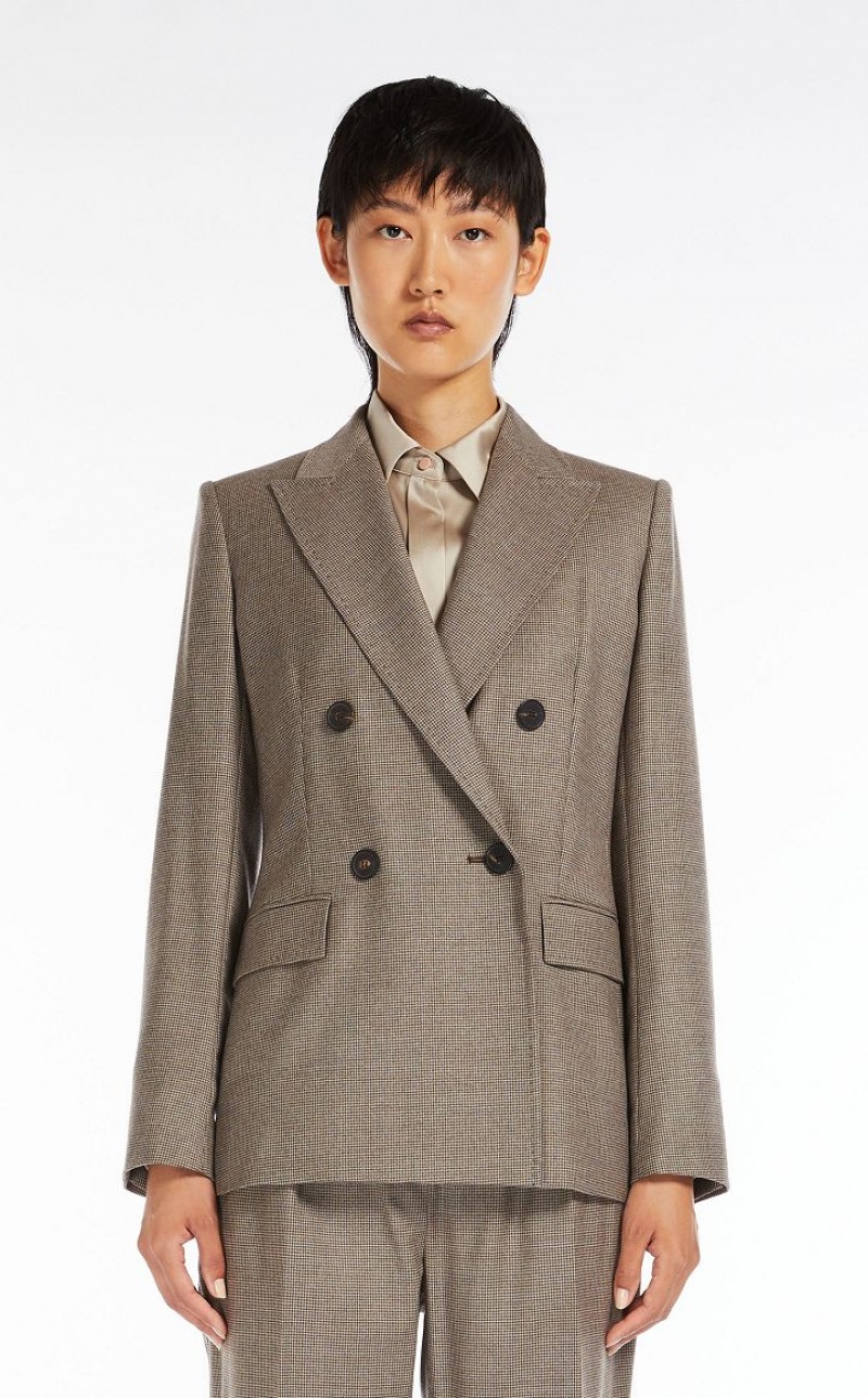 Double-breasted blazer in wool flannel, with a peak lapel collar, set-in sleeves and flap pockets on the front. Finished with a central slit at the back. Button fastening. Length: 68 cm.