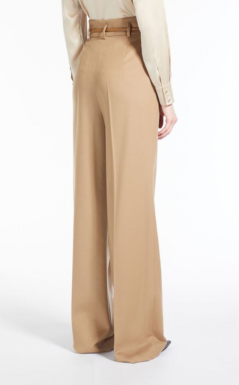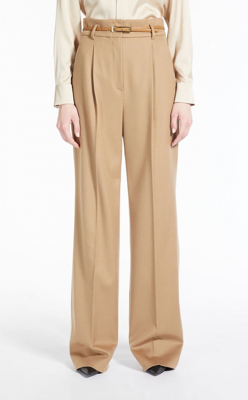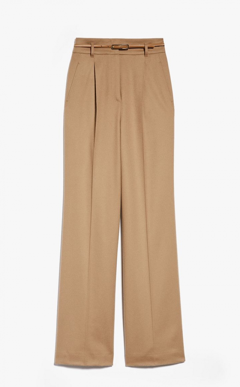 High-waisted trousers in pure wool fabric with pleats on the front, slant pockets on the sides and central trouser crease. The coordinated fabric belt enhances the waist. Fastening with high waistband tab, zip fly and small hook. Length: 118 cm.