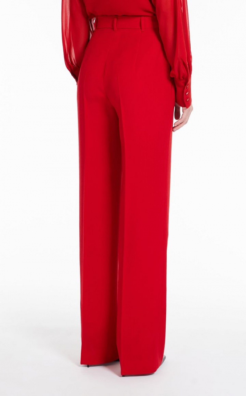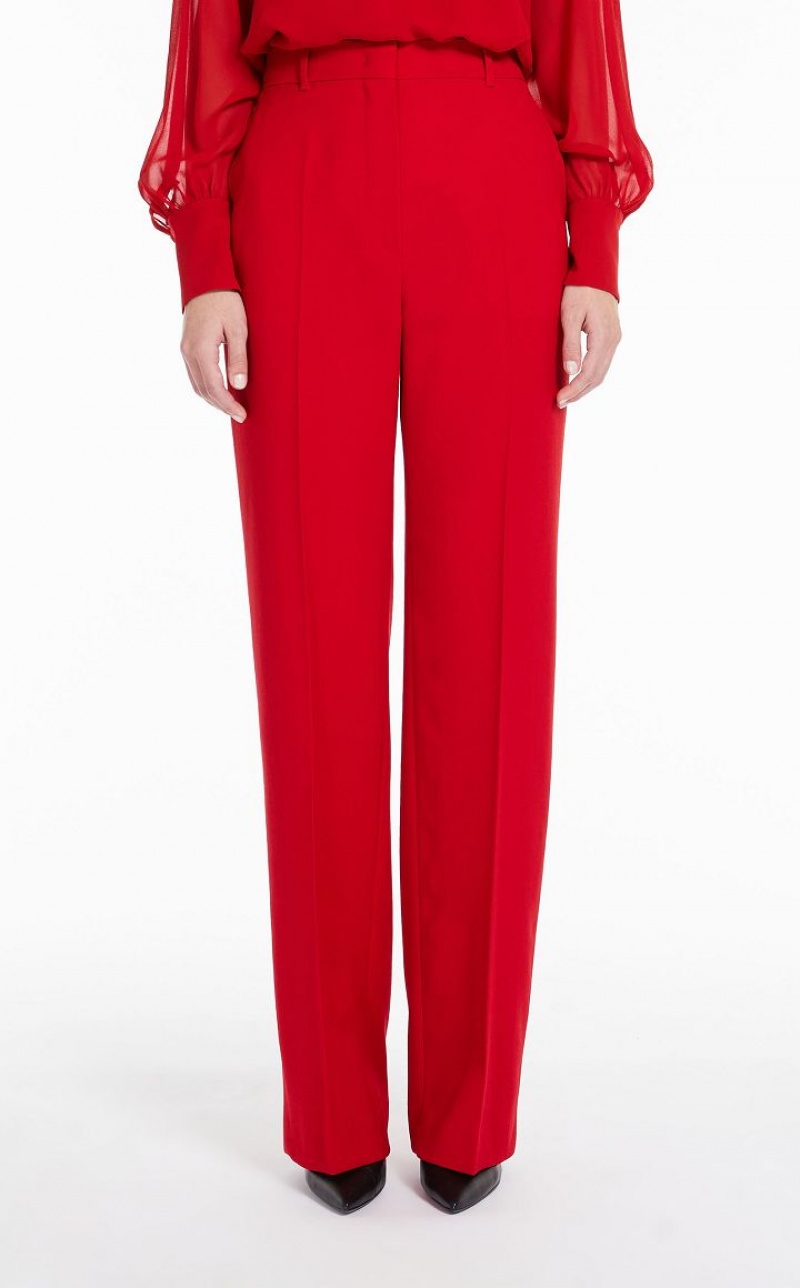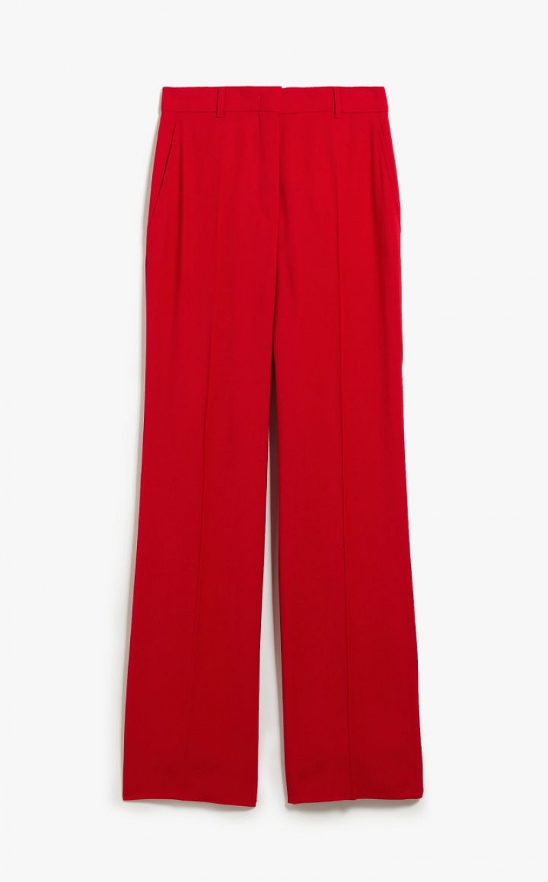 Straight-fit long trousers in ultra-soft pure wool satin crepe fabric. The model boasts belt loops at the waist and pressed pleat detail on the leg. Extended waist tab, complete with a placket-covered zip and hook-and-bar fastening. Length: 118 cm.