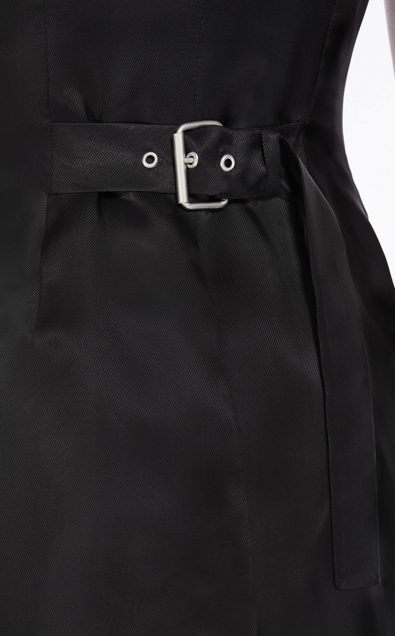 Long waistcoat made of a natural stretch pure-wool plain-weave fabric on the front and viscose blend fabric on the back. The style is inspired by menswear classics, with tailored details such as the slanted breast pocket, flap pockets on the sides, and strap on the back with a buckle and metal eyelets. Darts enhance the fitted and feminine silhouette. Detail of lined shoulder straps visible above the shoulder. Above-the-knee length.