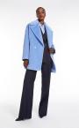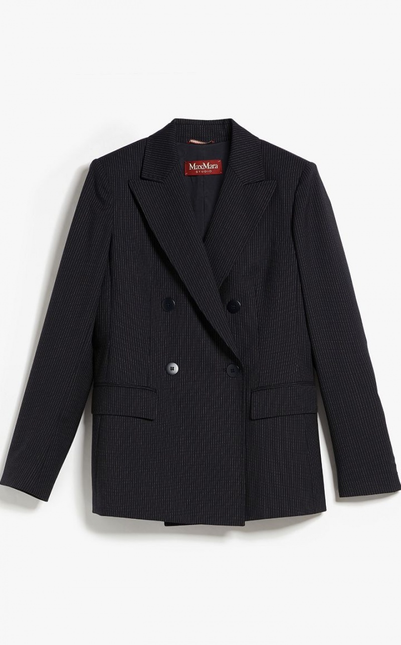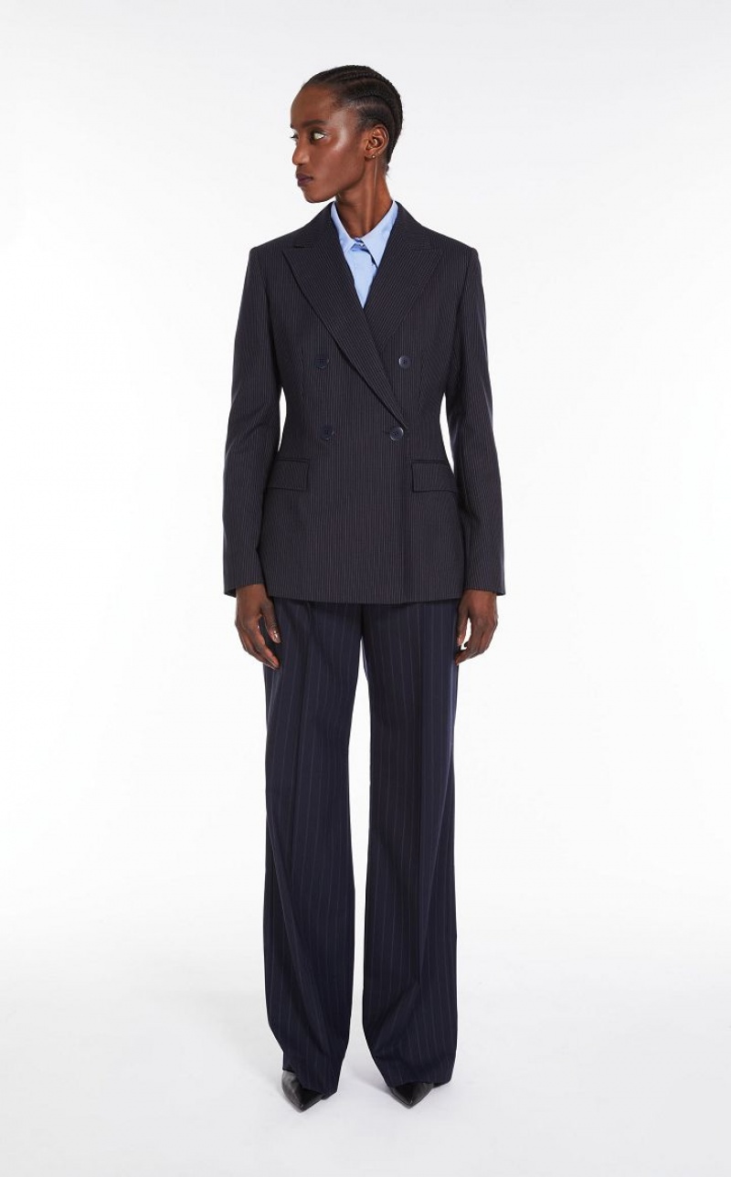 Double-breasted long blazer in boyfriend-style pinstripe wool-blend gabardine fabric. The model boasts a peak-lapel collar, long set-in sleeves and flap pockets. Lined model. Button fastening. Length: 68 cm.