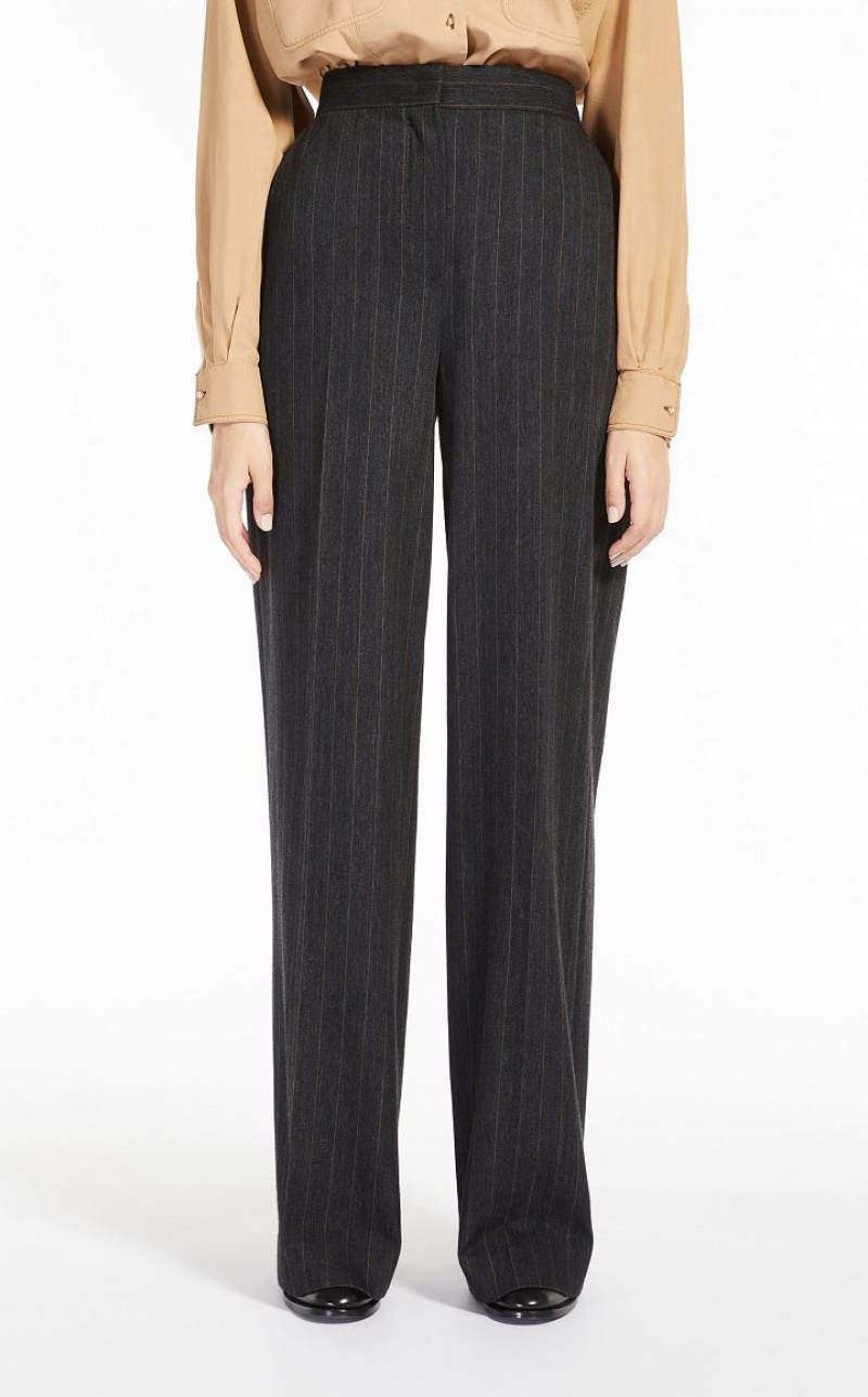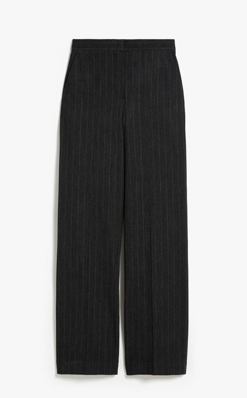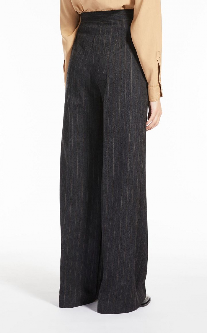 Palazzo trousers made of soft stretch cotton and wool jersey with a pinstriped denim effect texture. Wide leg style finished with trouser crease and slant pockets on the sides. Fastening with wide waistband, flap with zip and small hook.