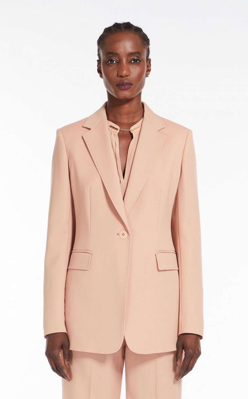 Slim-fit single-breasted jacket in fine pure wool fabric. The feminine-fit model boasts long set-in sleeves and flap-adorned pockets. It also features tailored stitching along the fastening and lapel collar. Lined model. One-button fastening. Length: 70 cm.