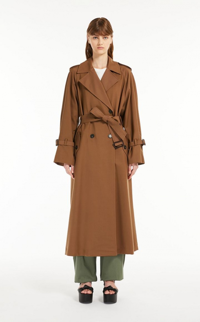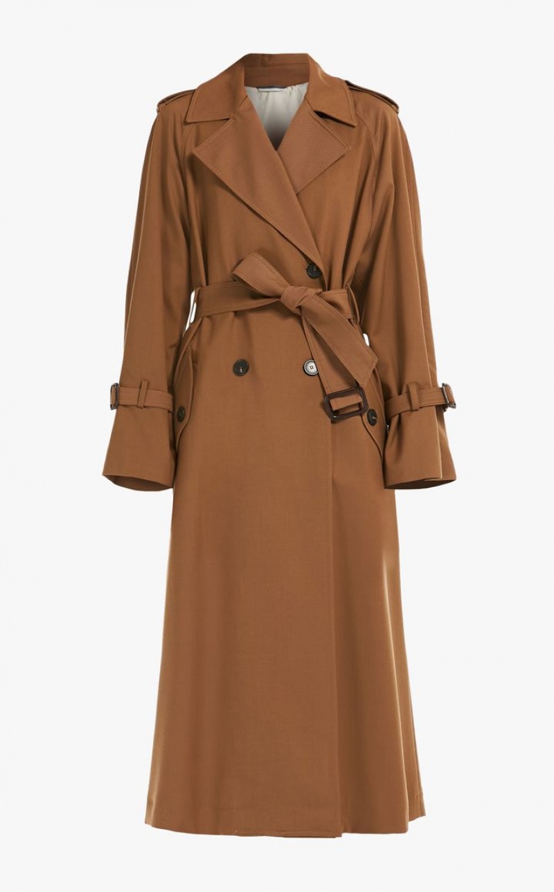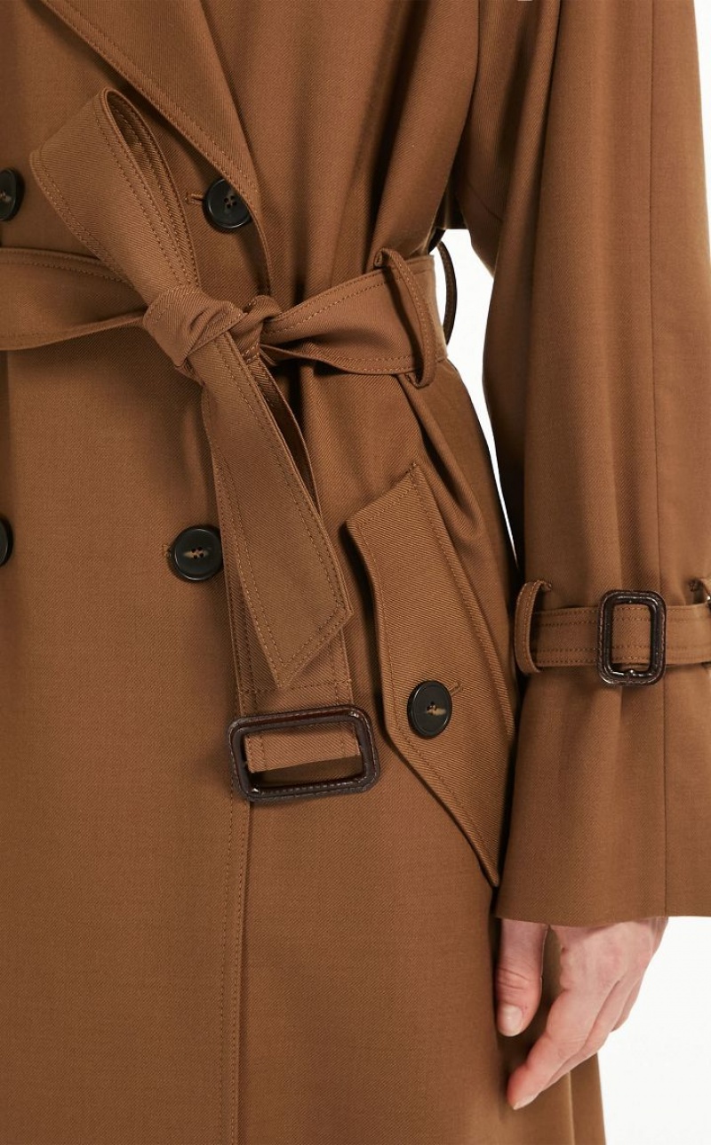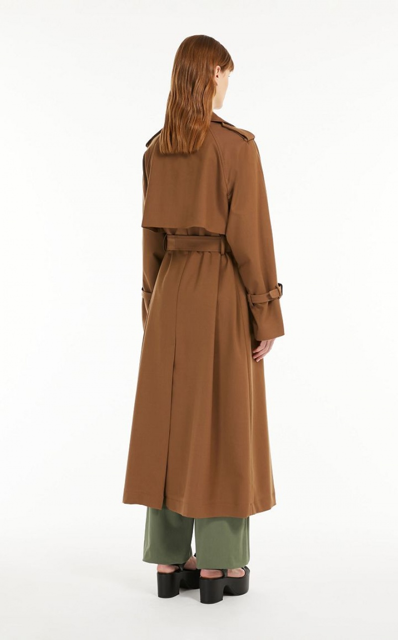 Double-breasted trench coat in showerproof fabric. This style features a flared silhouette with a matching belt to define the waistline. The classic construction features a lapel collar, long raglan sleeves with tabs at the cuffs, and slanted pockets with flap and button. Also features a showerproof cape on the back. Button fastening.